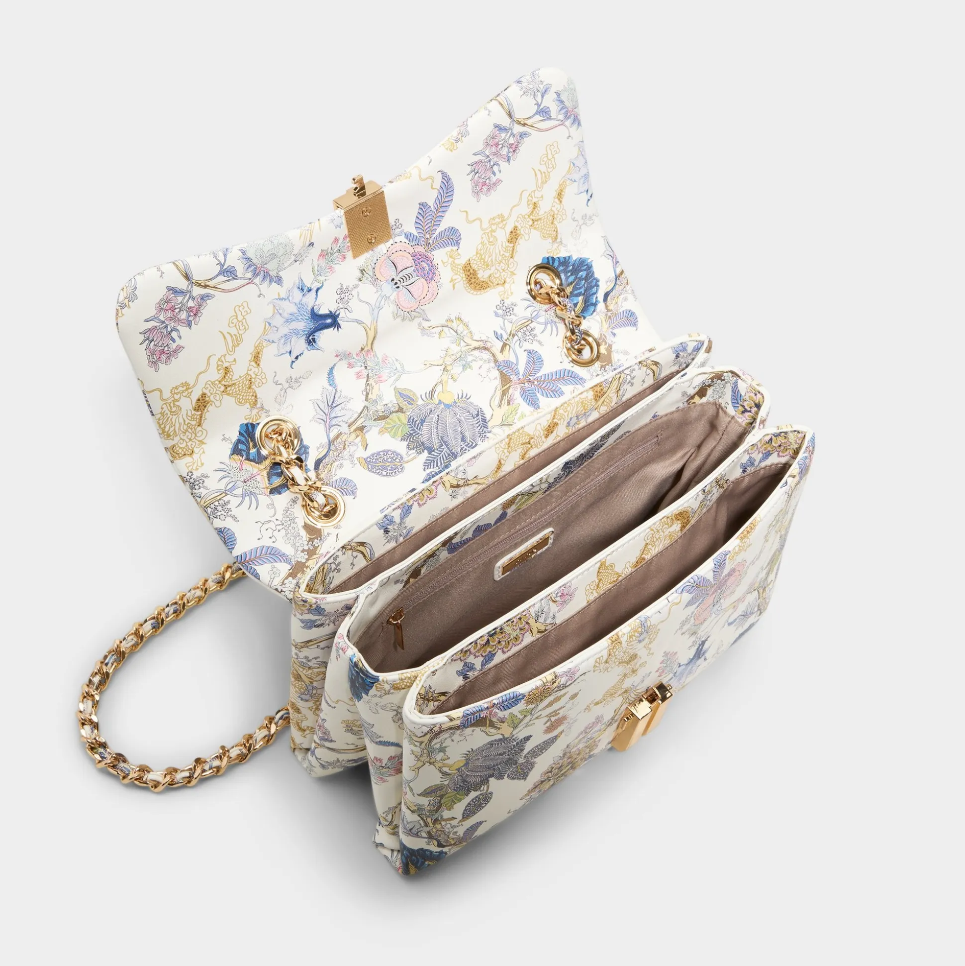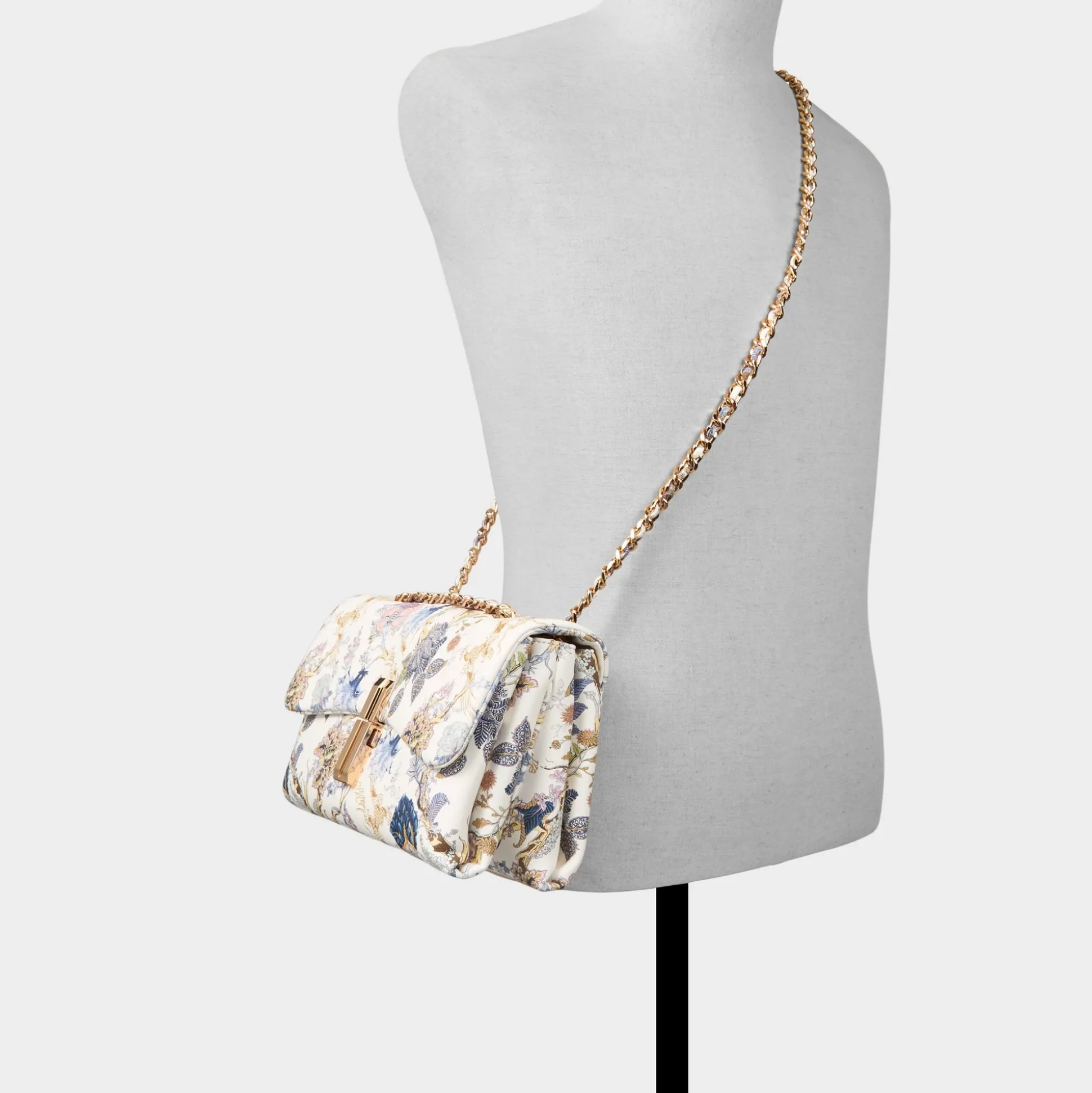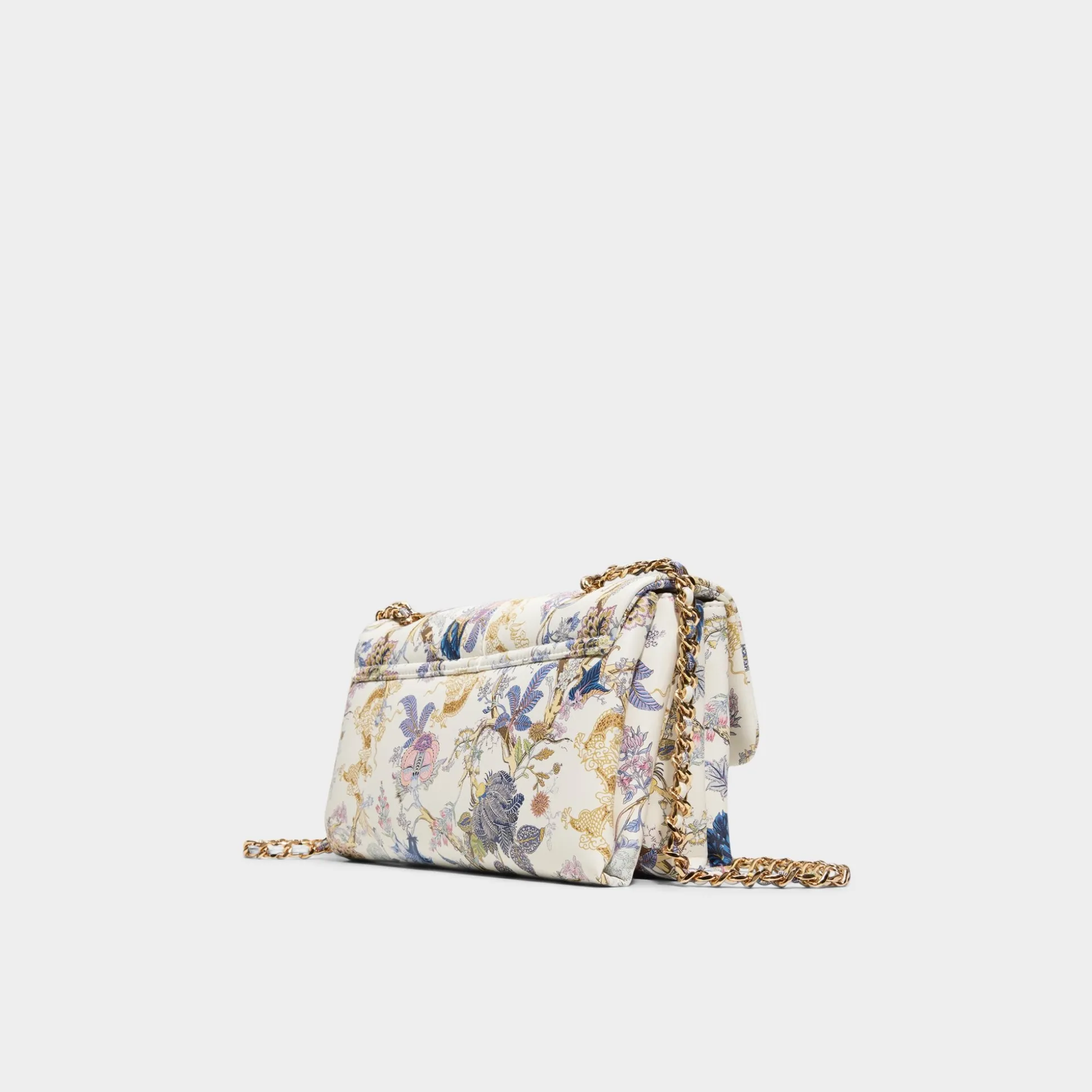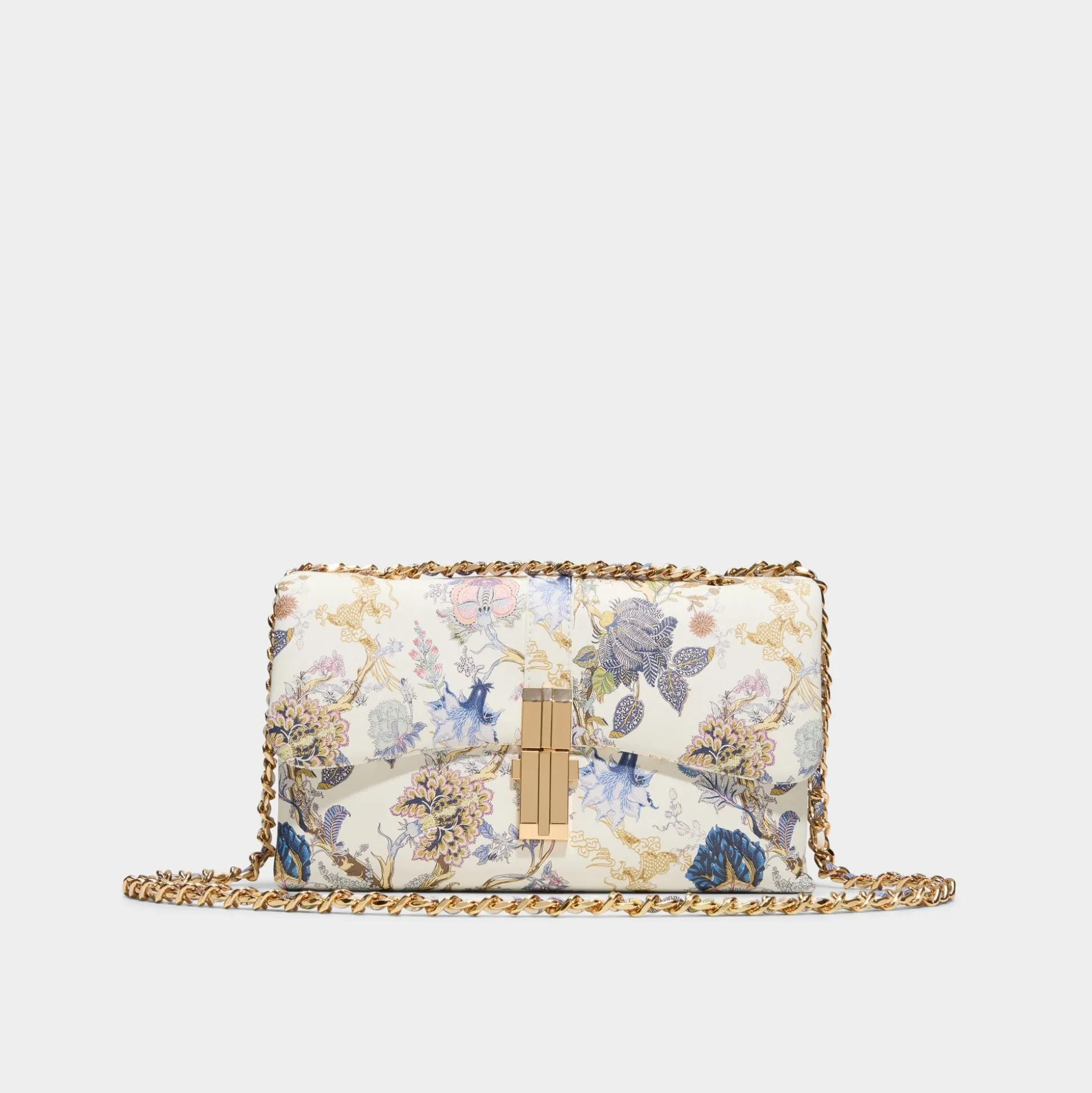 Storybook florals weave across this rectangular crossbody, framed by gleaming gold-tone edging and a push-lock clasp that hints at quiet glamour, turning everyday errands into a little moment of whimsy. Sling it with linen midi dresses for garden brunches or tuck it against a slip for rooftop soirées, finishing looks with a touch of polished charm.