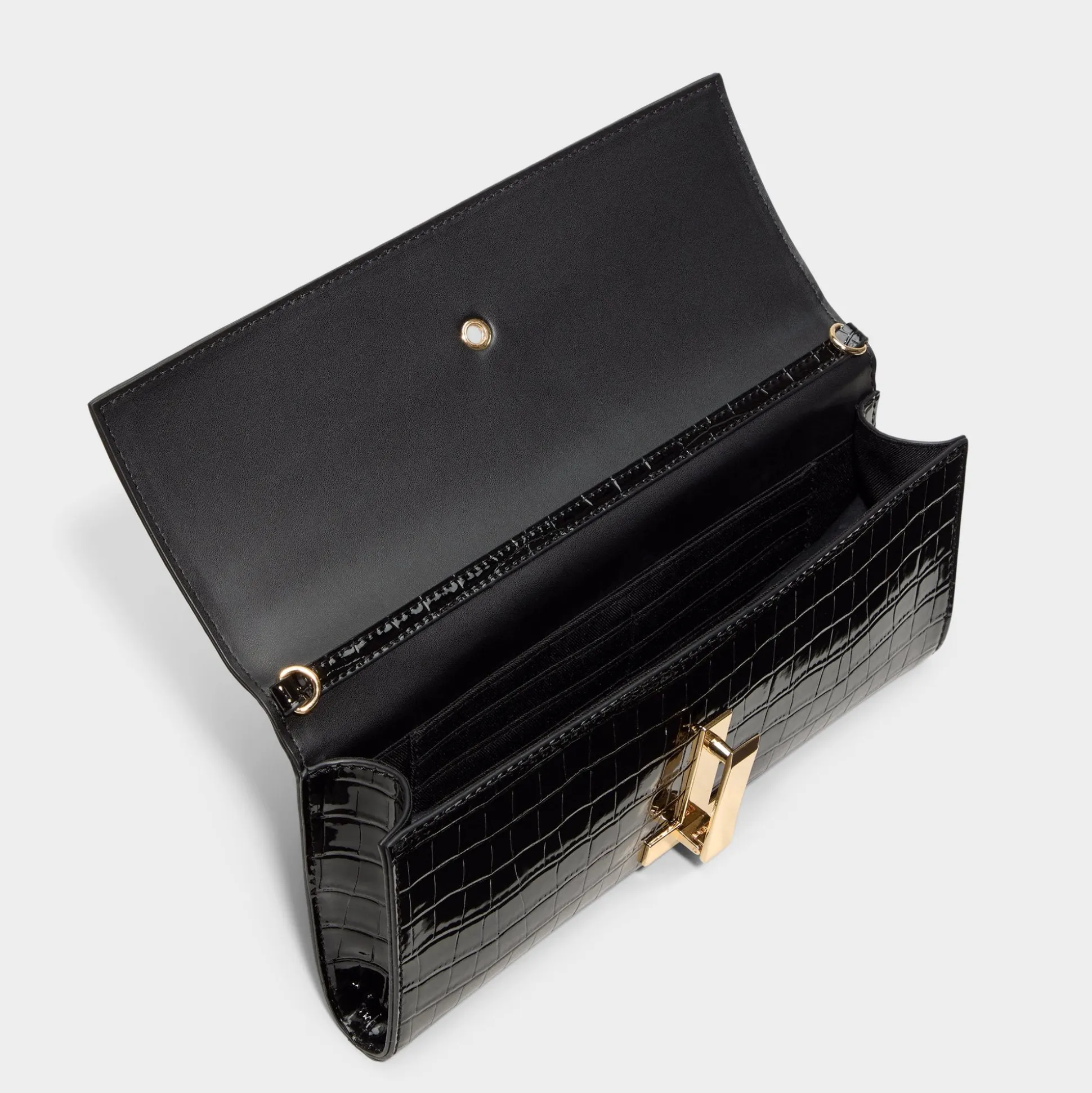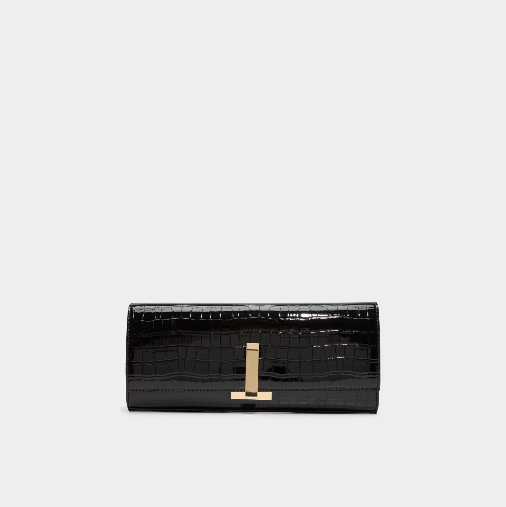 Glossy croc-embossed patent wraps a tube clutch, while a sculptural T-bar closure snaps shut with a satisfying click, spotlighting a chic lip-gloss moment beneath satin slips and elevating every formal moment. Carry it to formal dinners or pair with high-waist trousers for rooftop soirées, finishing looks with a confident, glossy polish.
