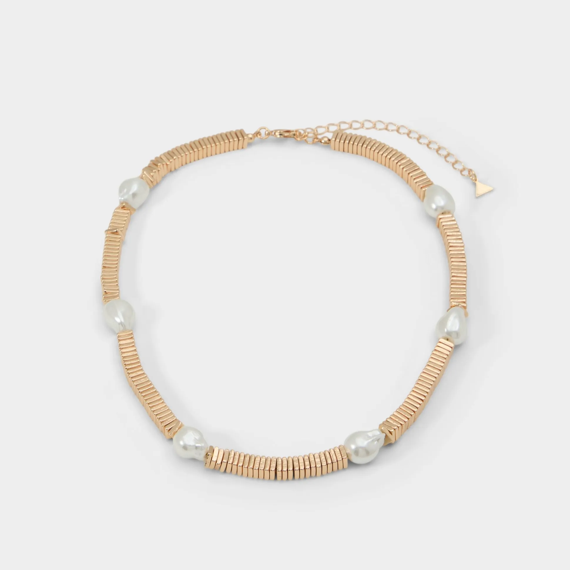 Molten-look faux pearls punctuate rows of tightly stacked gold heishi beads, creating a sleek, collar-grazing necklace that hugs the neckline with subtle shimmer and easy lobster-clasp adjustability. Layer it with a longer pendant over a satin cami for date nights, or frame a crisp button-up and blazer at office presentations for polish.