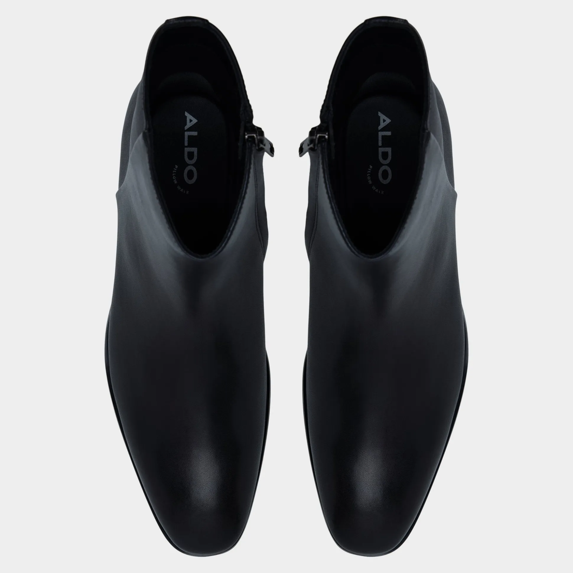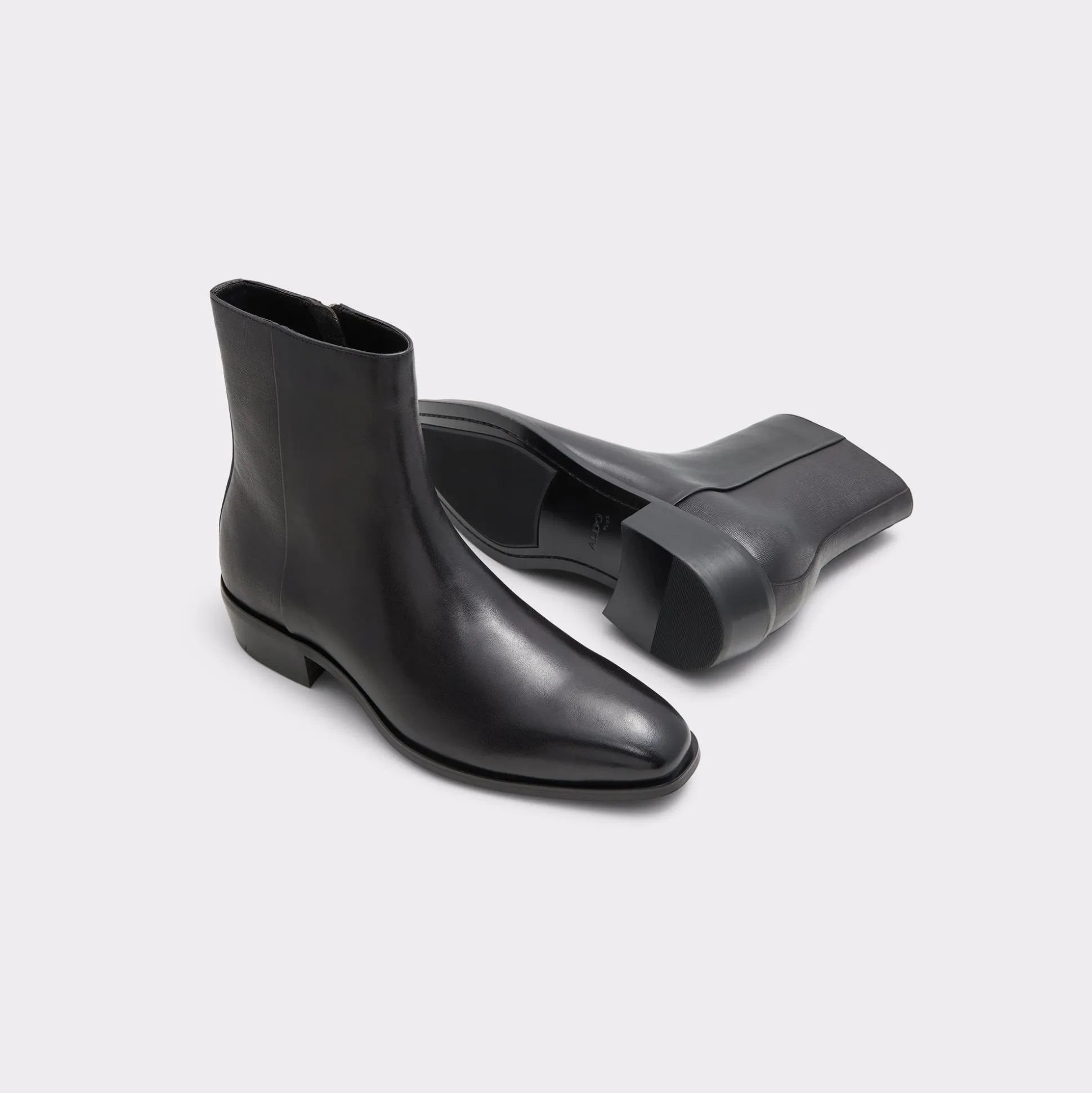 Smooth black leather in front and a textured rear panel create a subtle contrast in this ankle boot, while a side zip offers quick access and a low stacked heel ensures easy movement. Anchor slim dark denim for evening meet-ups or polish tailored trousers on office days-its squared toe finishes each look sharply.