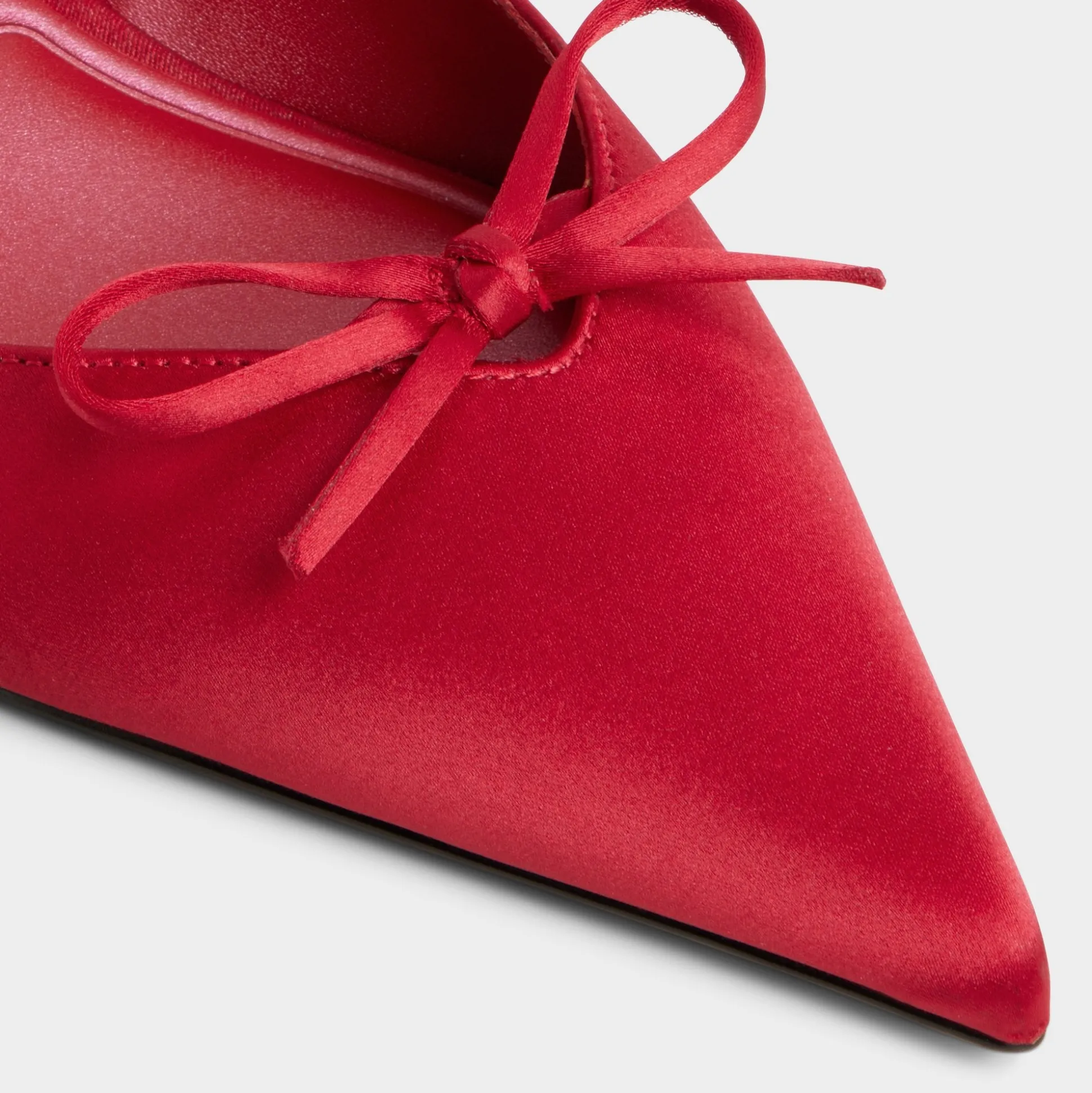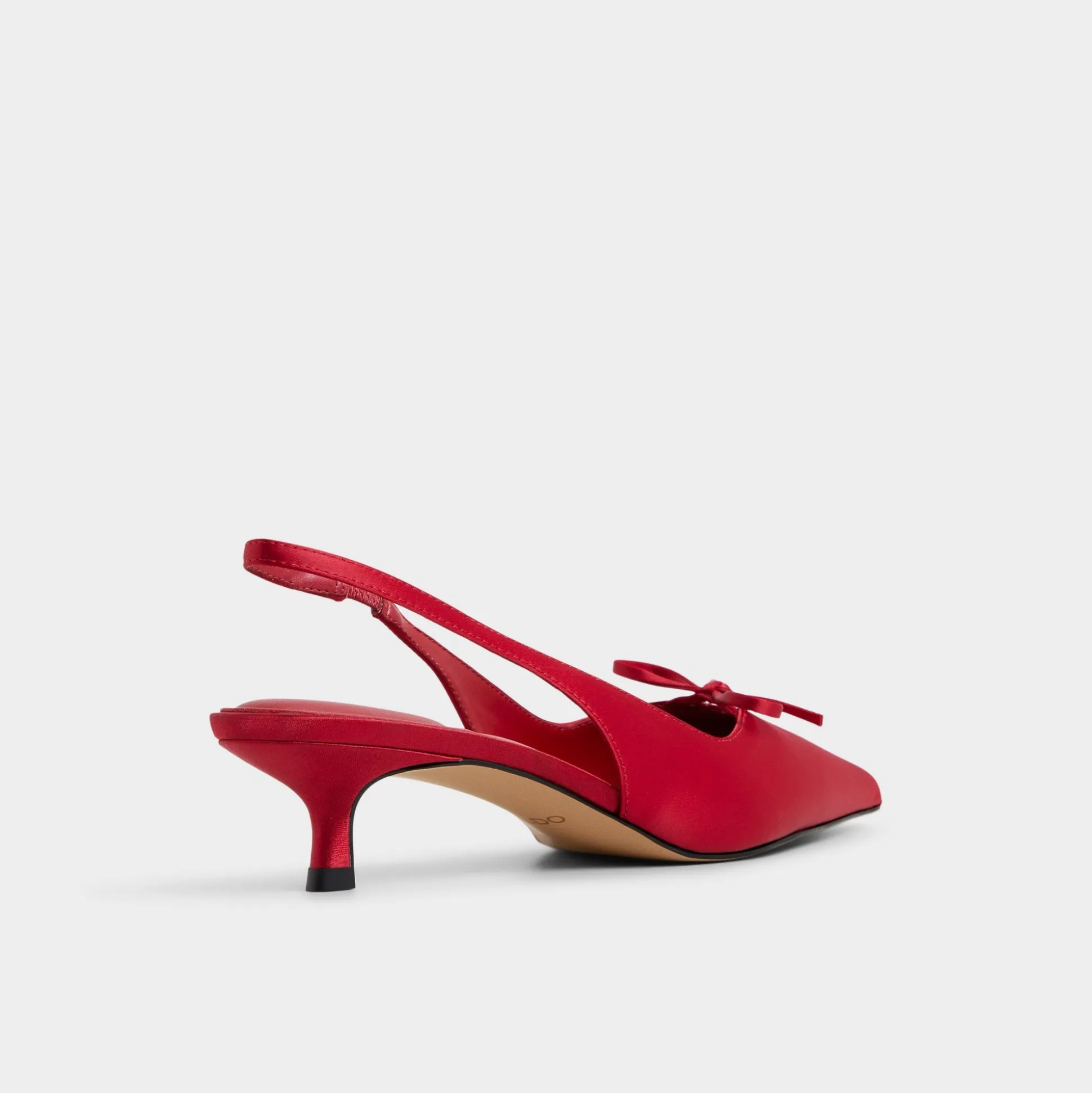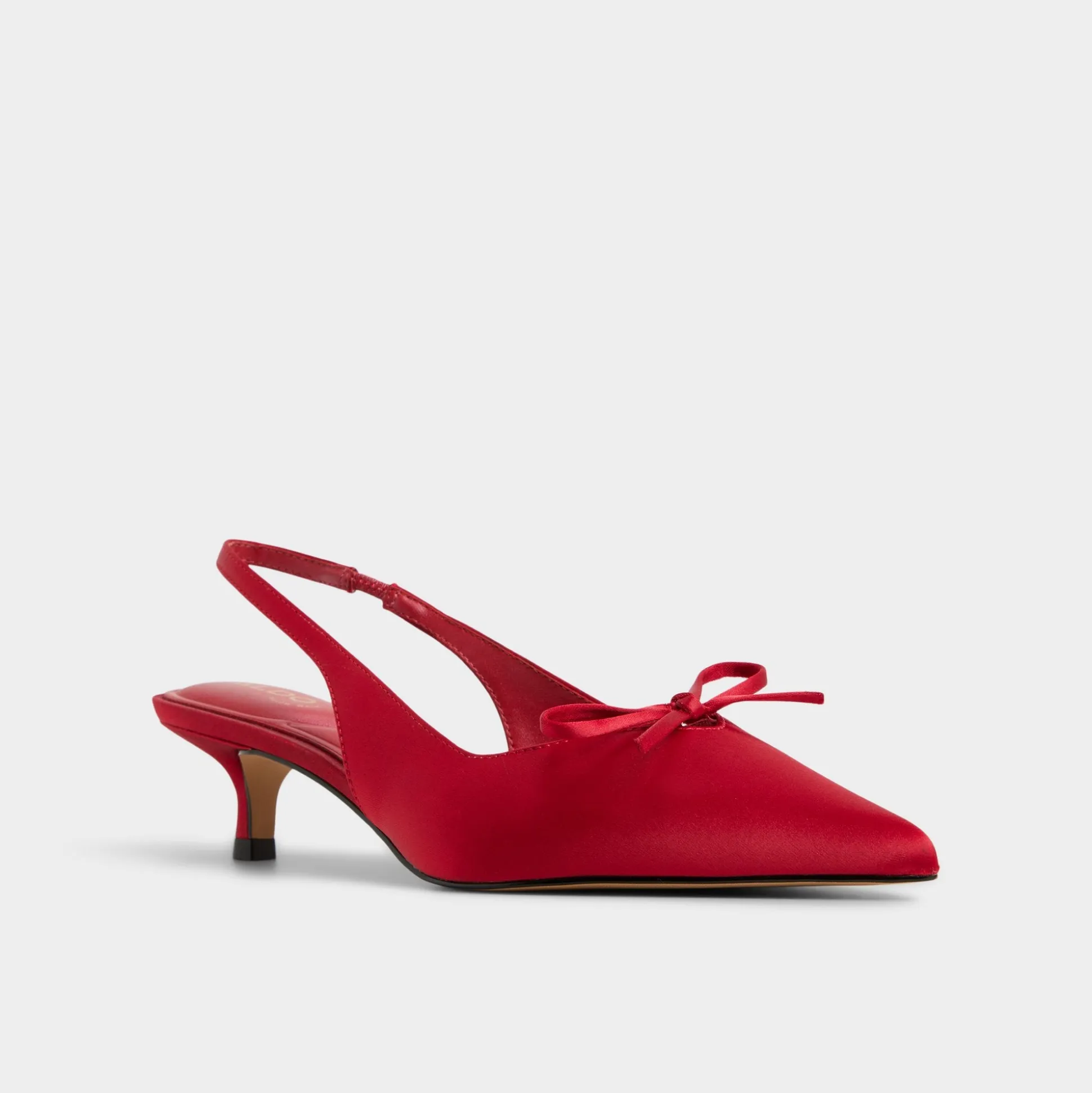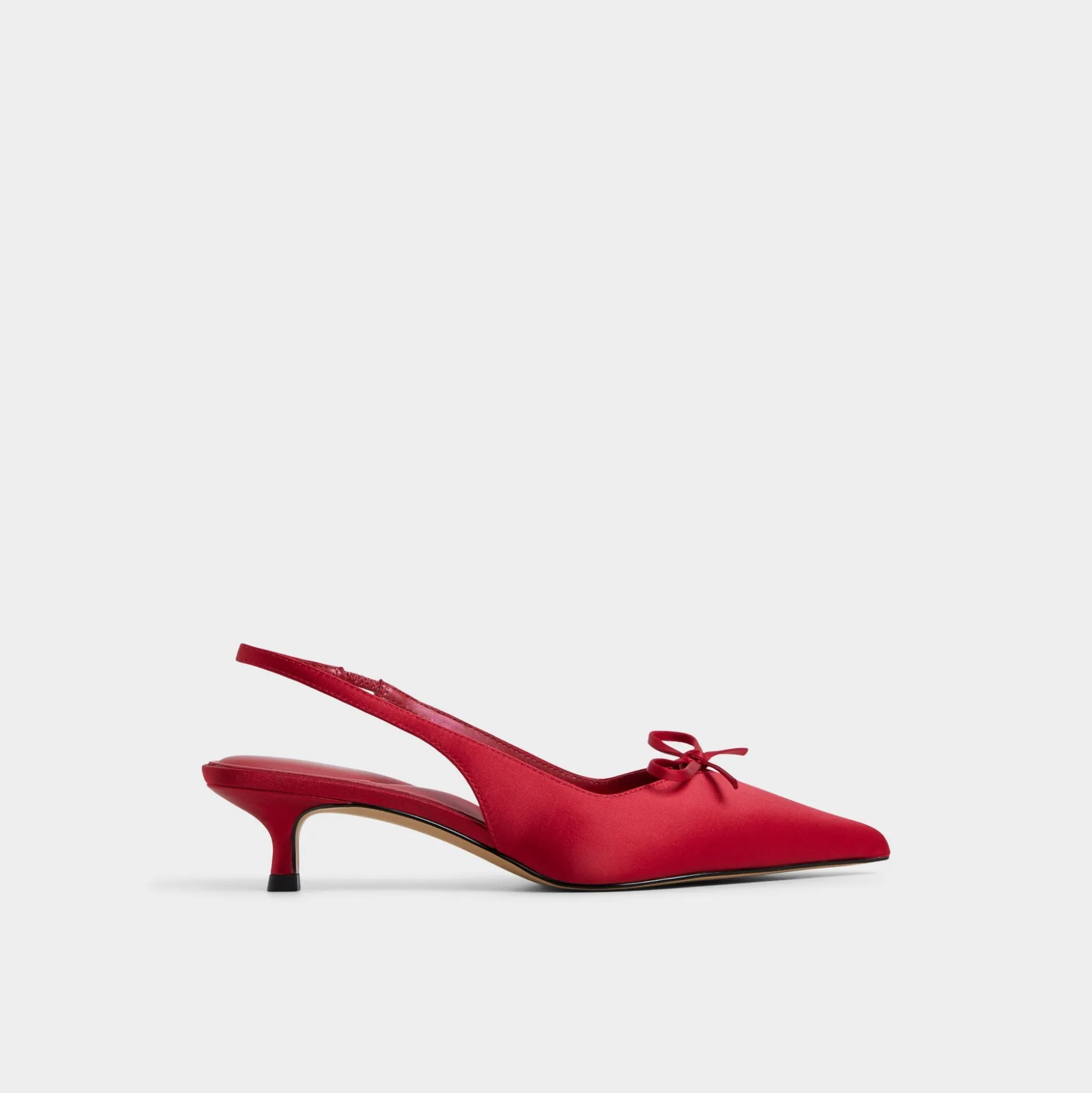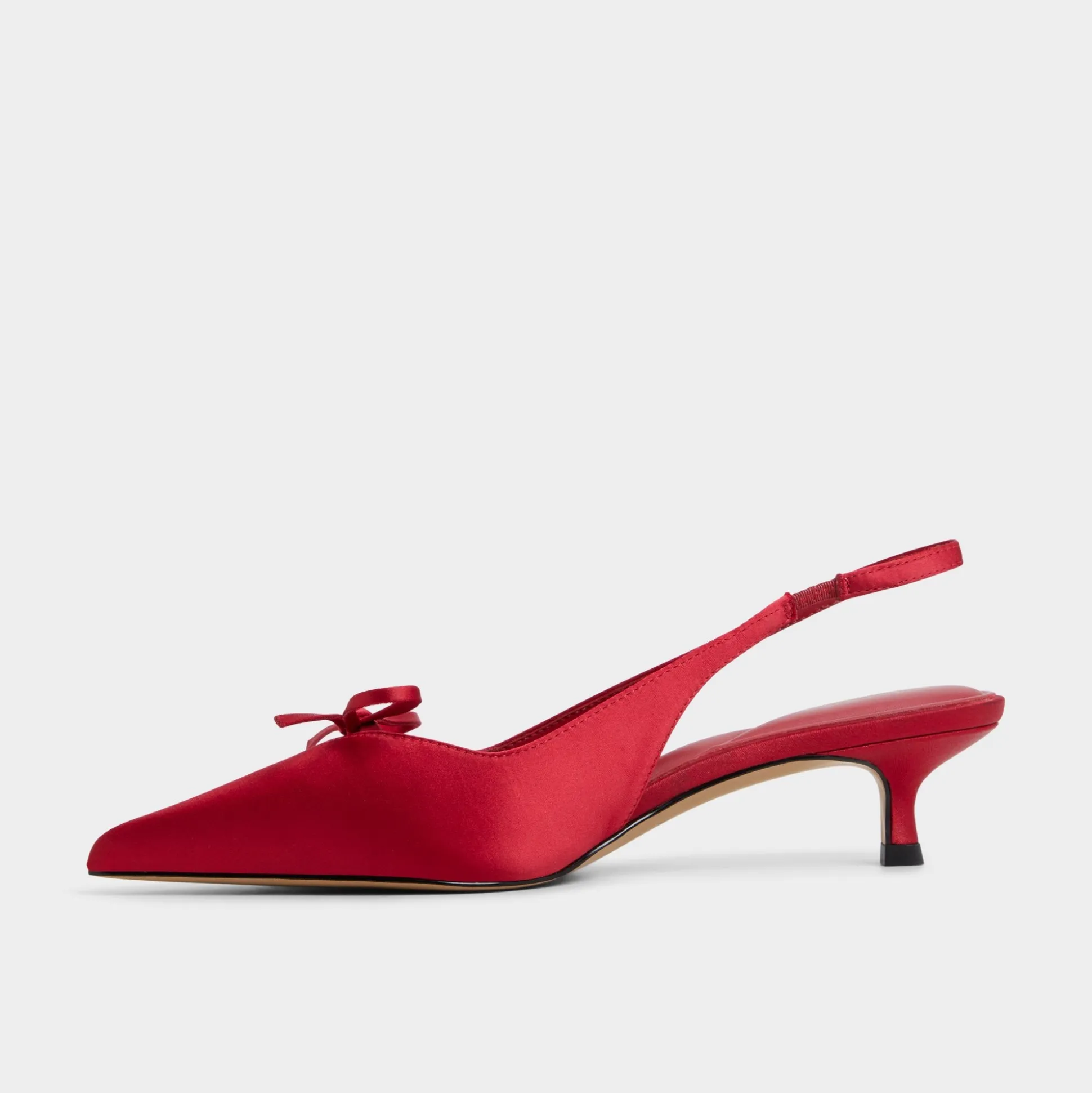 Scarlet satin sharpens the pointy toe on this kitten-heel slingback silhouette, crowned with a dainty bow and built for a wobble-free glide that can turn sidewalks into runways. Pair with cropped trousers for galleries, or slip under satin dresses when date-night lights dim, and let every step feel polished.