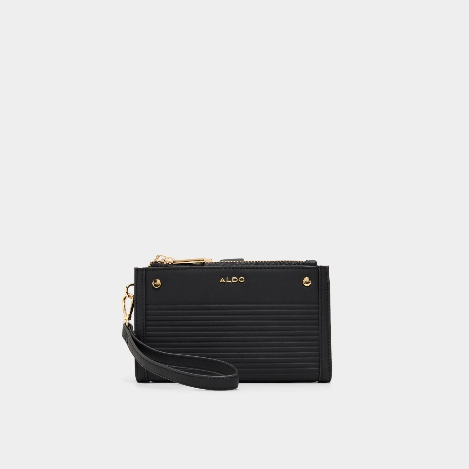 Fine ribbed panels contour this sleek black wristlet, punctuated by minimalist gold hardware, while a detachable loop strap lets you switch from hands-free city dash to polished clutch in seconds. Carry it with a slip dress for rooftop cocktails, or tuck it inside a tote for commuting days, finishing looks with effortless polish.