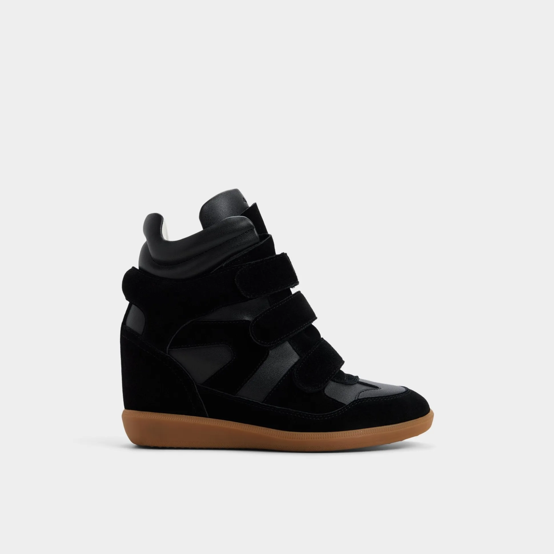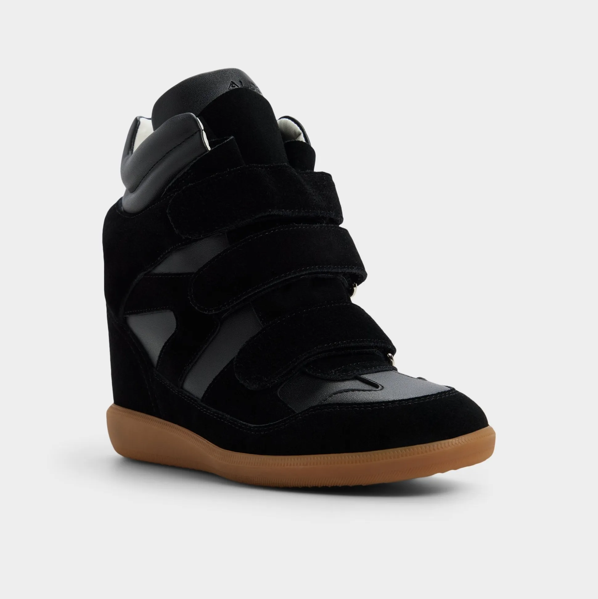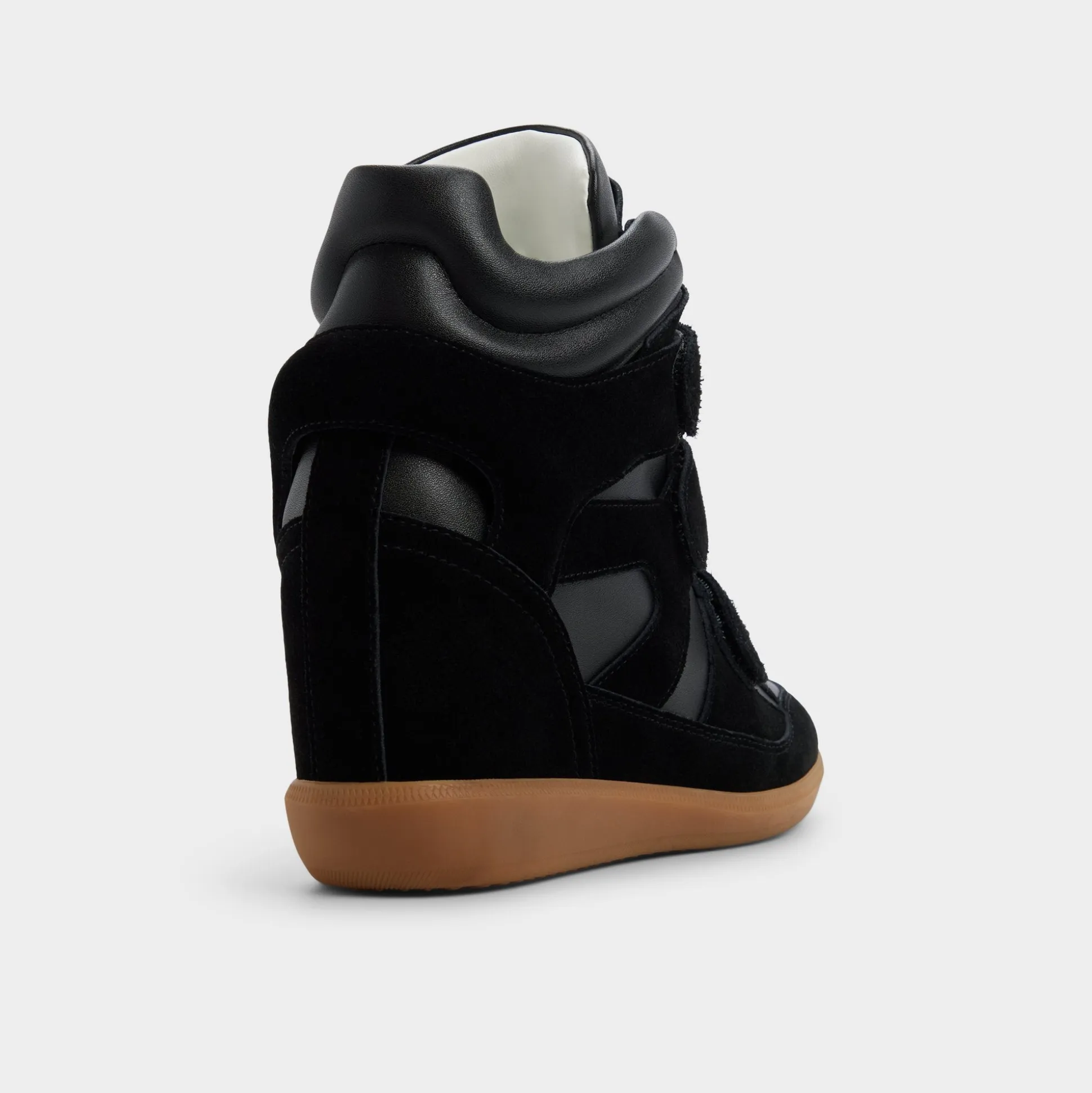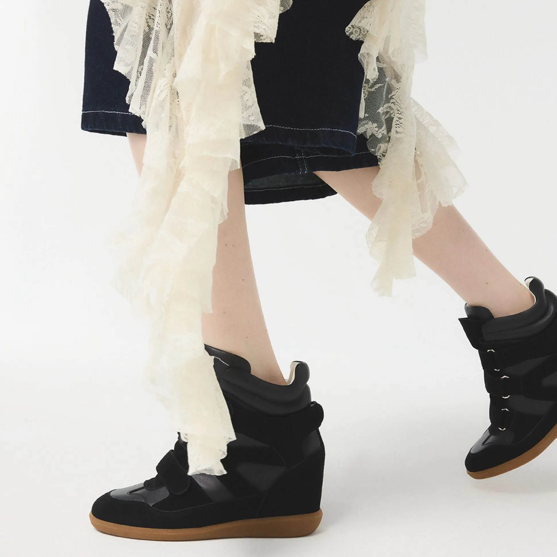 Hidden wedge height reshapes the silhouette in this suede-and-leather high-top, pairing backstage-ready lift with street-smart stacked velcro straps and a calm, confident stride that feels as effortless as it looks. Pair with cropped joggers for fast commutes, or swap in a ribbed mini and bomber when city lights glow.