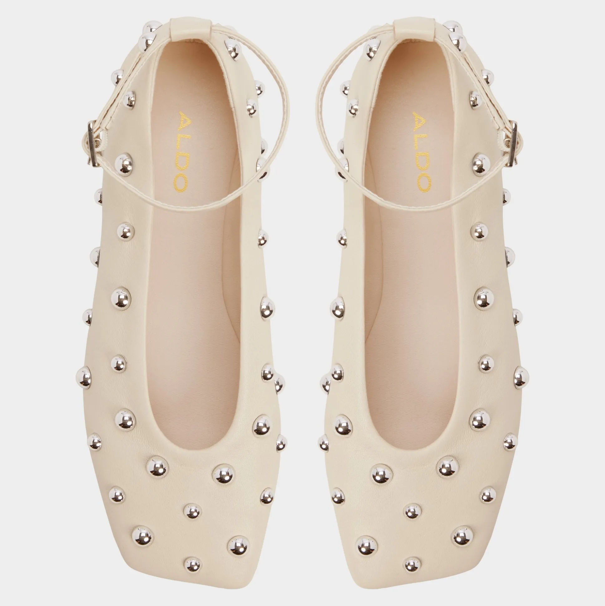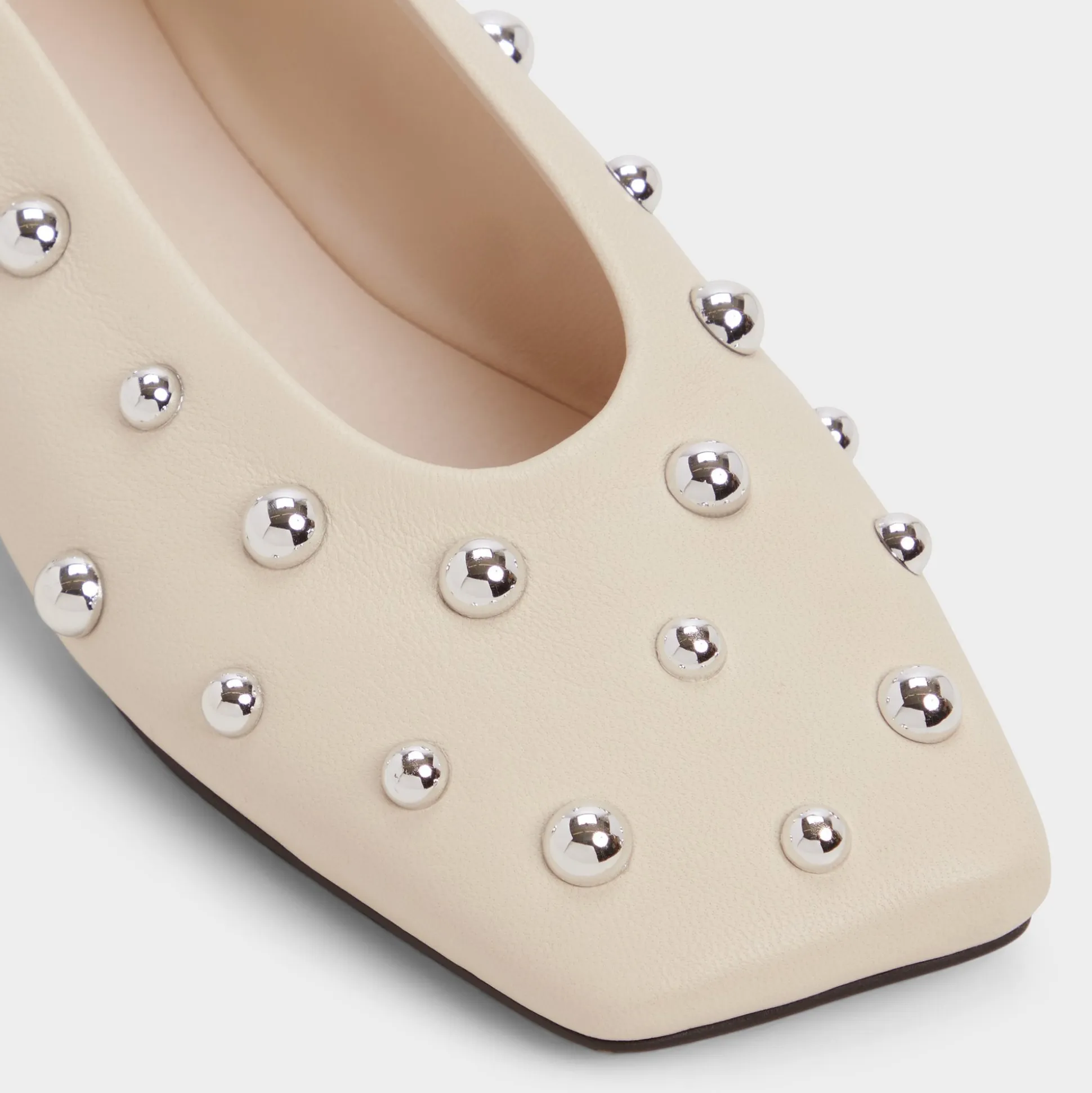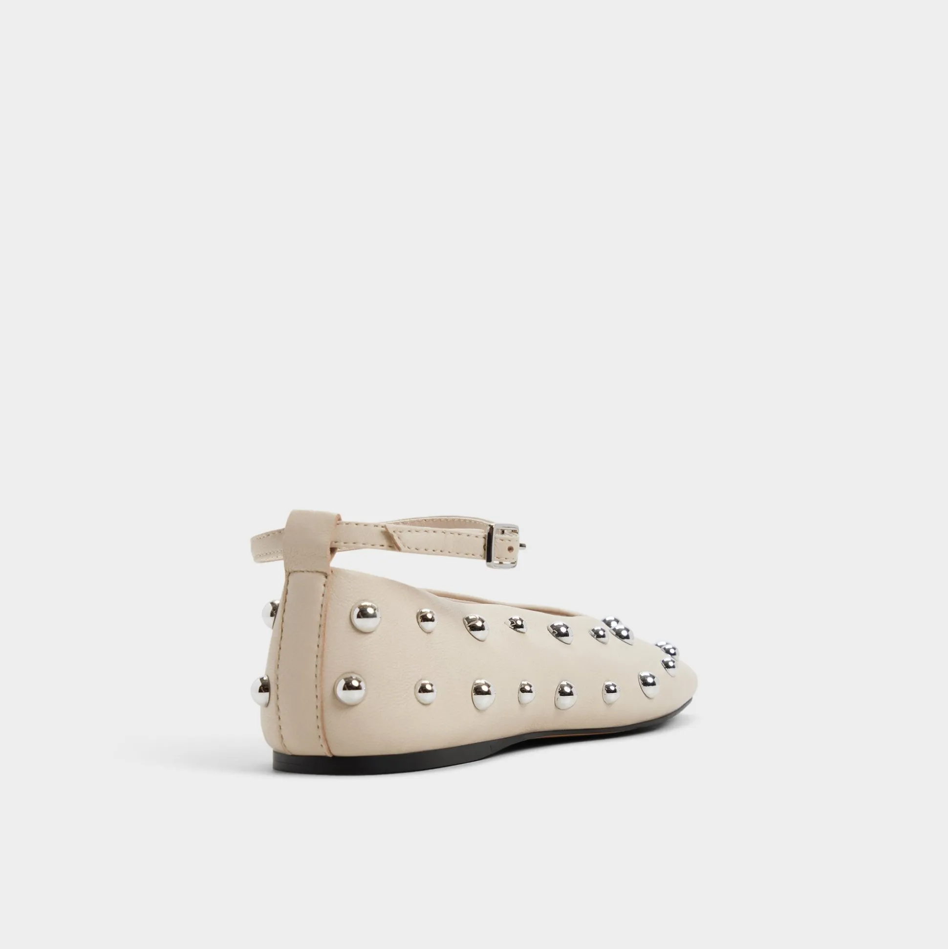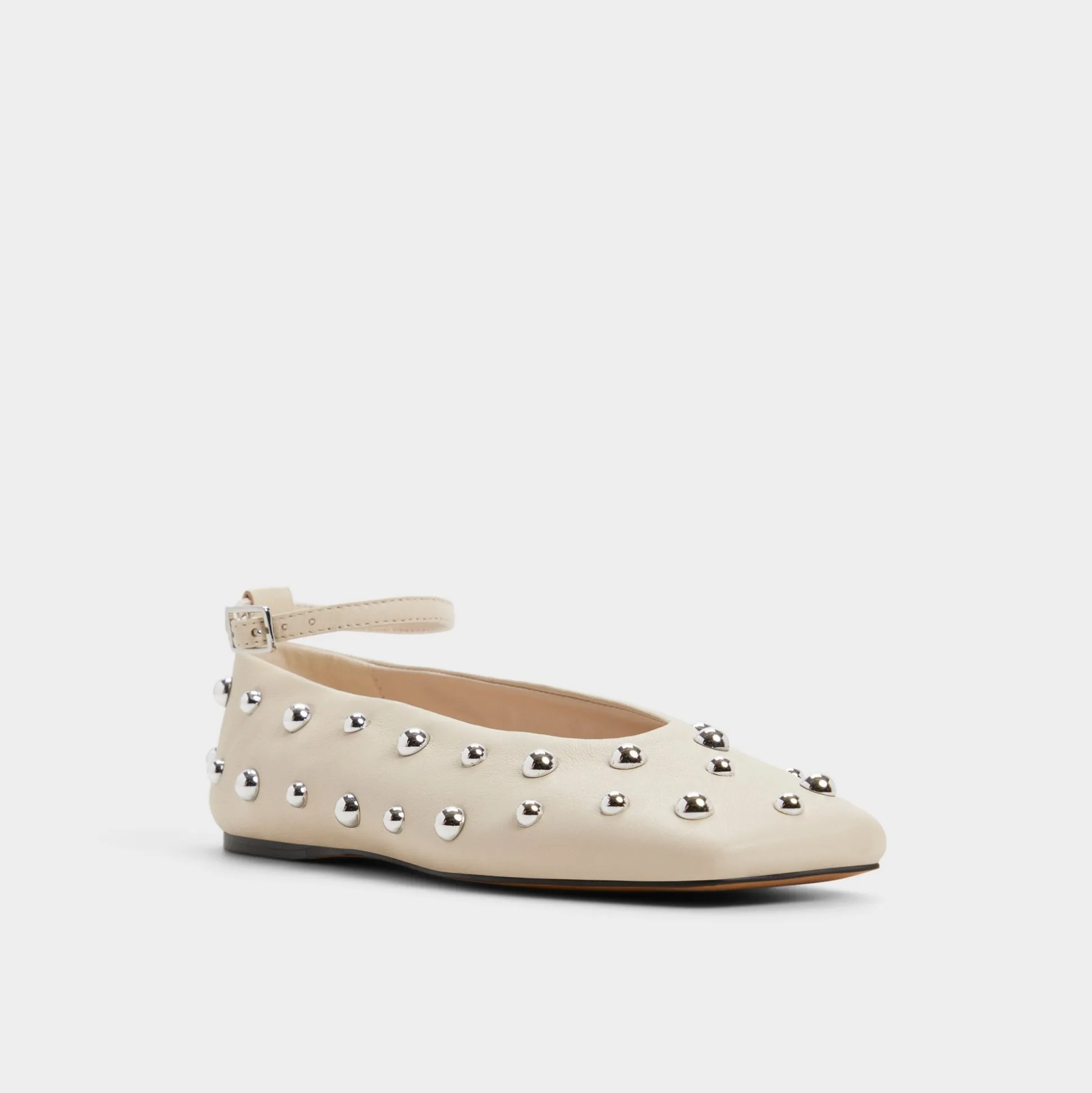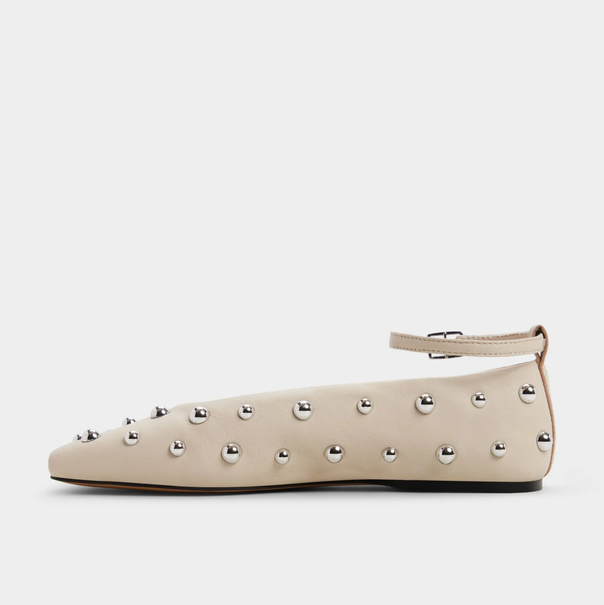 Silver-tone studs gleam across buttery leather, turning this sleek flat into a city-night moment, while an adjustable ankle strap keeps each step secure on a flexible rubber sole designed for all-day city sprints. Pair with cropped denim for catch-ups, or anchor a satin slip for rooftop celebrations.