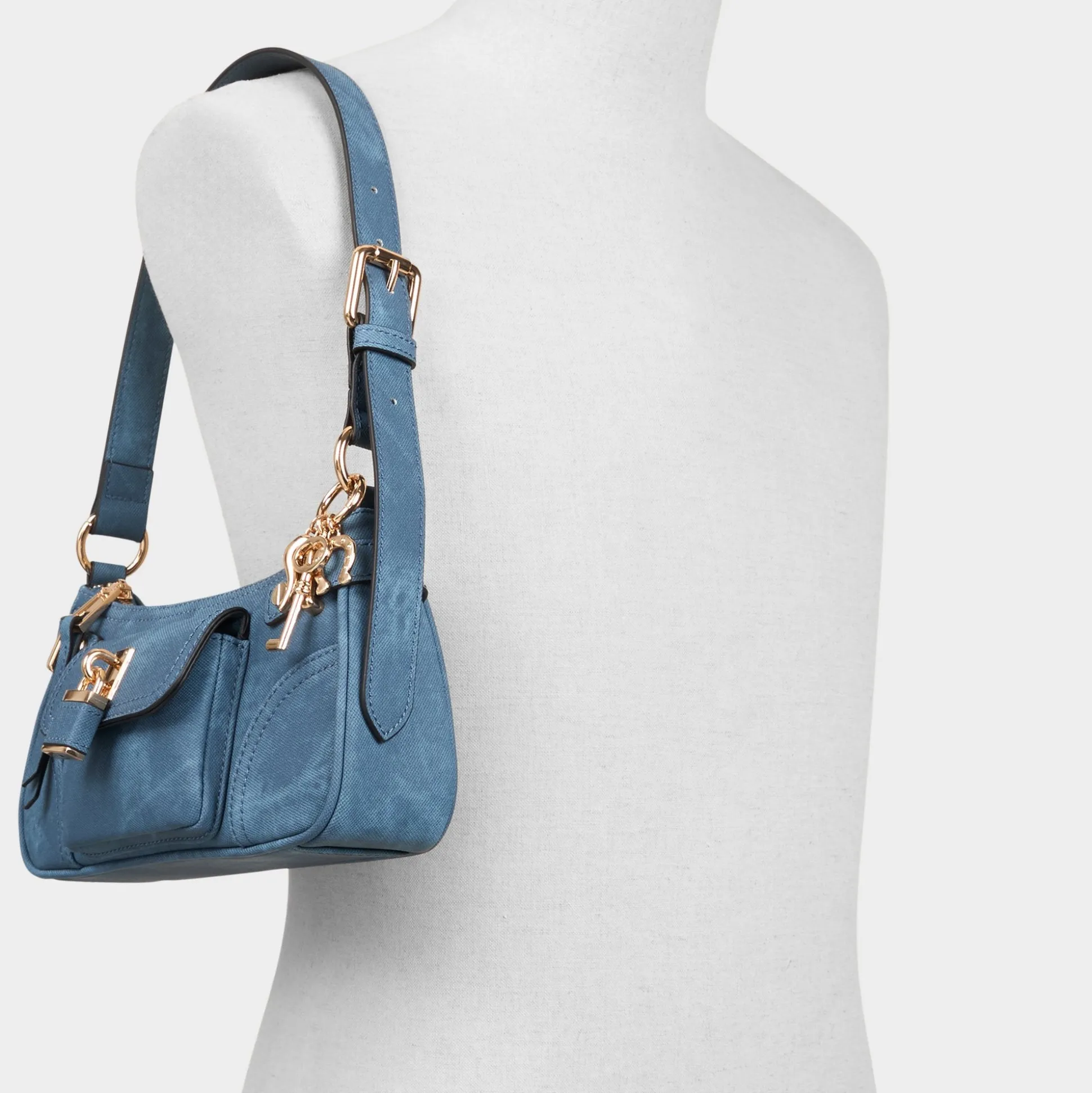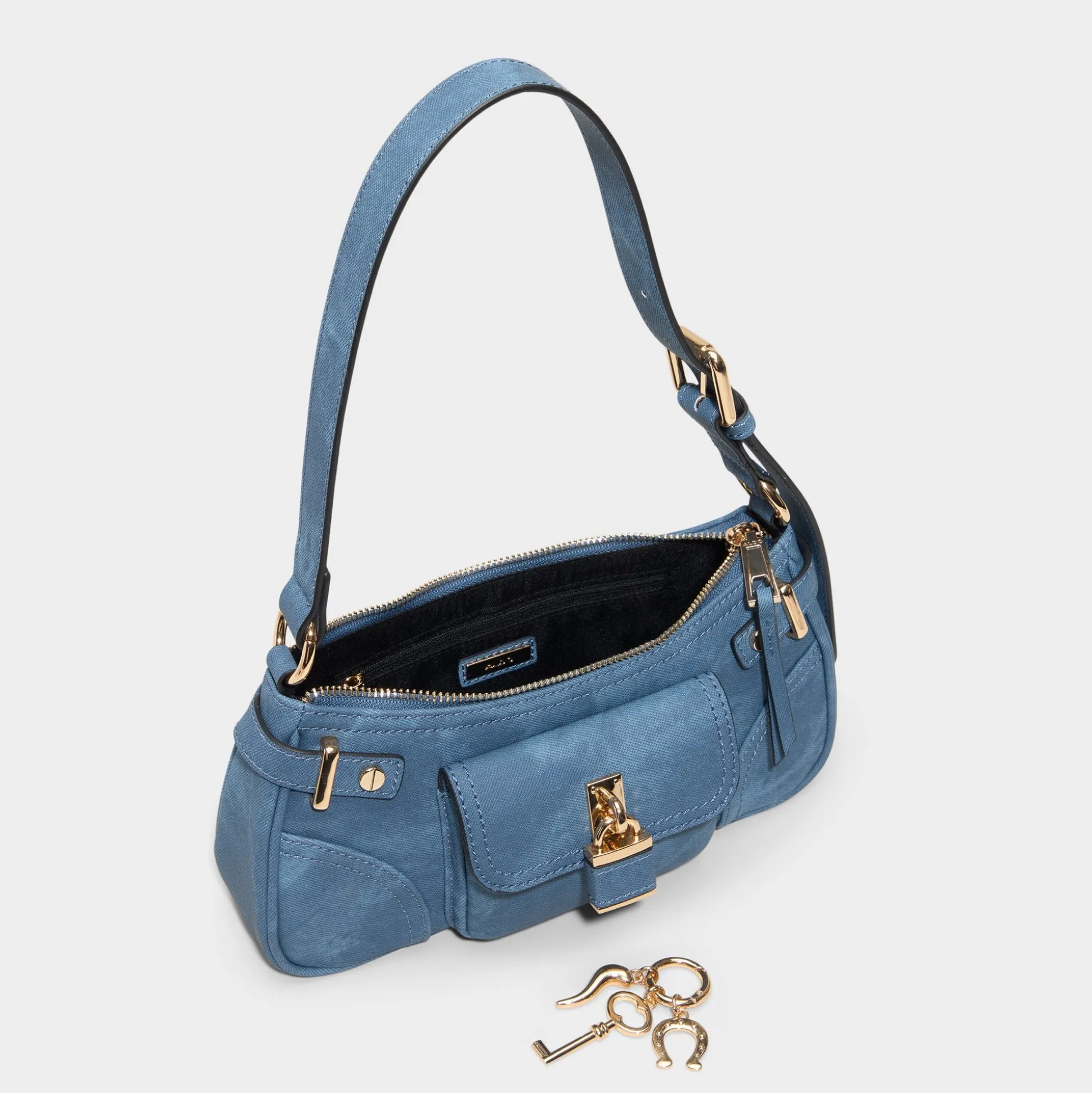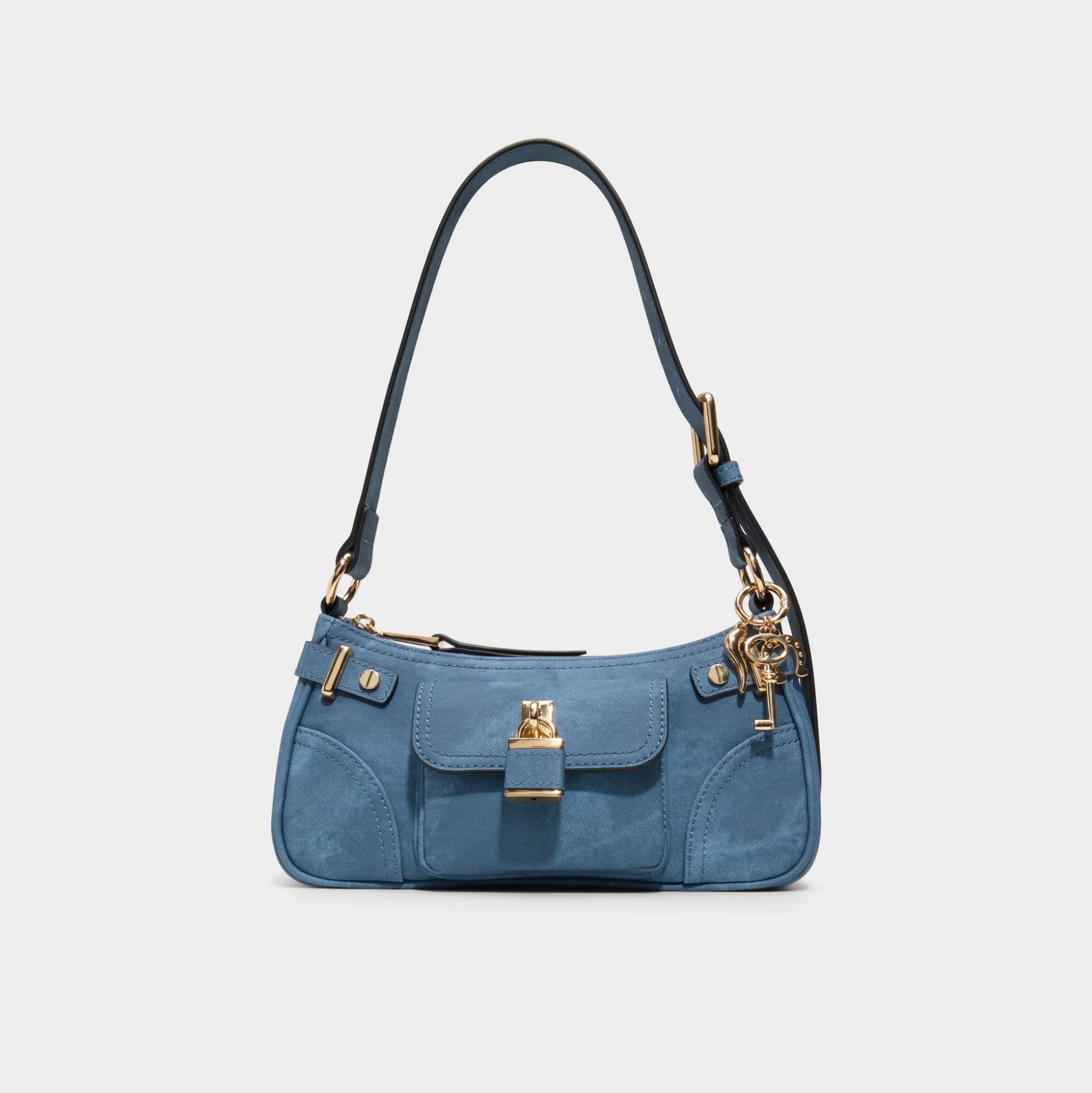 Ocean-tinted leather shapes a sleek baguette, accented with tonal stitching and a shiny padlock and key that add flair while keeping essentials secure, like a quiet lighthouse guiding daily looks. Carry it with a satin midi for gallery nights, or tuck it beside relaxed tailoring for coffee runs.