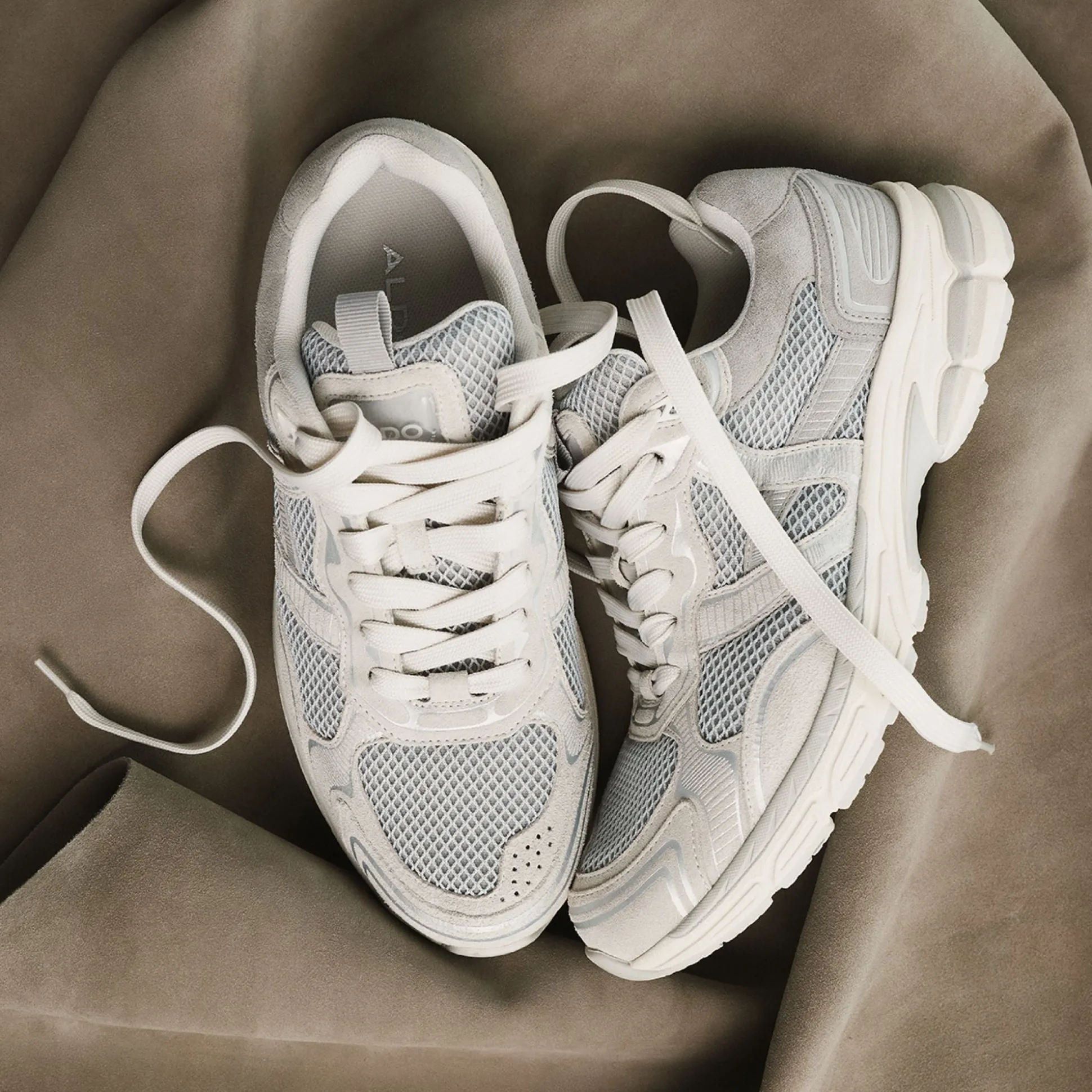 Off-white mesh blends with soft grey suede overlays on this low-top, while the sculpted jogger sole provides cushioning that makes running errands, airport travels, and after-work strolls feel nearly weightless. Pair with tapered cargos for weekend markets or cuffed dark denim for casual Fridays-the subtle tones integrate anywhere seamlessly.