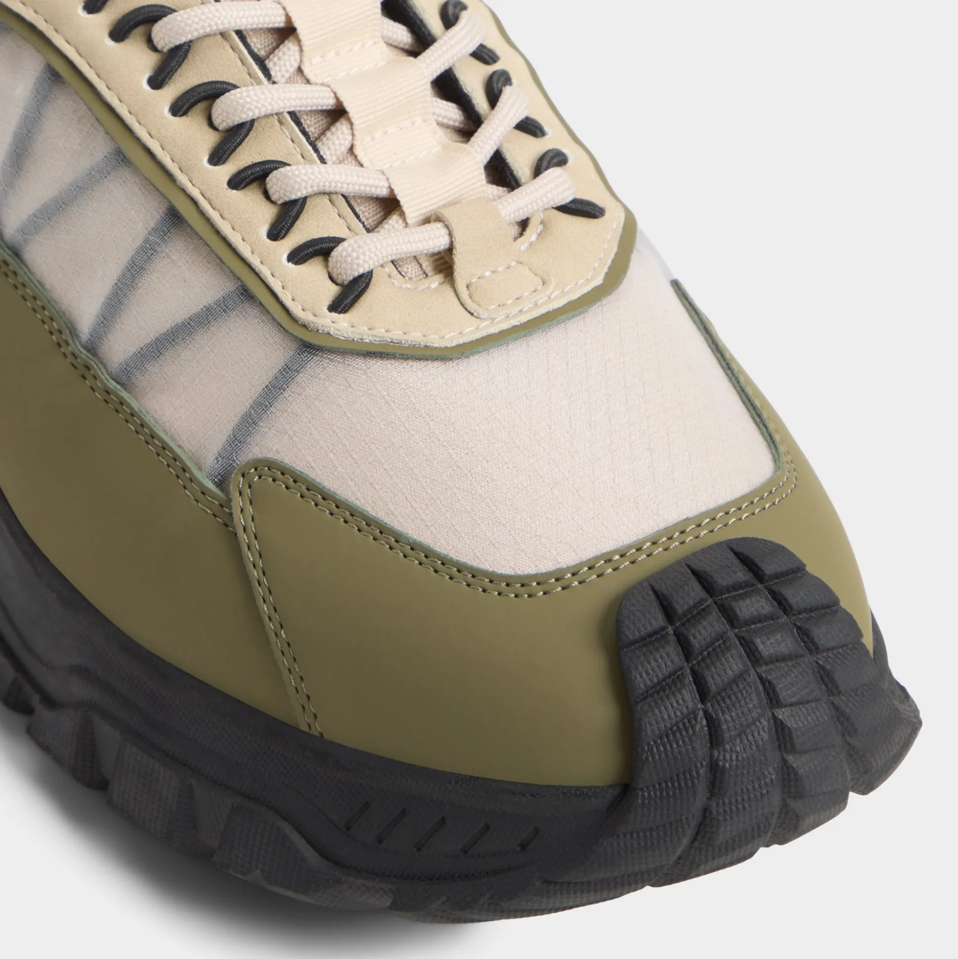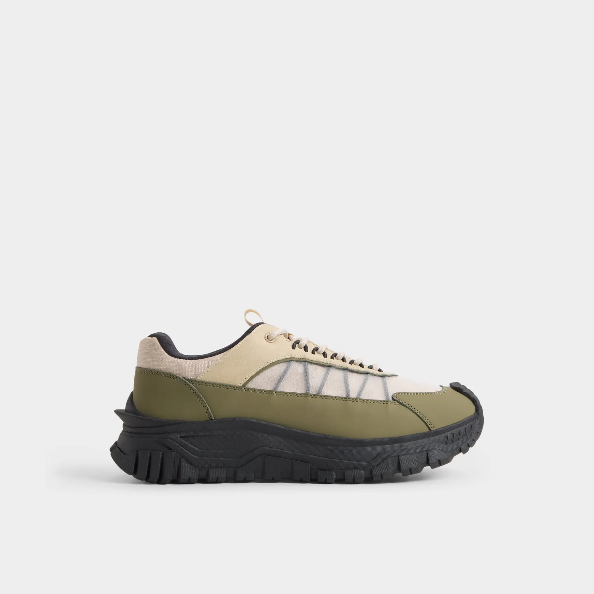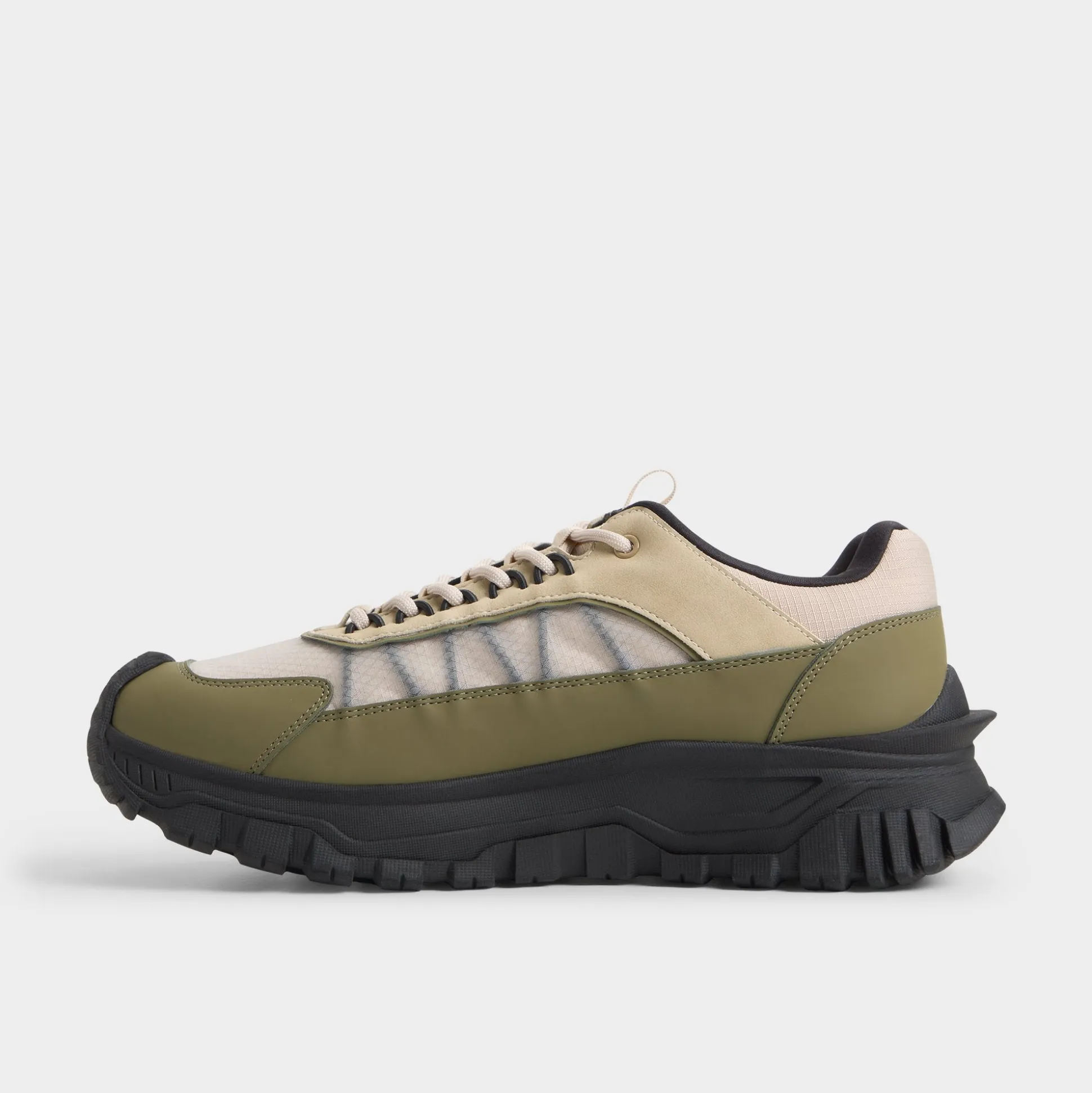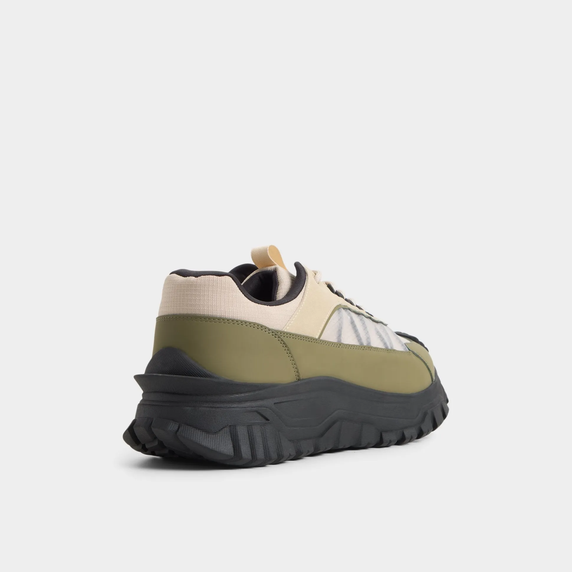 Chunky rubber lugs give this leather-and-mesh sneaker an adventurous spirit, cushioning each step while green and beige layers keep it fresh on streets or trails. Wear with cargo shorts for coastal walks or joggers after workouts-the contrasting tread grounds every style effortlessly.