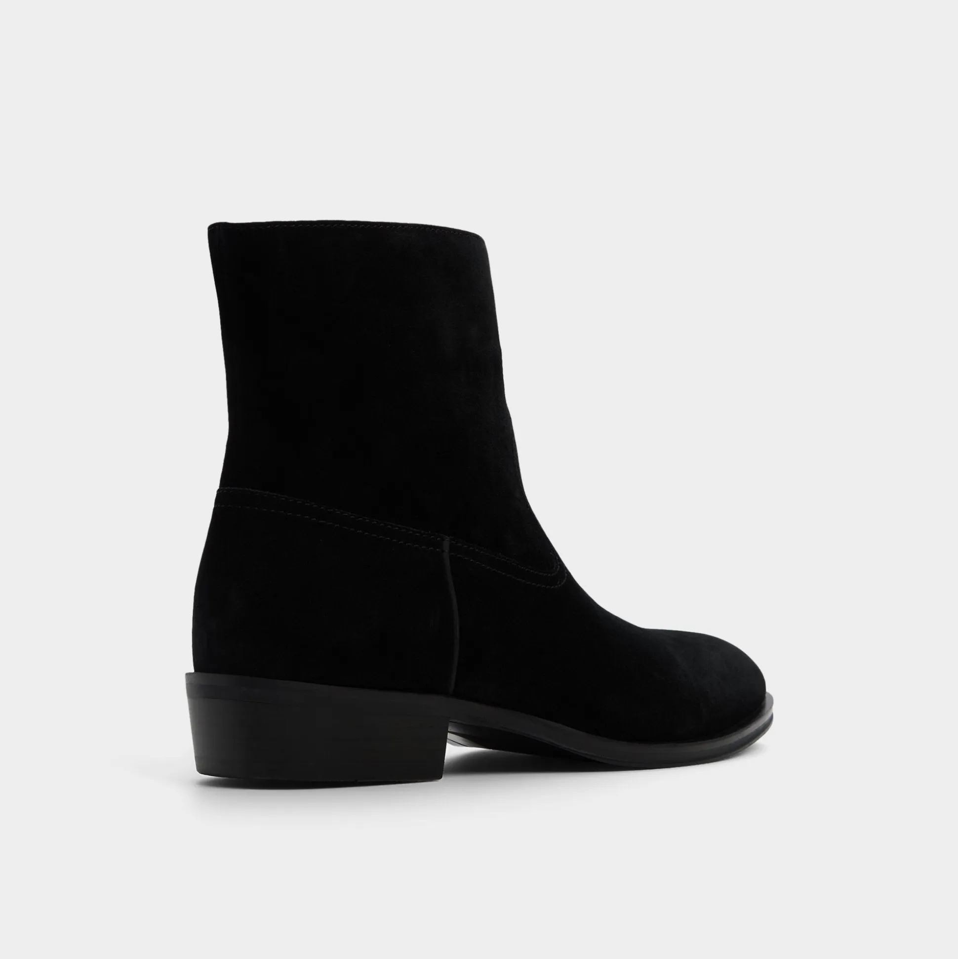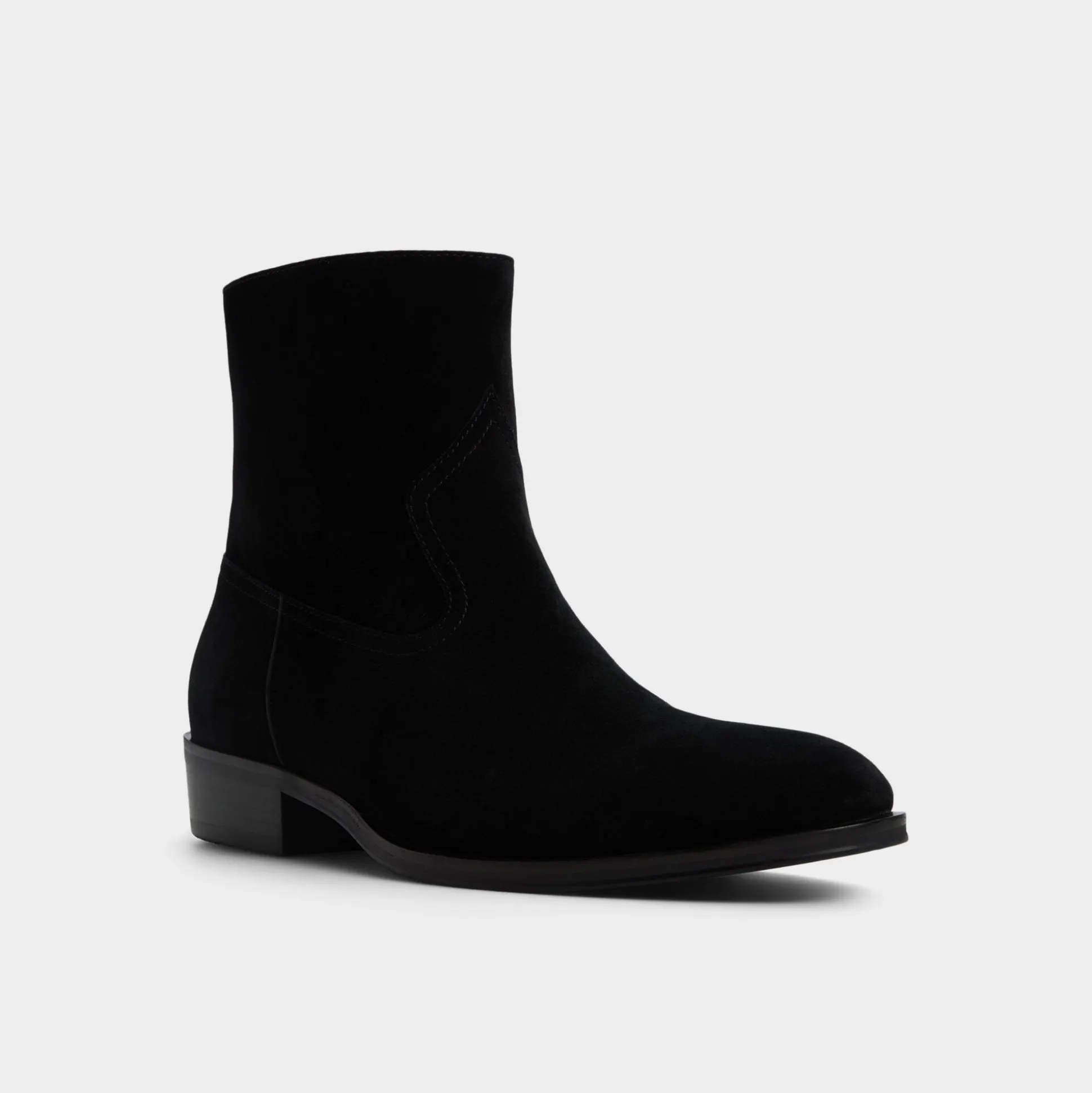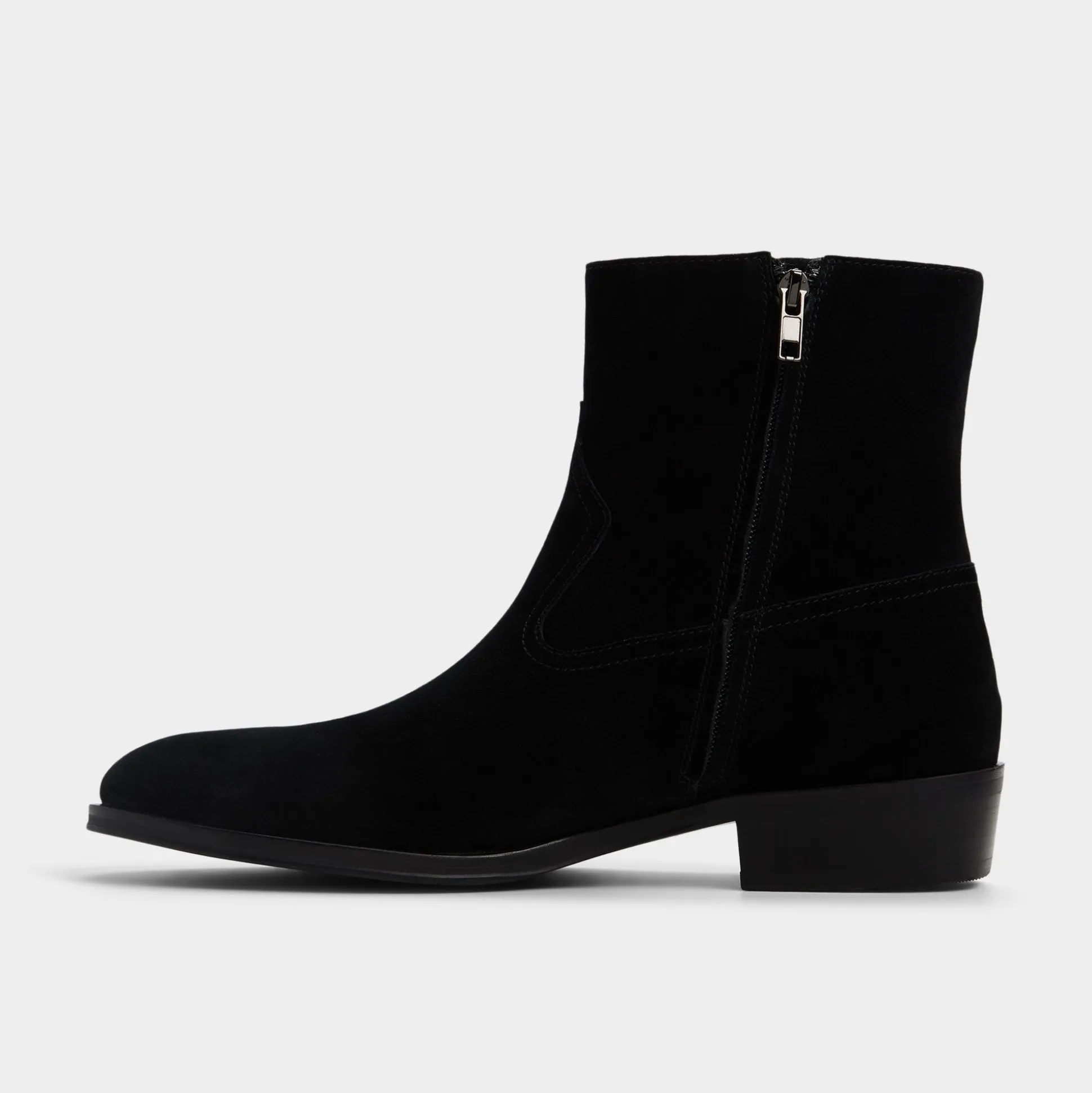 Velvety black suede shapes this sleek ankle boot, featuring a hidden side zip for quick exit and a low block heel that maintains a sharp silhouette from office days to night outings. Pair with slim charcoal denim for gallery trips or tuck under a tailored suit-the suede effortlessly balances the formal look.