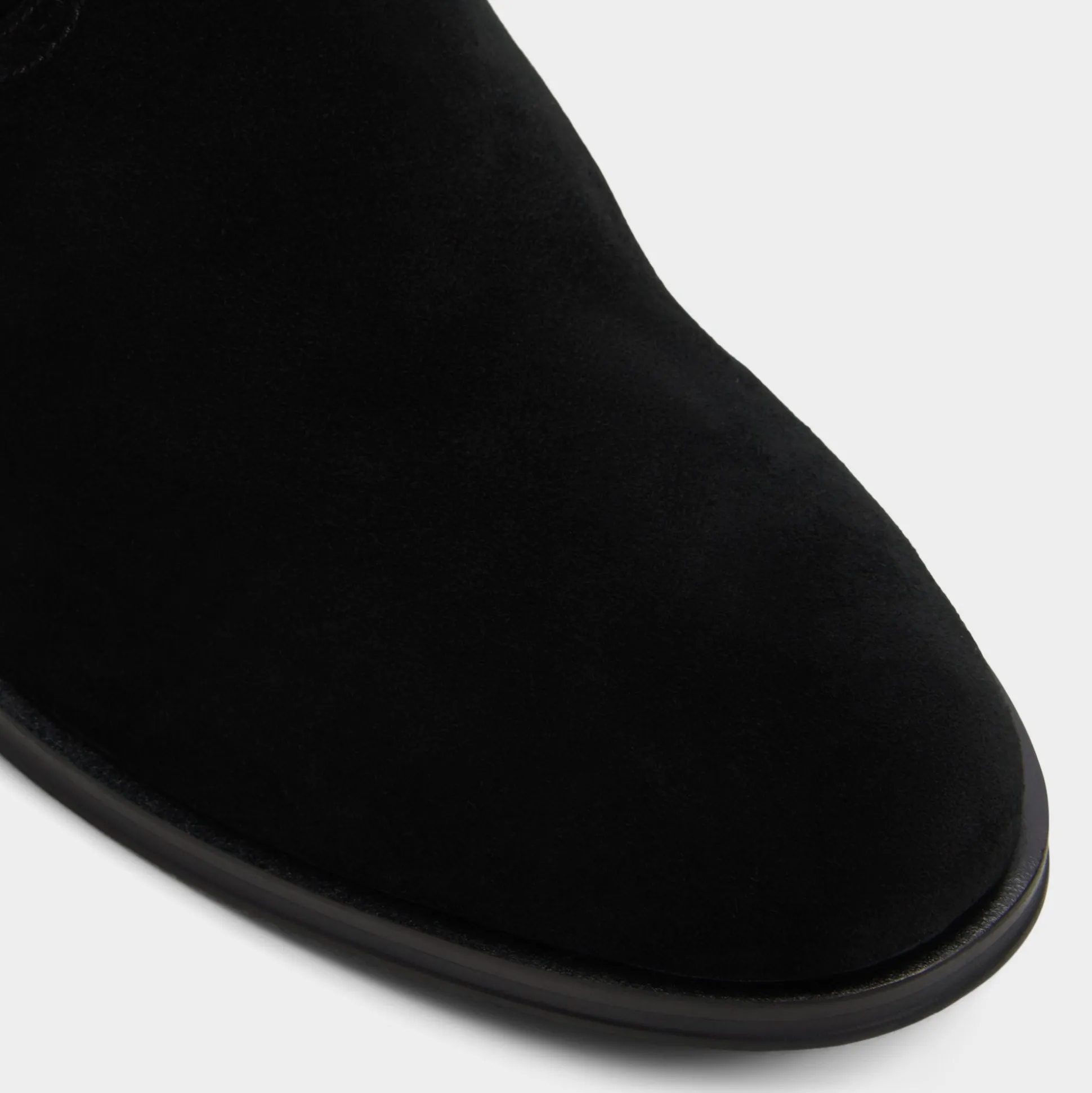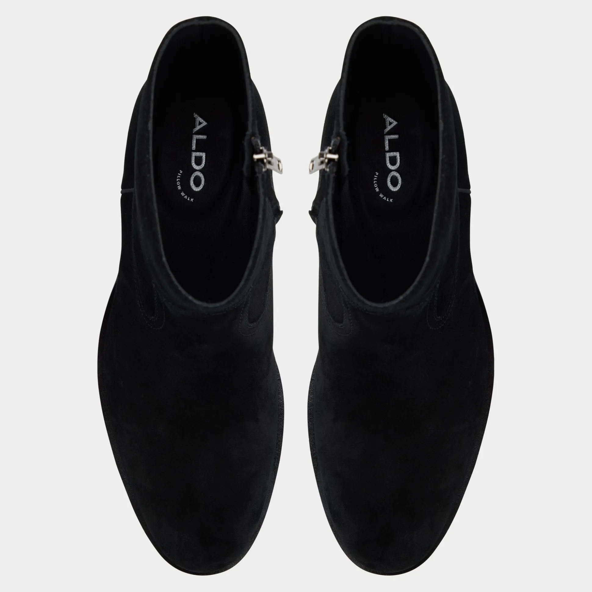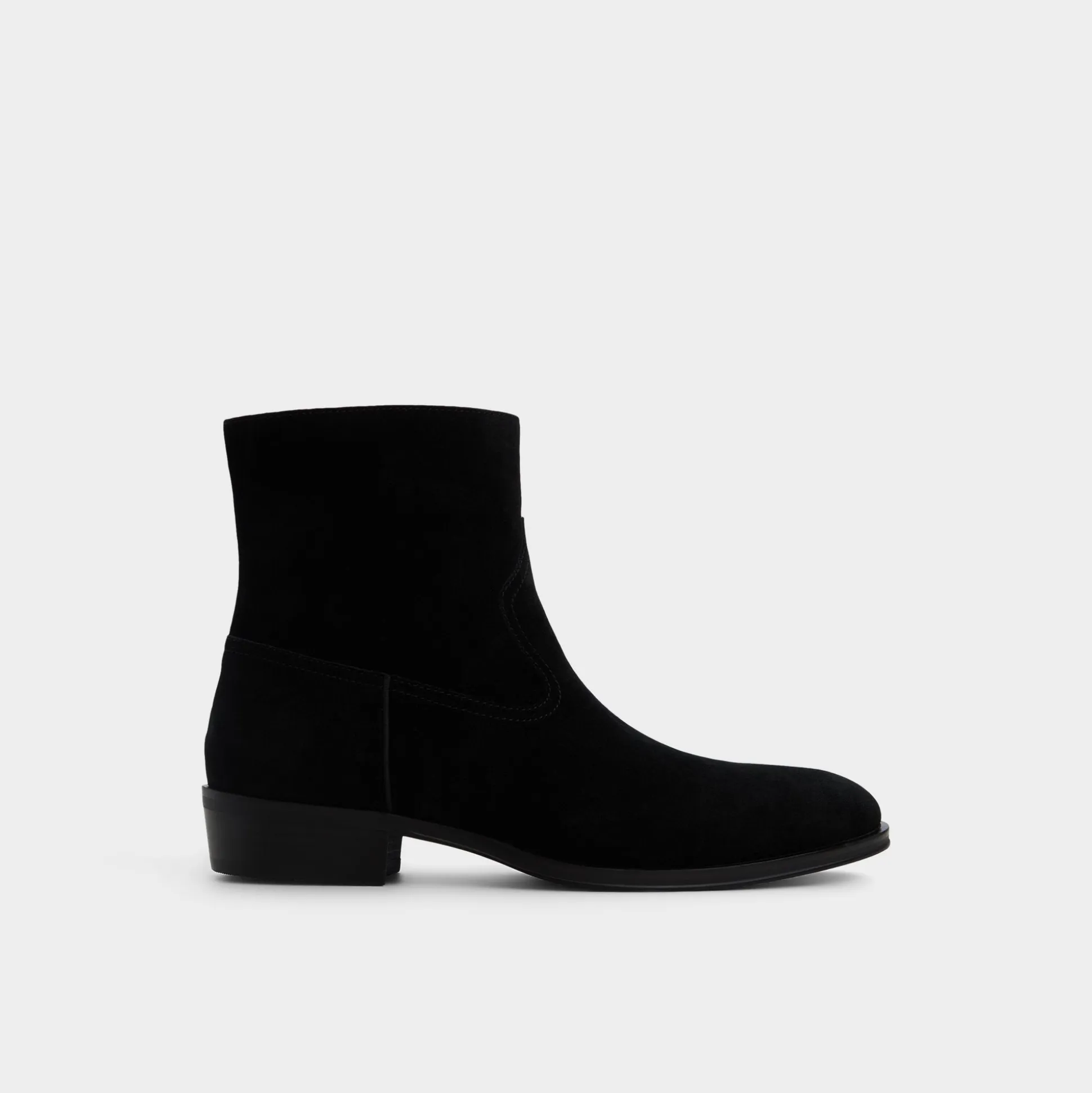 Velvety black suede shapes this sleek ankle boot, featuring a hidden side zip for quick exit and a low block heel that maintains a sharp silhouette from office days to night outings. Pair with slim charcoal denim for gallery trips or tuck under a tailored suit-the suede effortlessly balances the formal look.
