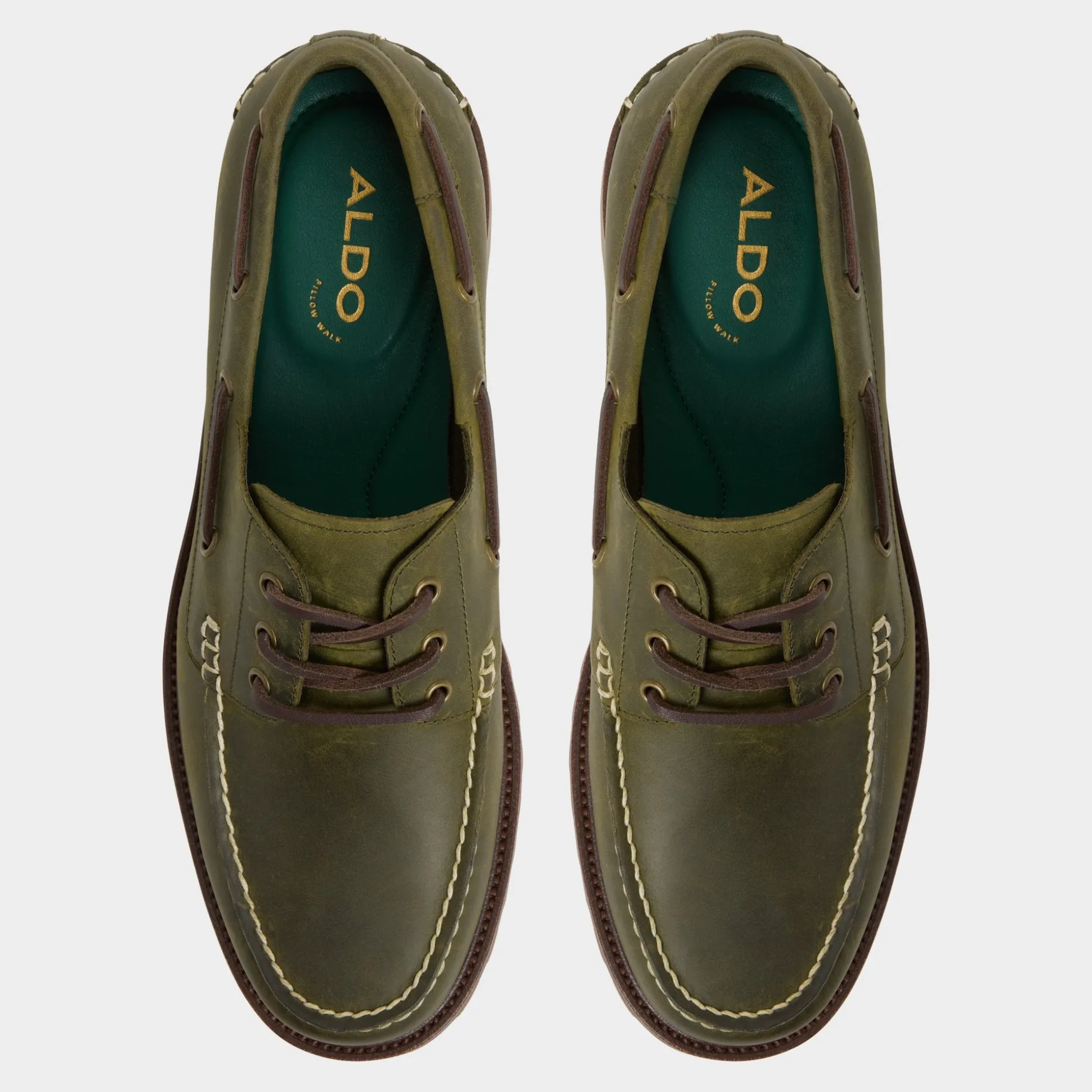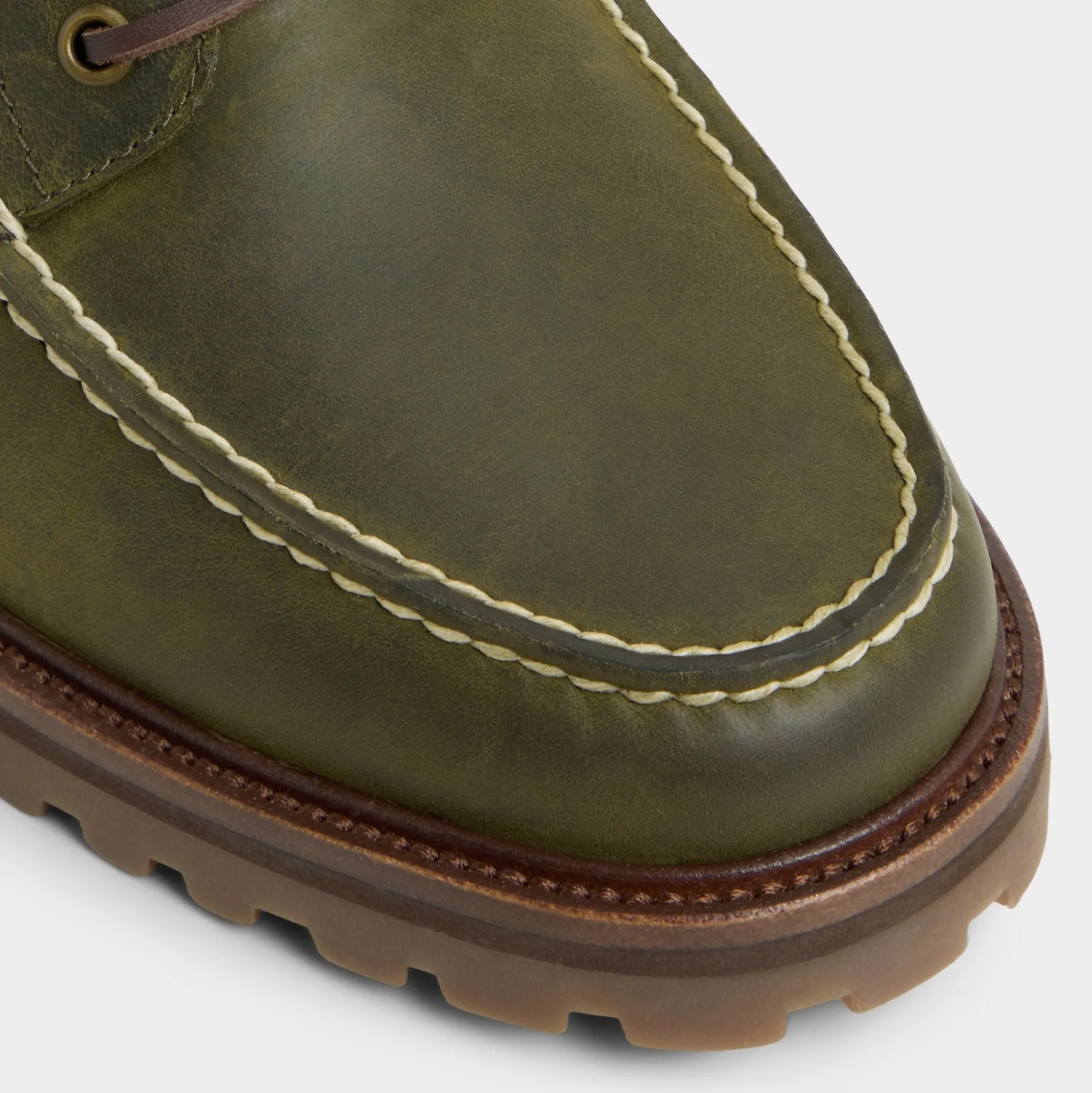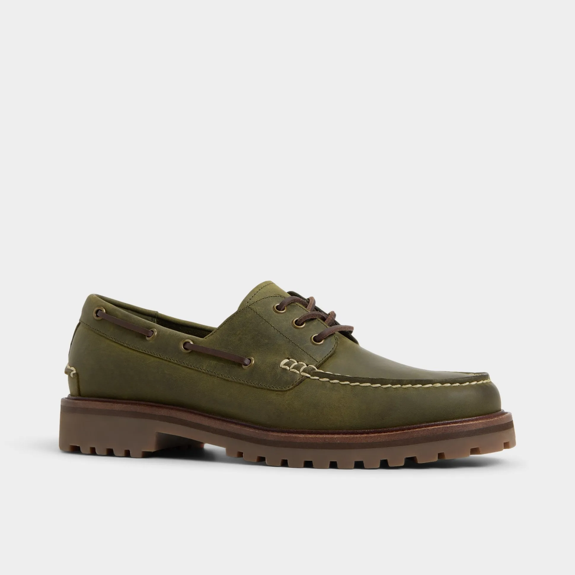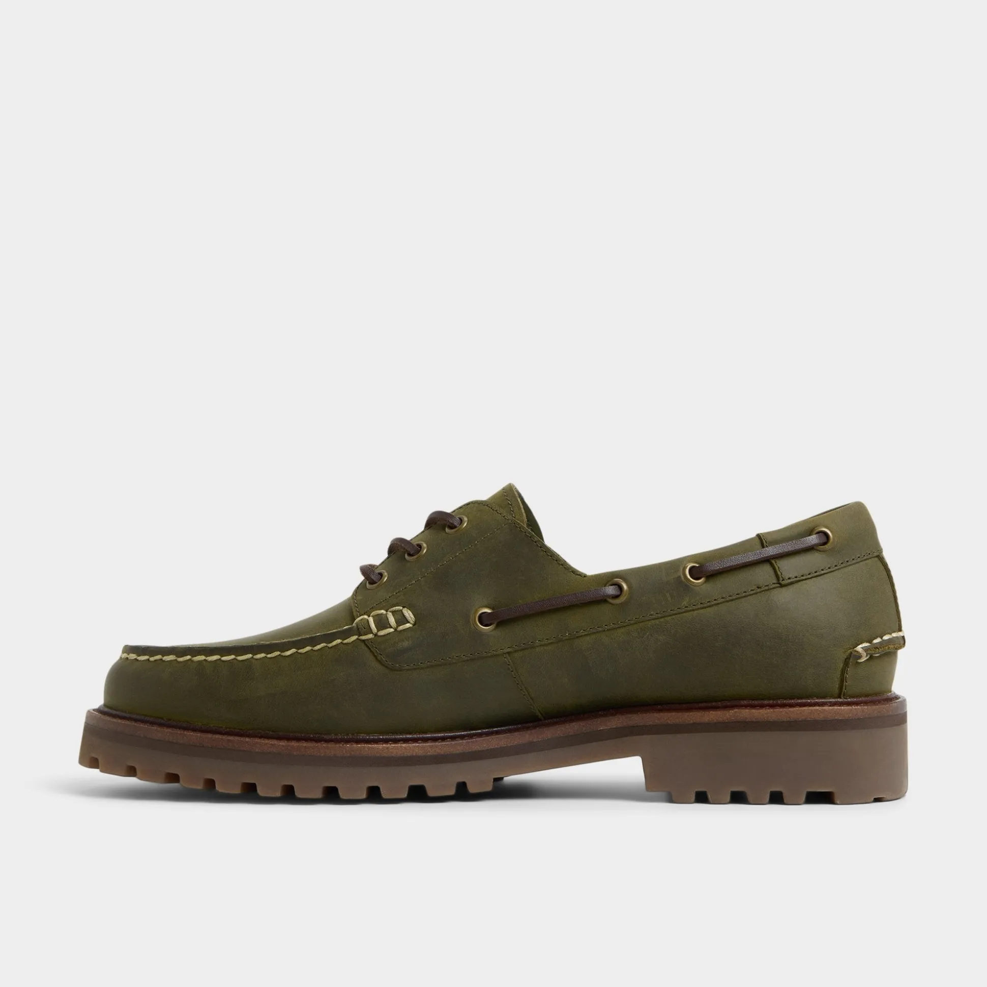 Olive leather with field-khaki topstitching gives these boat shoes a field-khaki vibe, while a lug rubber sole keeps every step confident from docks to city streets. Anchor them with rolled cargos for market trips, or pair with cuffed dark denim for drinks, the olive hue complements relaxed outfits effortlessly.