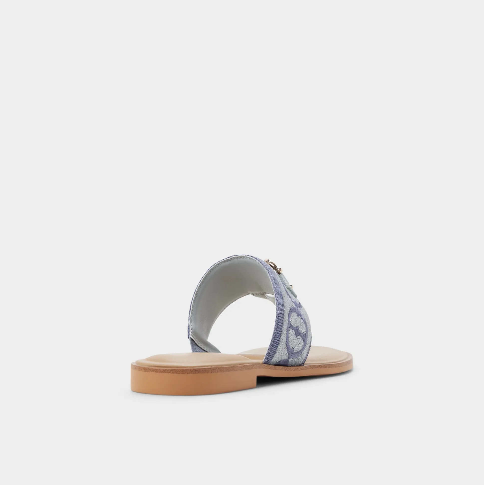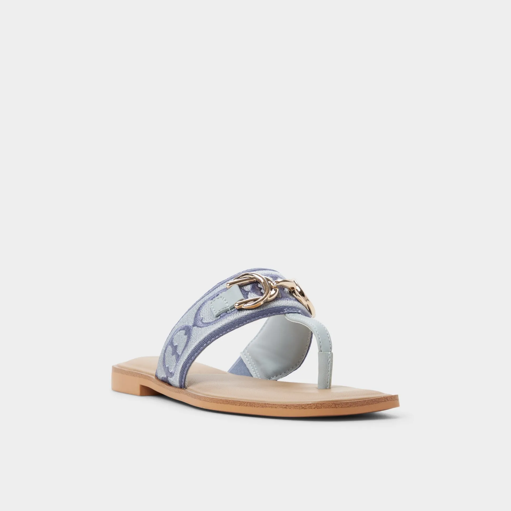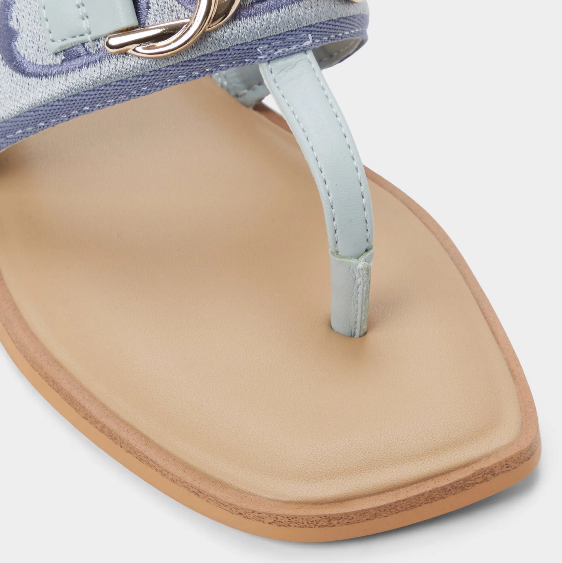 Denim-blue jacquard crowns a wide strap thong sandal, brushed-gold buckle lining lending quiet polish, while a flexible flat keeps movement easy from city staircases to sunlit boardwalks for spontaneous city days. Pair with white cutoffs for farmers-market loops, or slip beneath a breezy midi for sunset strolls.