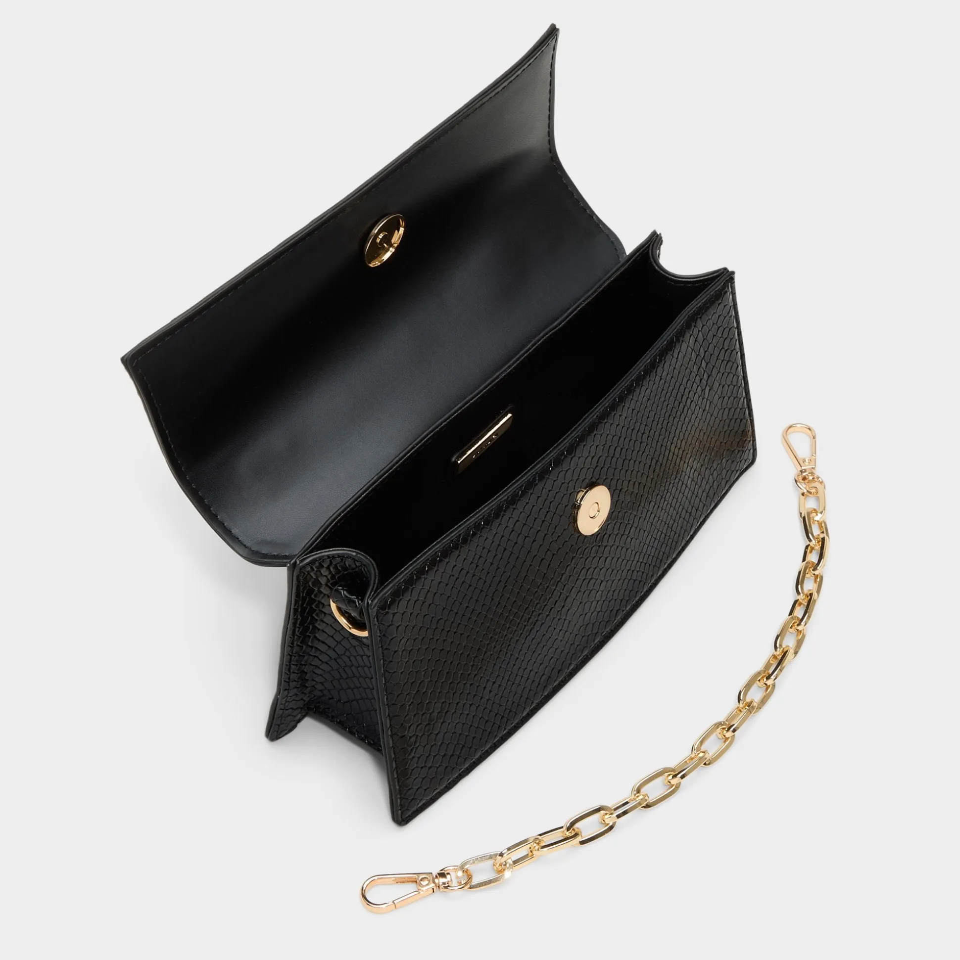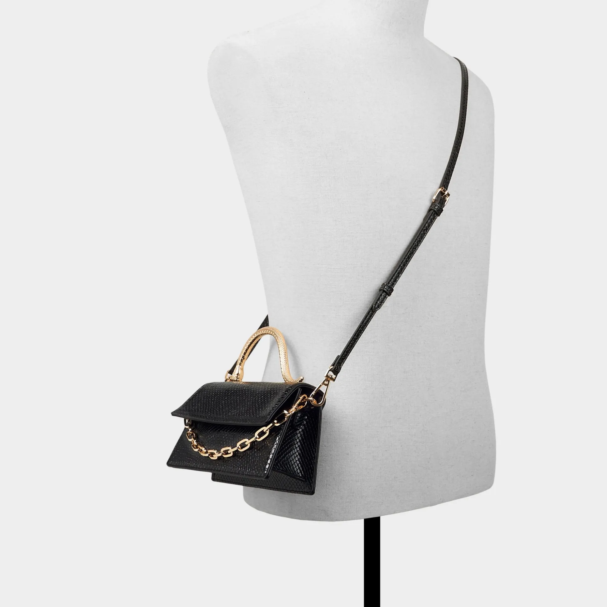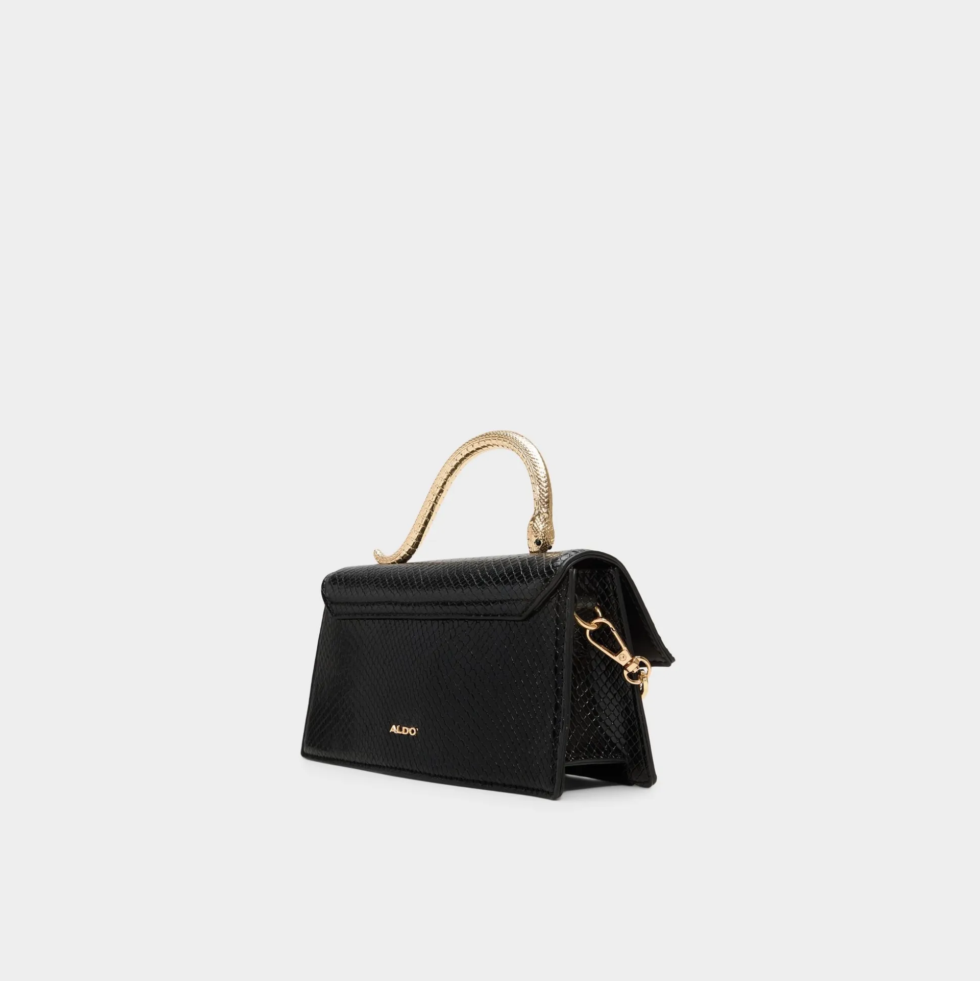 Midnight snake-embossed texture pairs with a sculptural gold handle to give this micro evening bag instant city-sleek glamour, and it shifts from a statement clutch to hands-free sparkle with effortless ease. Carry it with a satin slip for rooftop toasts, or sling it over a crisp blazer with jeans for after-dark polish.