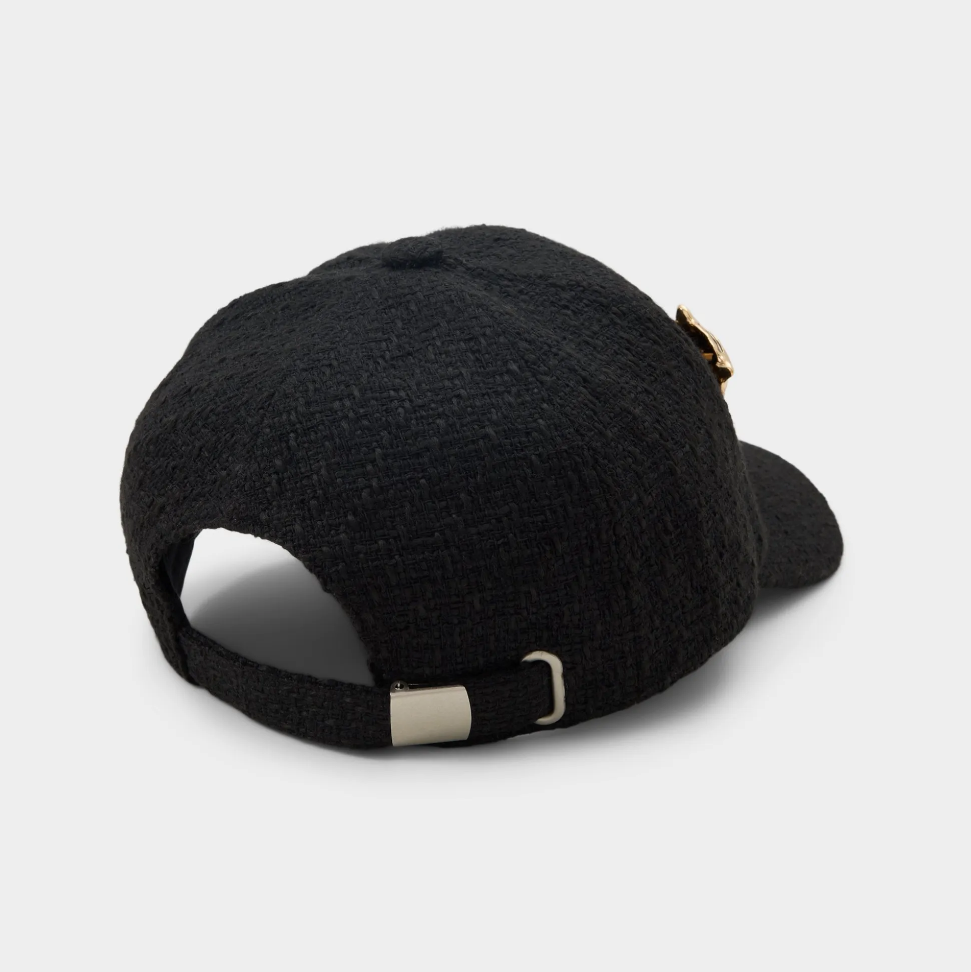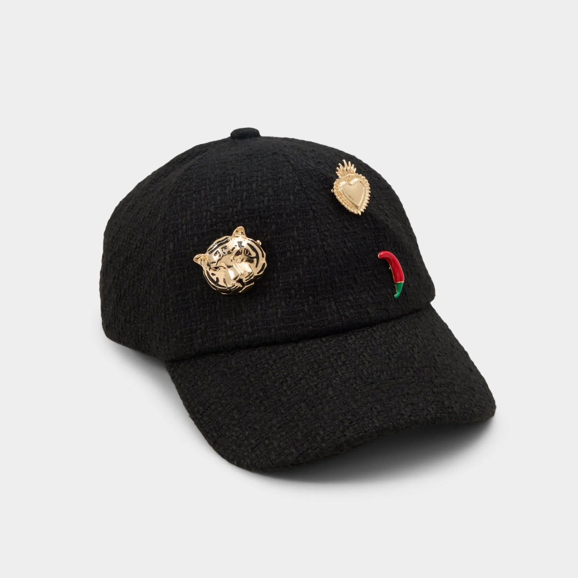 Glinting tiger, sacred heart, and tiny chili pins ignite this textured tweed cap, turning the everyday baseball silhouette into a mood-boosting statement you can adjust for just-right comfort. Top a wide-leg jumpsuit and sneakers for coffee runs or shade festival curls with it over a flowy romper, sealing carefree plans.