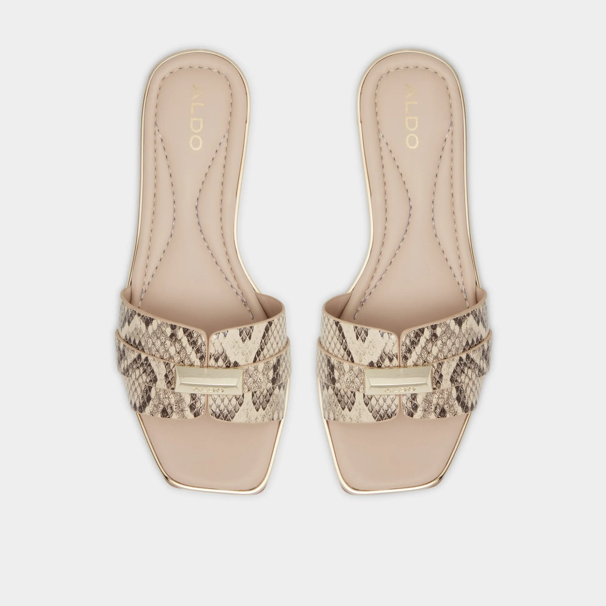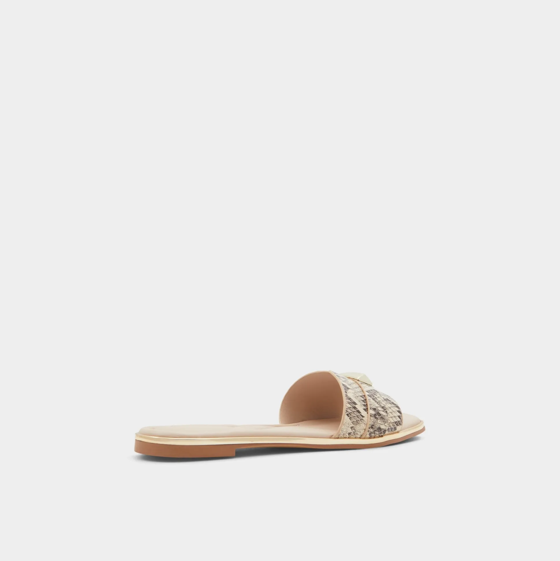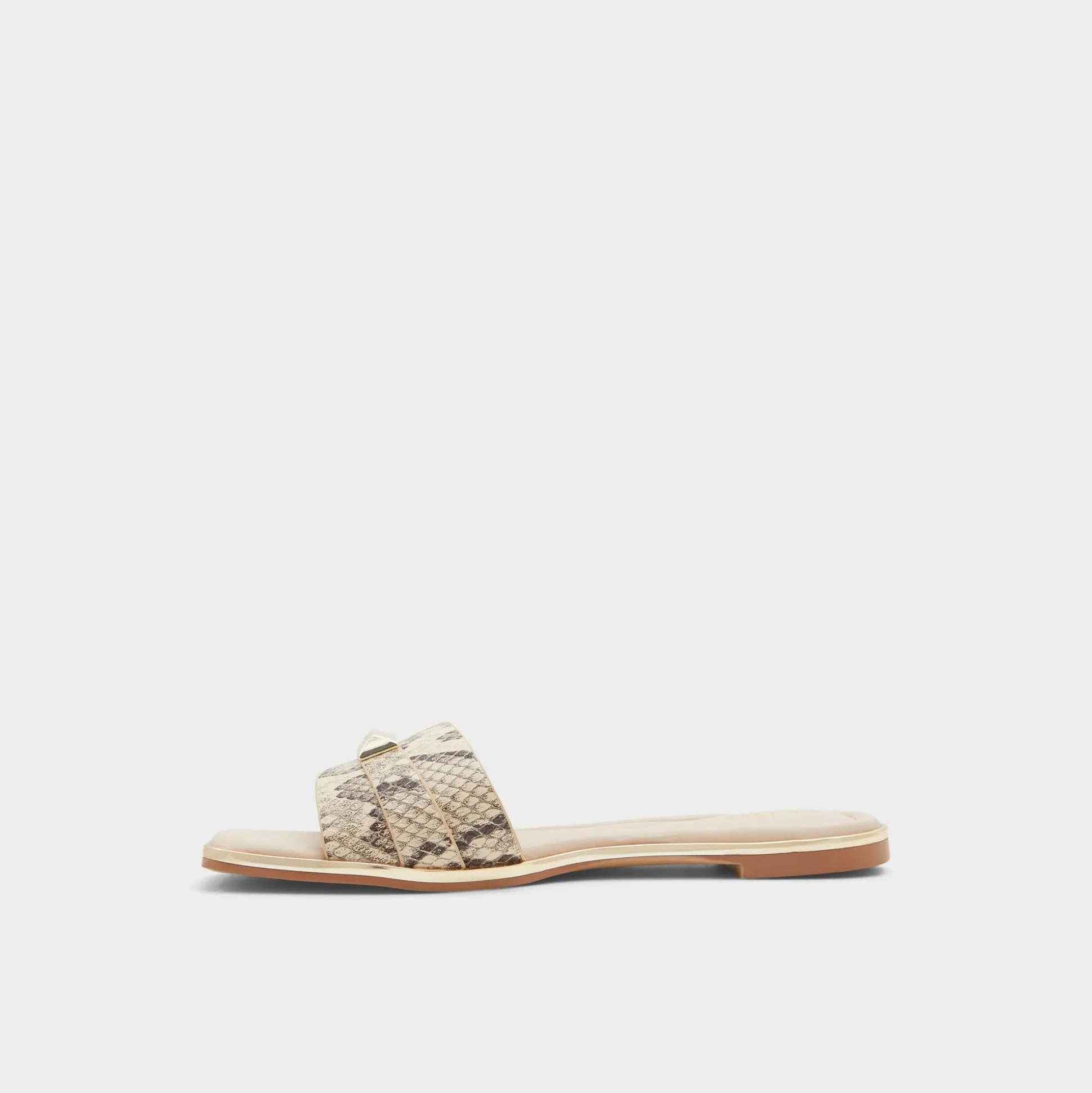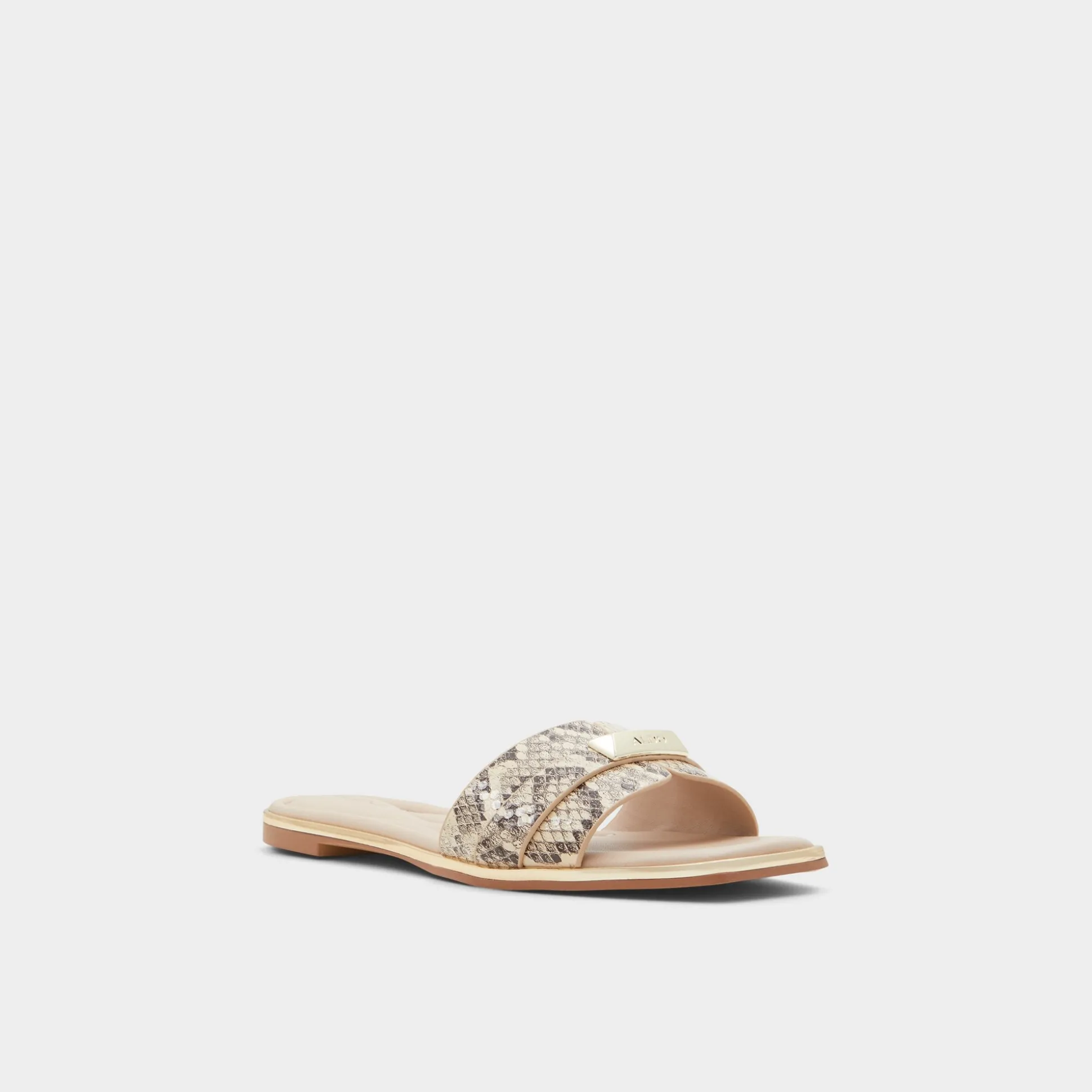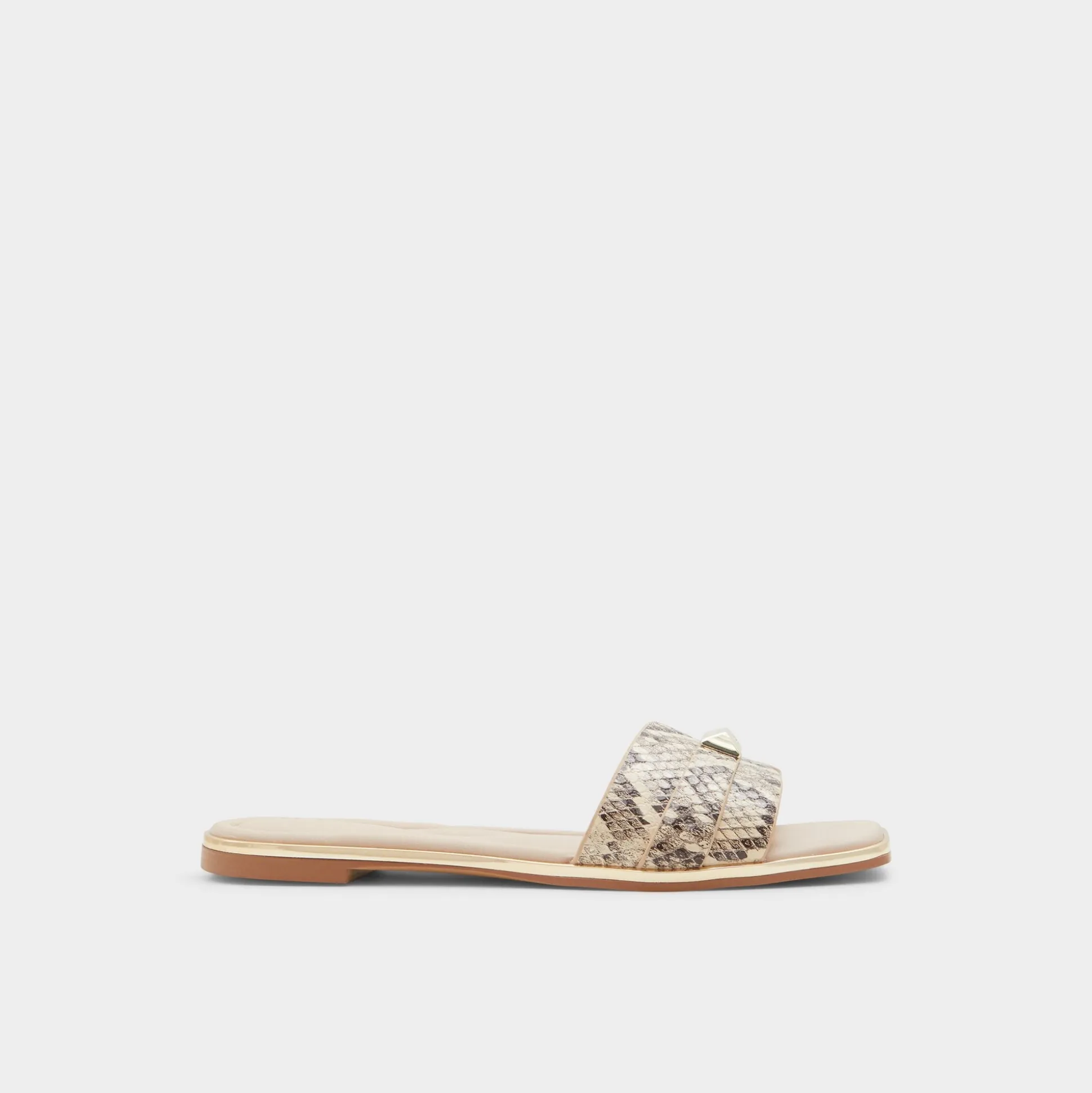 Snakeskin-patterned bands wrap the slide in untamed polish, their subtle gold gleam catching the city light, while flexible flat soles keep every step easy from sidewalk chatter to brunch lines. Pair with linen cropped pants for markets, or slip them under a satin midi when patio cocktails turn into starlit strolls.