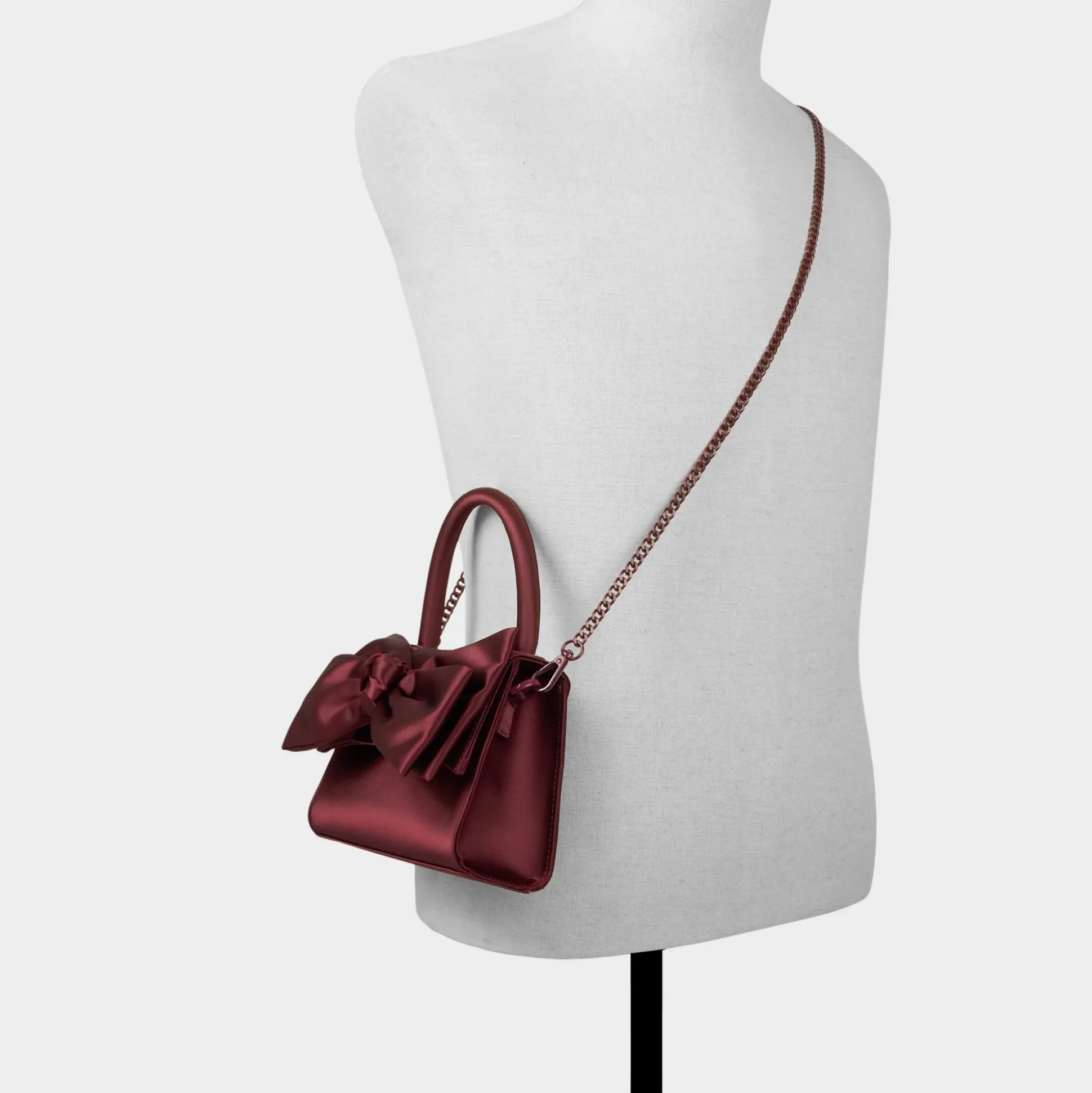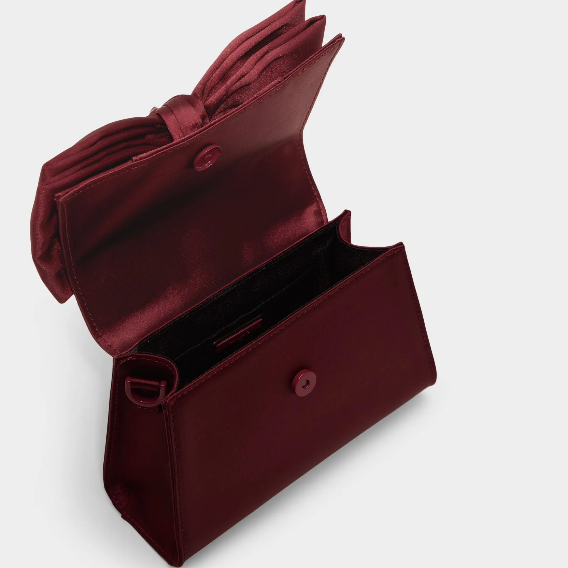 Plush satin bow shines on this structured mini top-handle, its deep burgundy wrapping like a gift and concealing an interior perfect for your phone, cards, and lip touch-up. Pair it with a slip dress for holiday parties or tuck against tailored suiting on date nights to complete the look.
