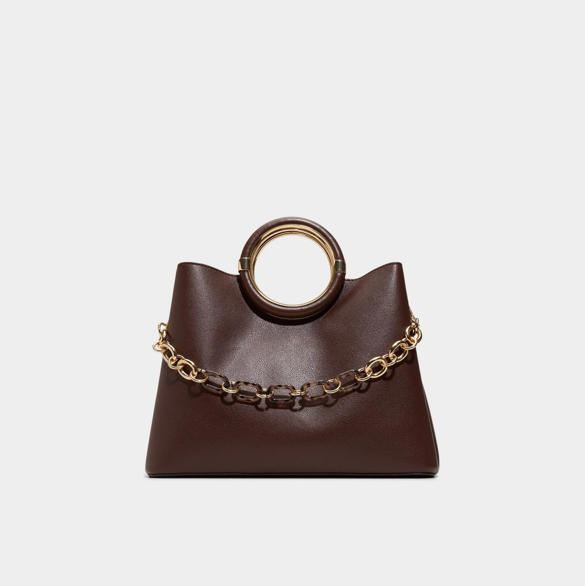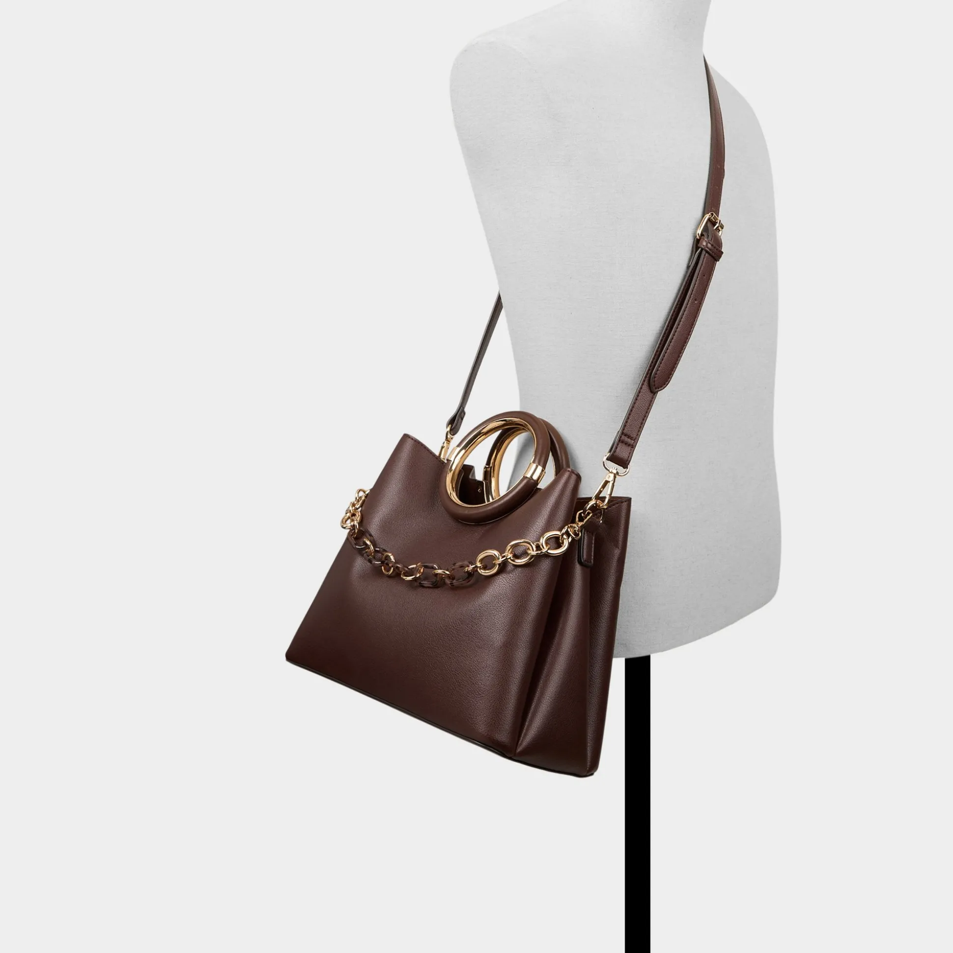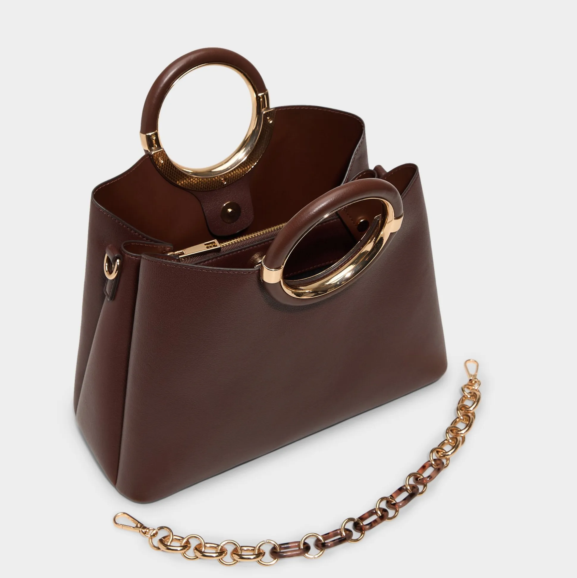 Espresso leather meets art-deco drama in this sculptural top-handle bag, where an oversized gold-rimmed ring handle and chunky chain drape turn every corner into a red-carpet moment during caffeine-fueled city days. Carry it with a power suit for client mornings or tuck it under a denim jacket for weekend errands, finishing looks with confident polish.