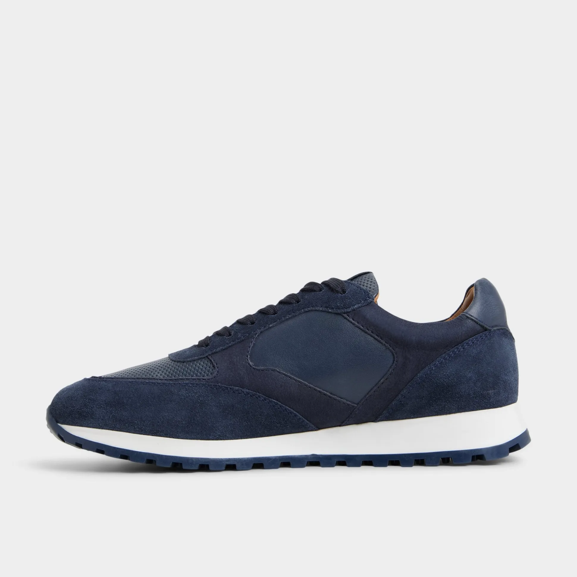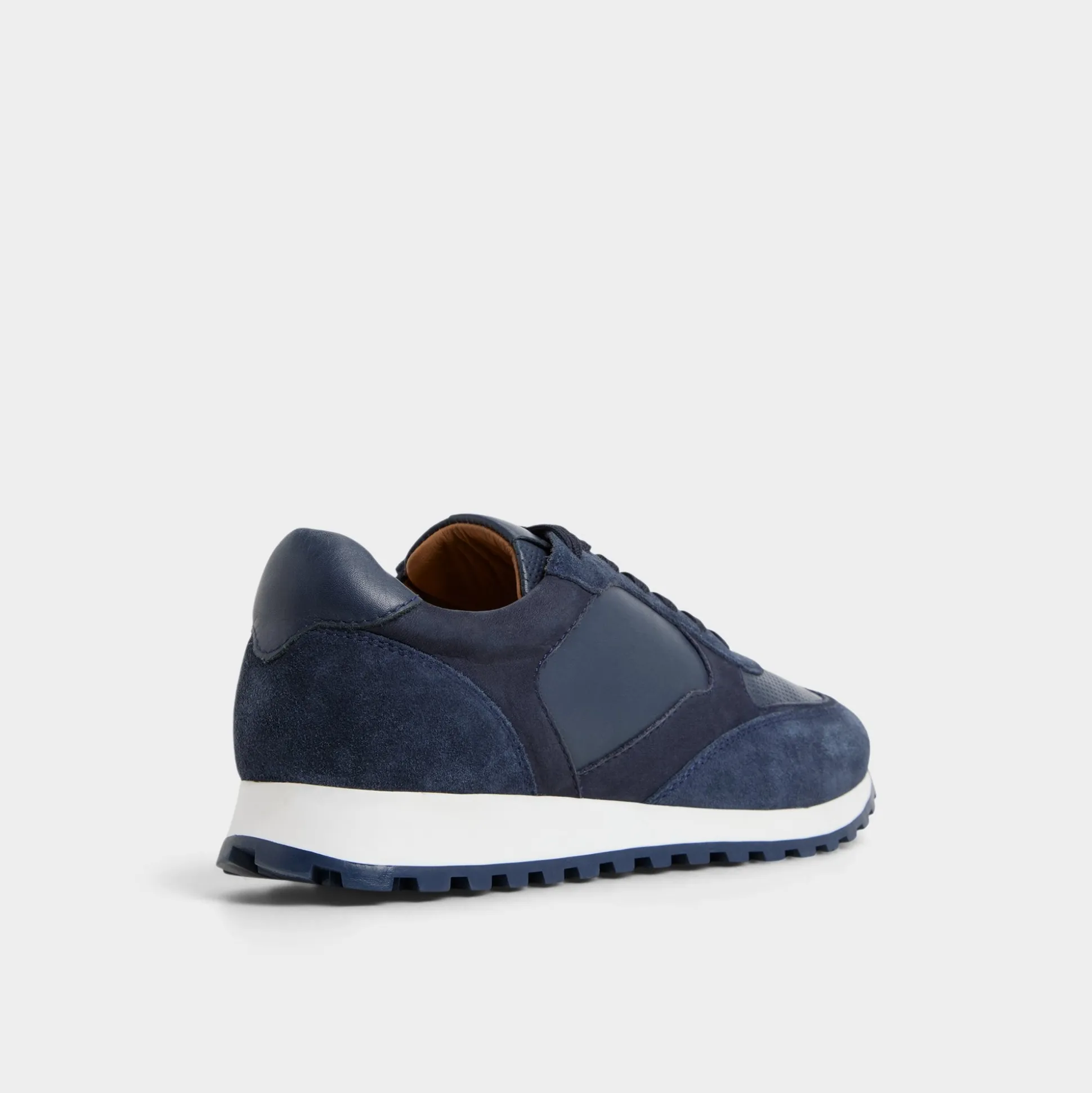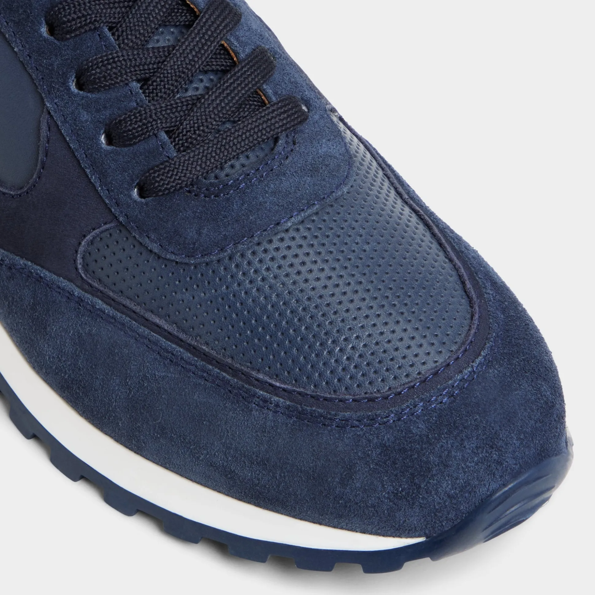 Midnight-blue suede pairs with smooth leather panels on this jogger, catching light across contrast textures as a cushioned rubber sole keeps daily miles easy and the silhouette ready for coffee runs or longer city strolls. Team it with cuffed chinos for patio brunches, or roll with jogger pants on red-eye flights.