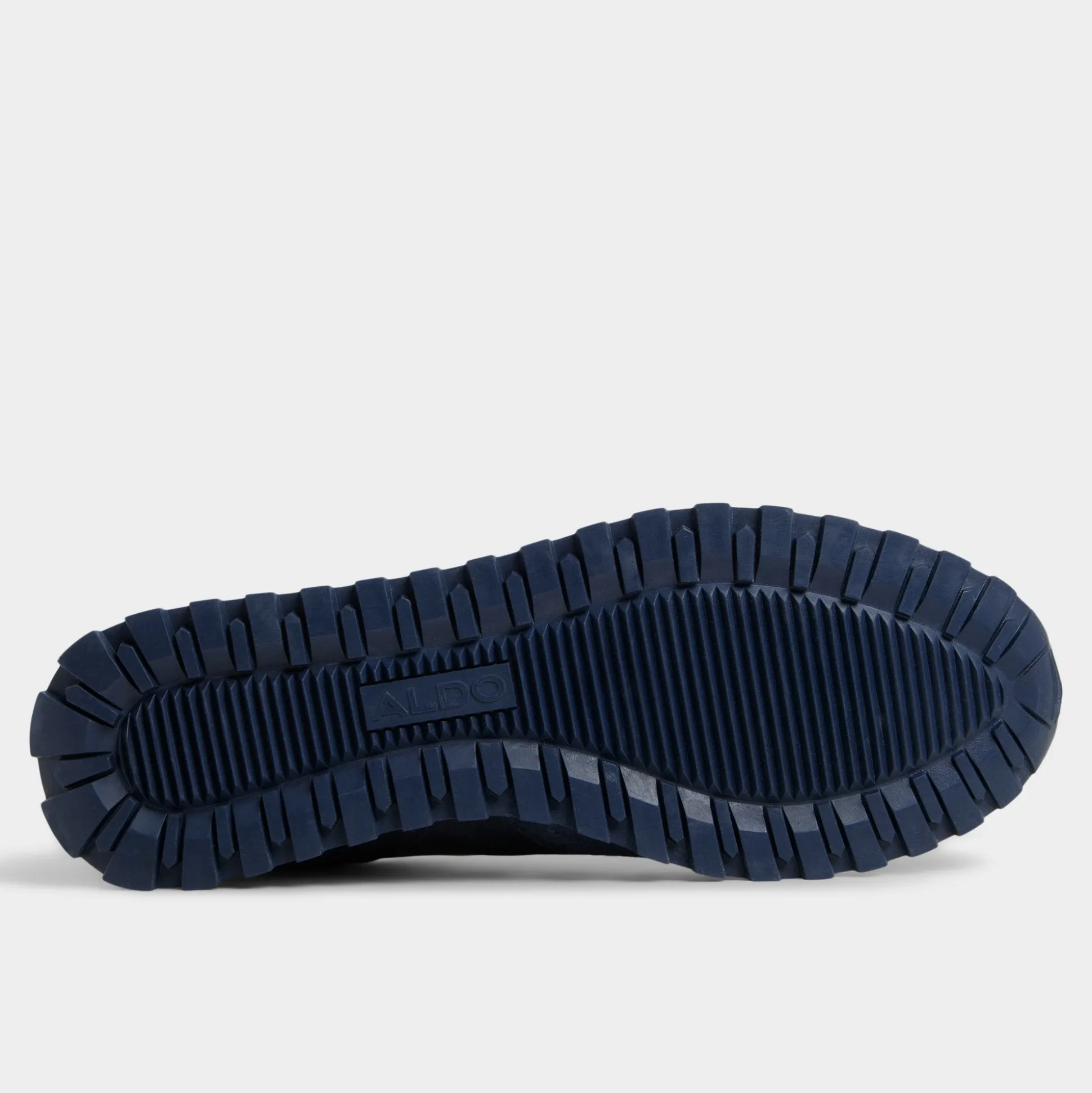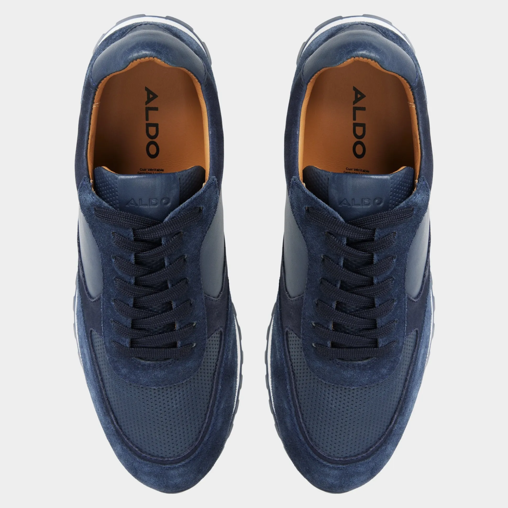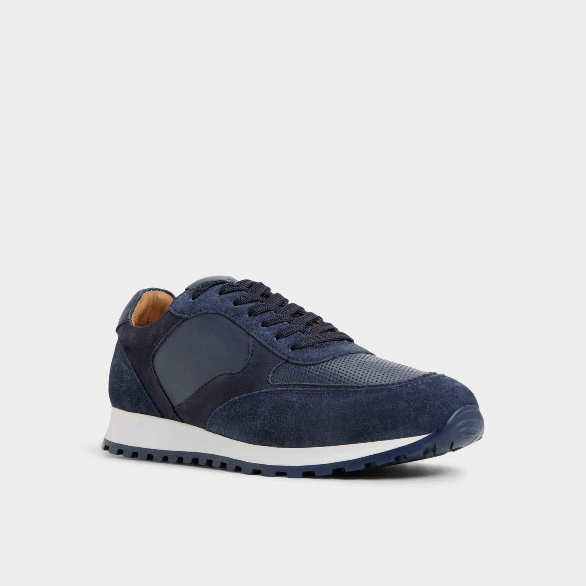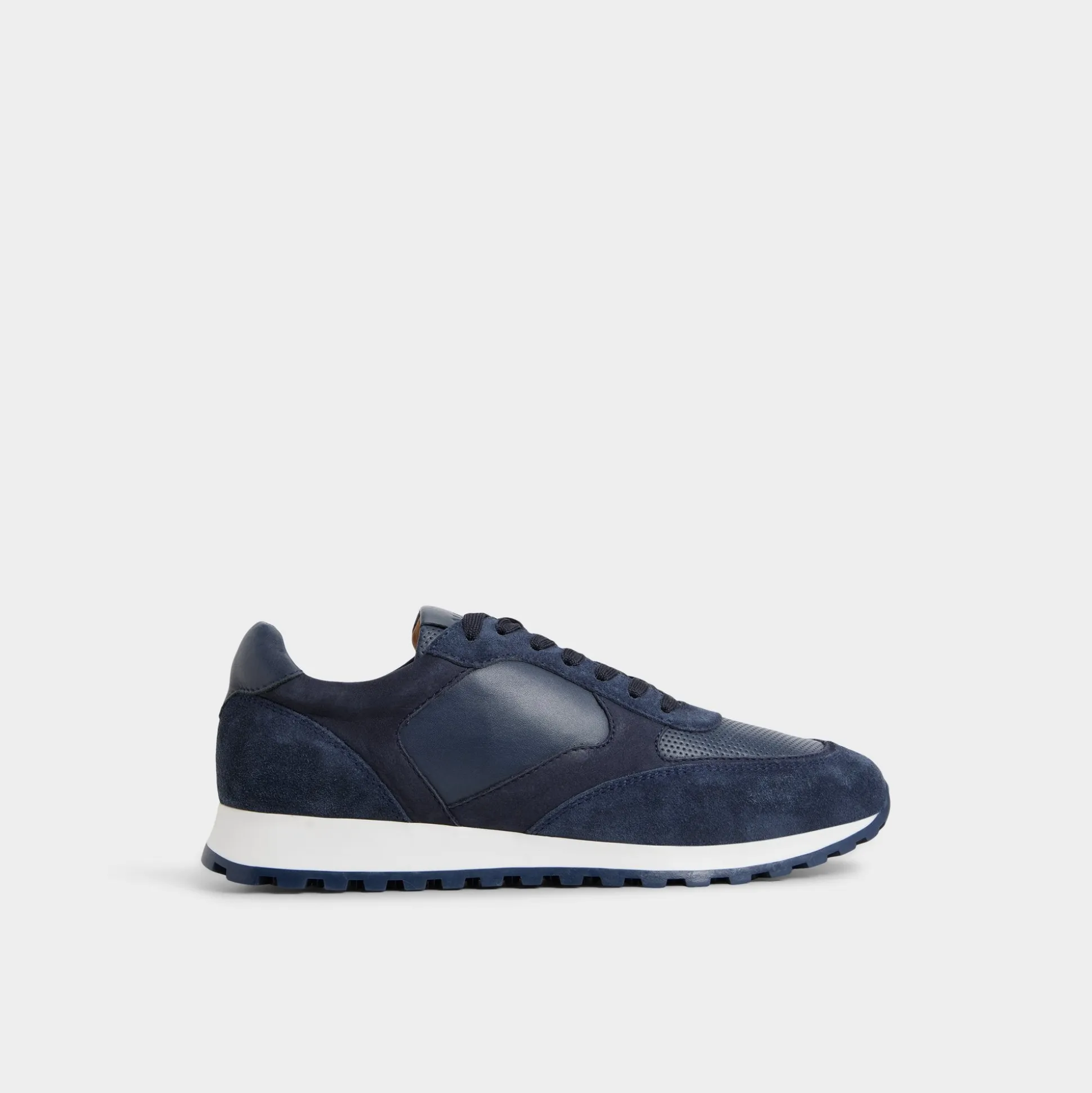 Midnight-blue suede pairs with smooth leather panels on this jogger, catching light across contrast textures as a cushioned rubber sole keeps daily miles easy and the silhouette ready for coffee runs or longer city strolls. Team it with cuffed chinos for patio brunches, or roll with jogger pants on red-eye flights.