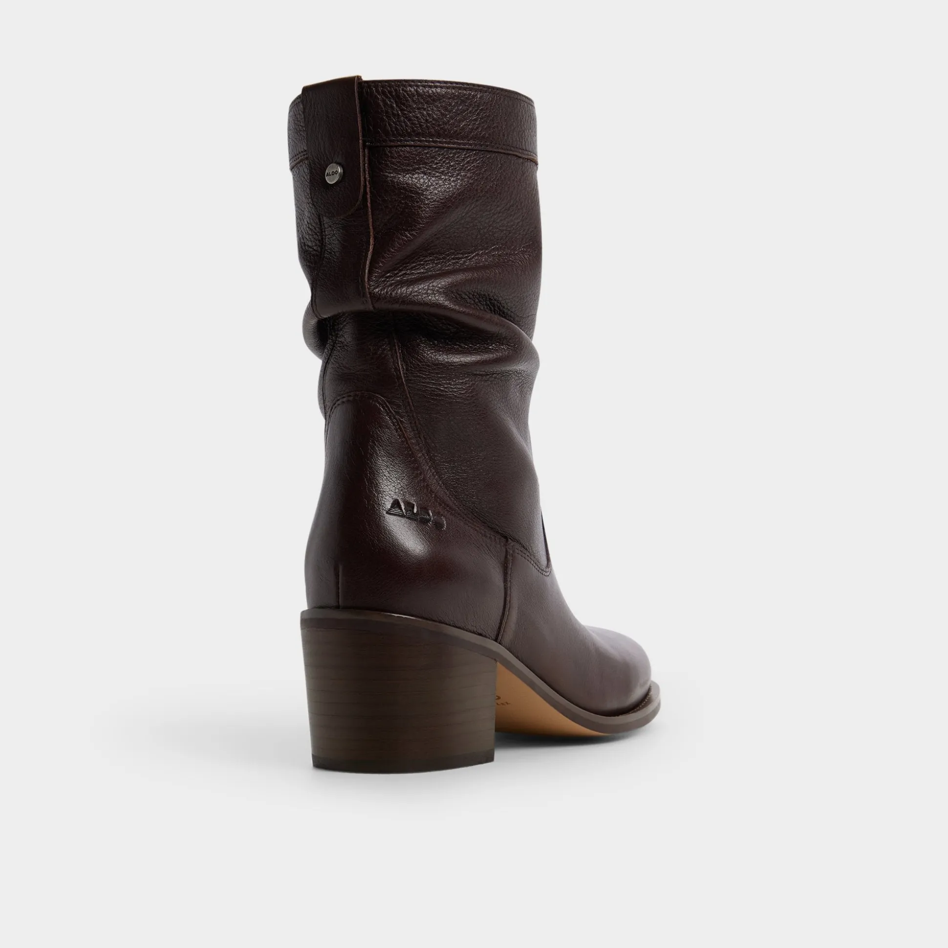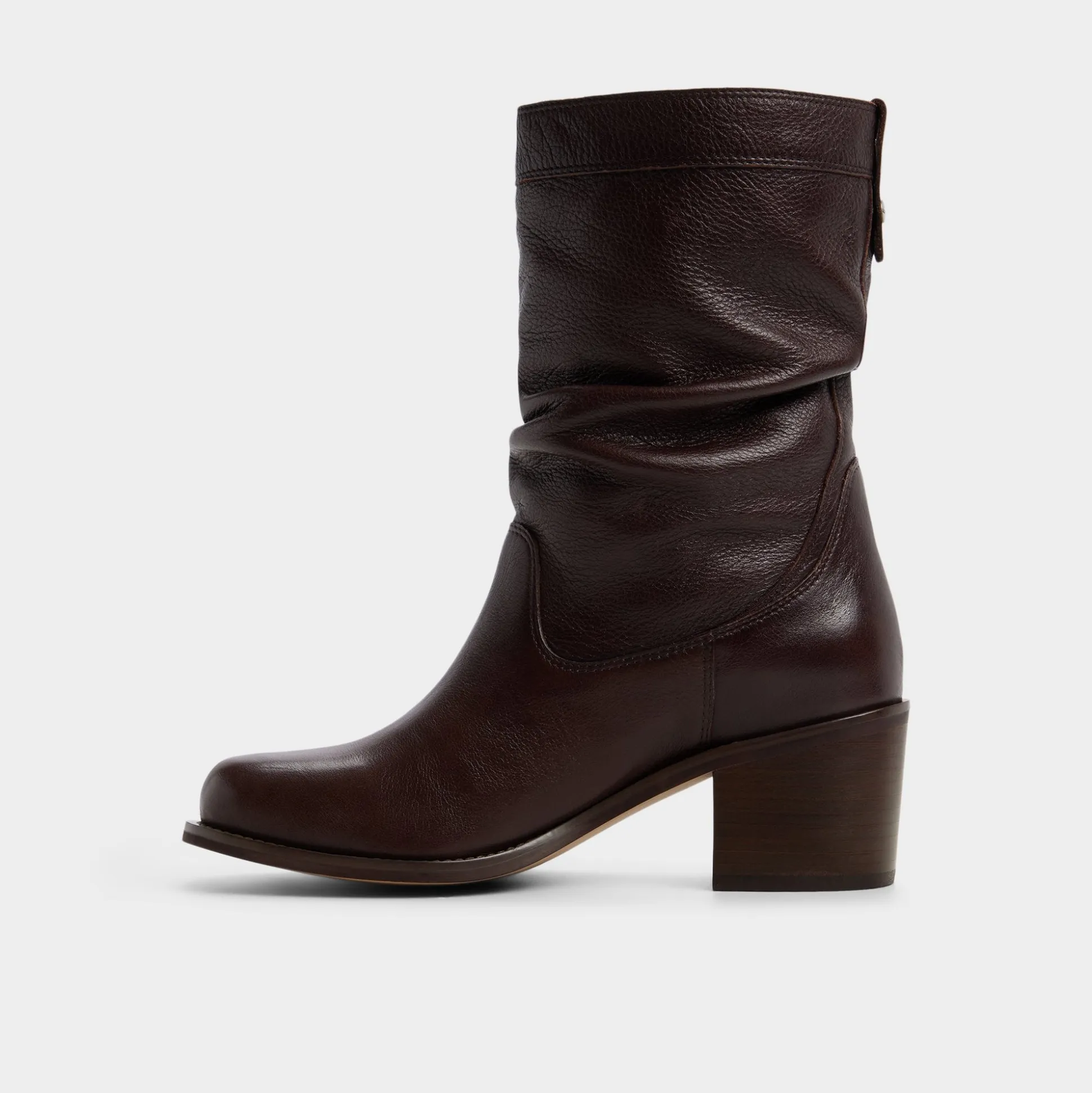 Cocoa leather drapes into a graceful slouch around the calf, pairing with a soft lining and a sculpted stacked block heel that brings steady comfort to brisk commutes and cafe check-ins. Pair with skinny denim for gallery afternoons, or ground a cozy sweaterdress for late-night ramen runs.