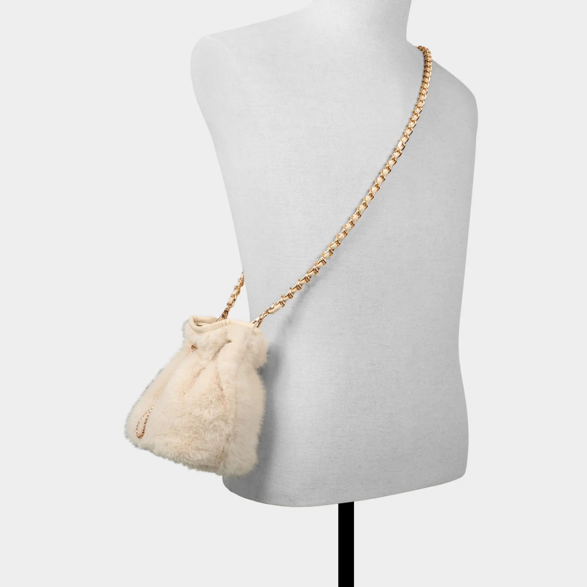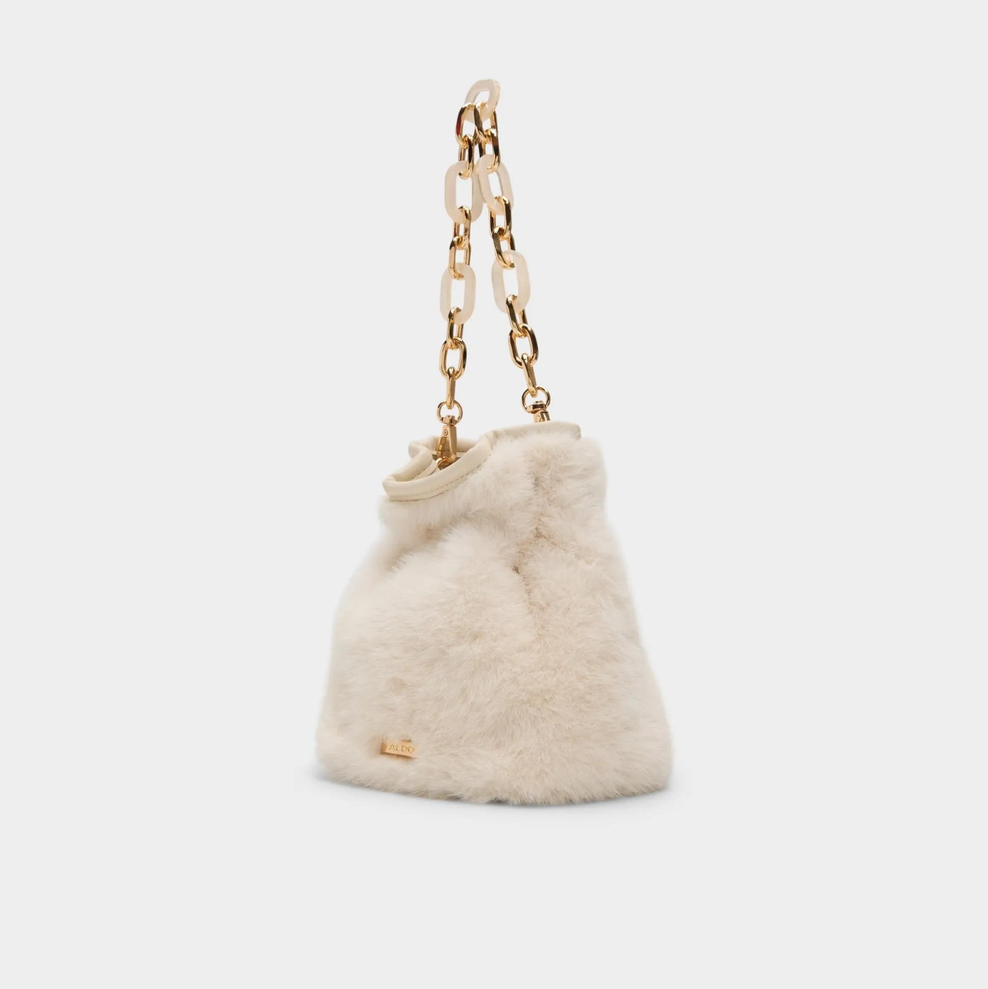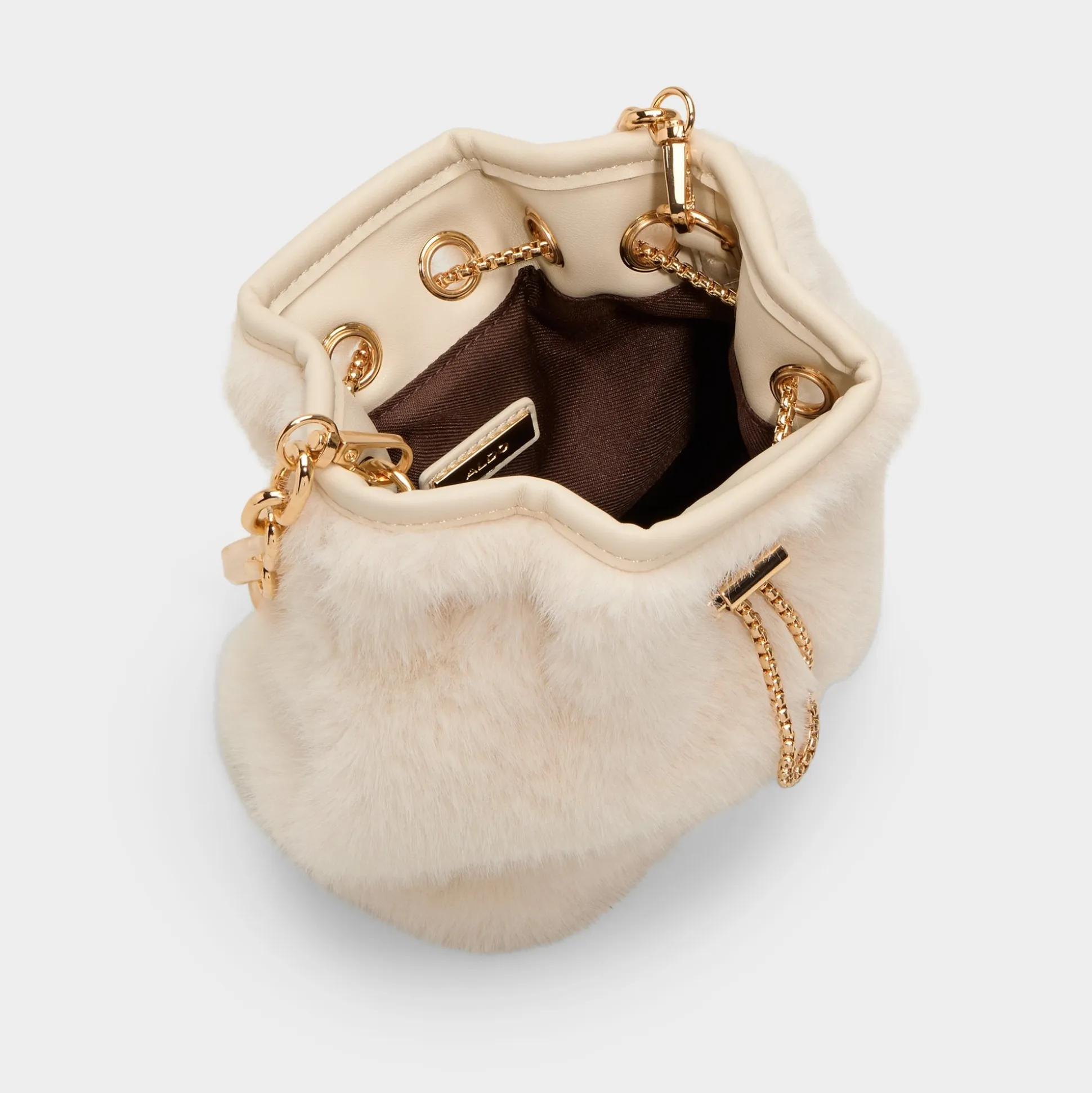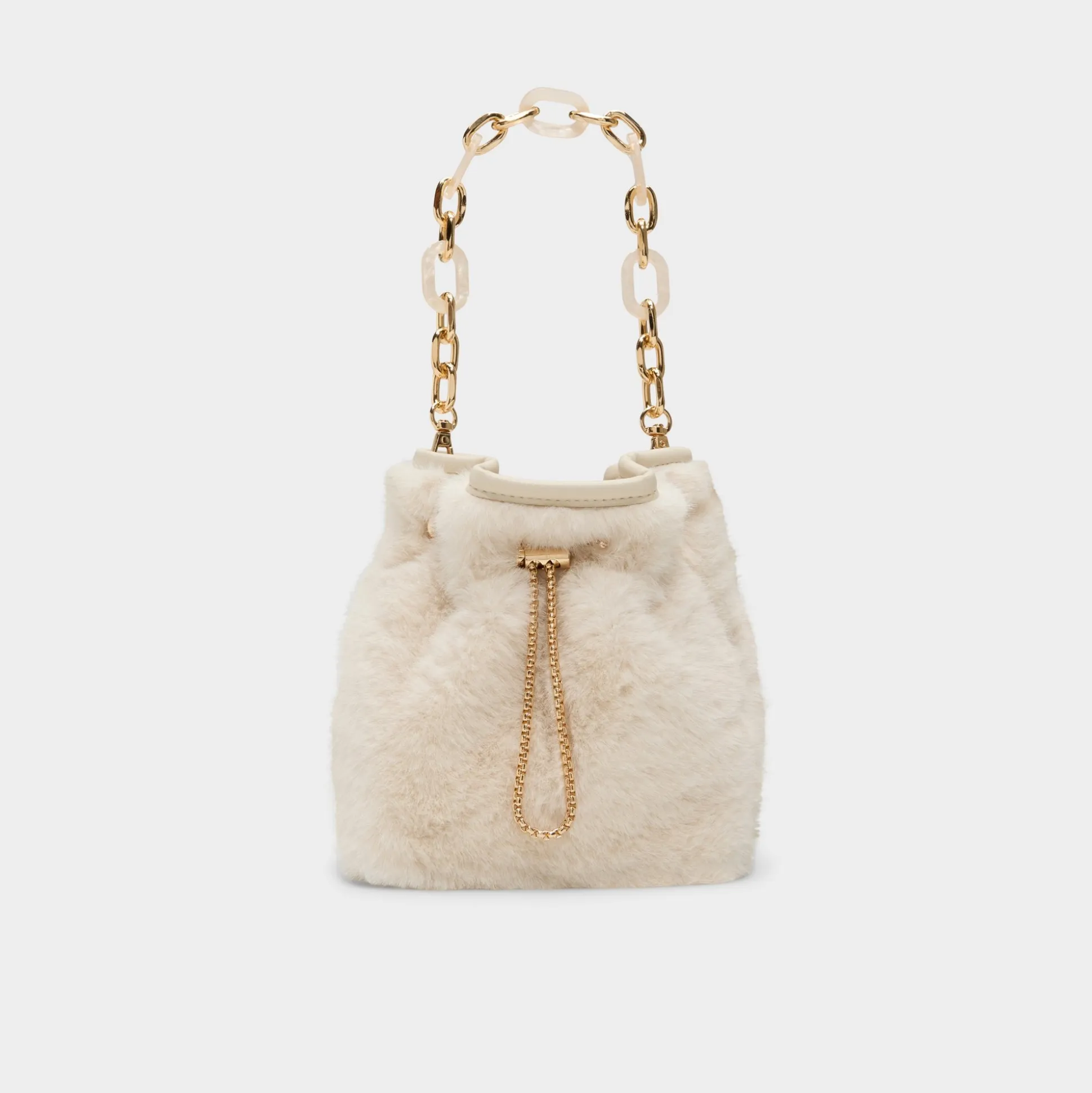 Plush faux fur swathes this bucket bag in apres-ski luxe, while an oversized gold-link handle steals the scene like wearable jewelry, the bold design cue that instantly elevates a look from casual to chic. Pair it with ribbed knits for casual meetups or drape it over a satin mini for festive gatherings, finishing the look with effortless city-polish.