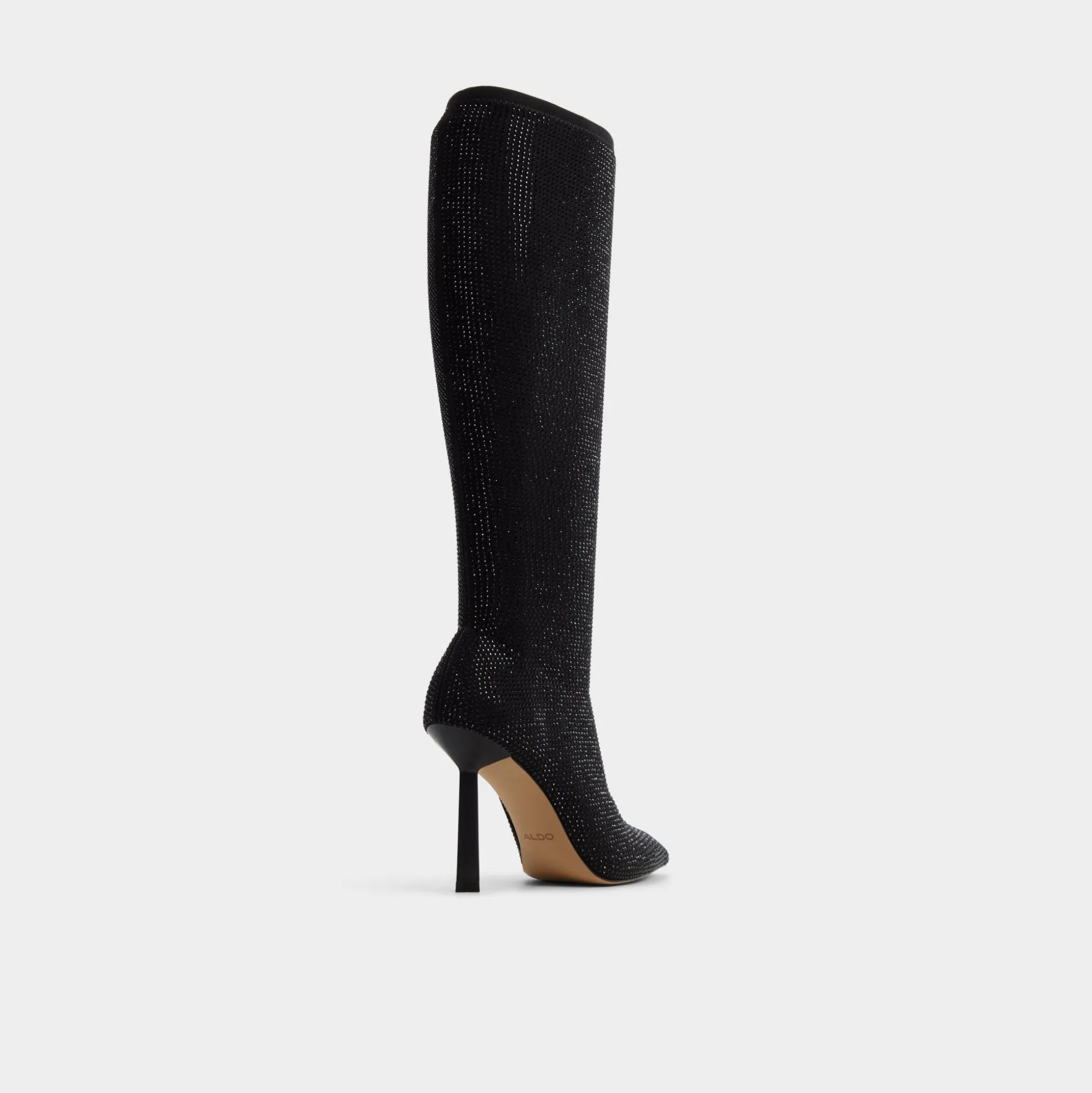 Jet-black micro crystals cloak this knee-high boot’s sleek shaft and stiletto, turning every step into a walking light show that boosts confidence after last call and keeps you gliding through the night with effortless poise. Pair with velvet mini at parties, or layer over jeans when dinners stretch into dance floors.