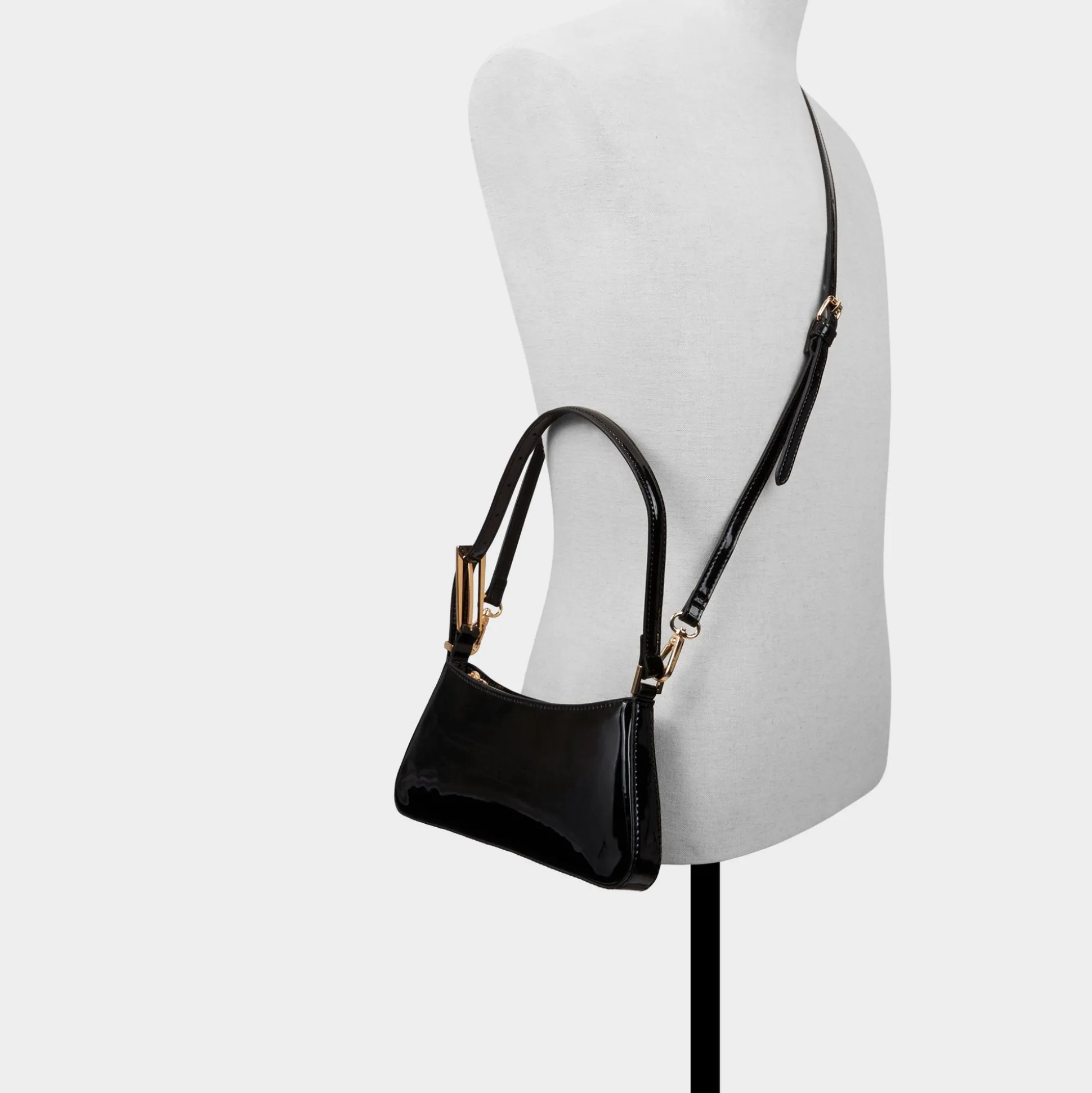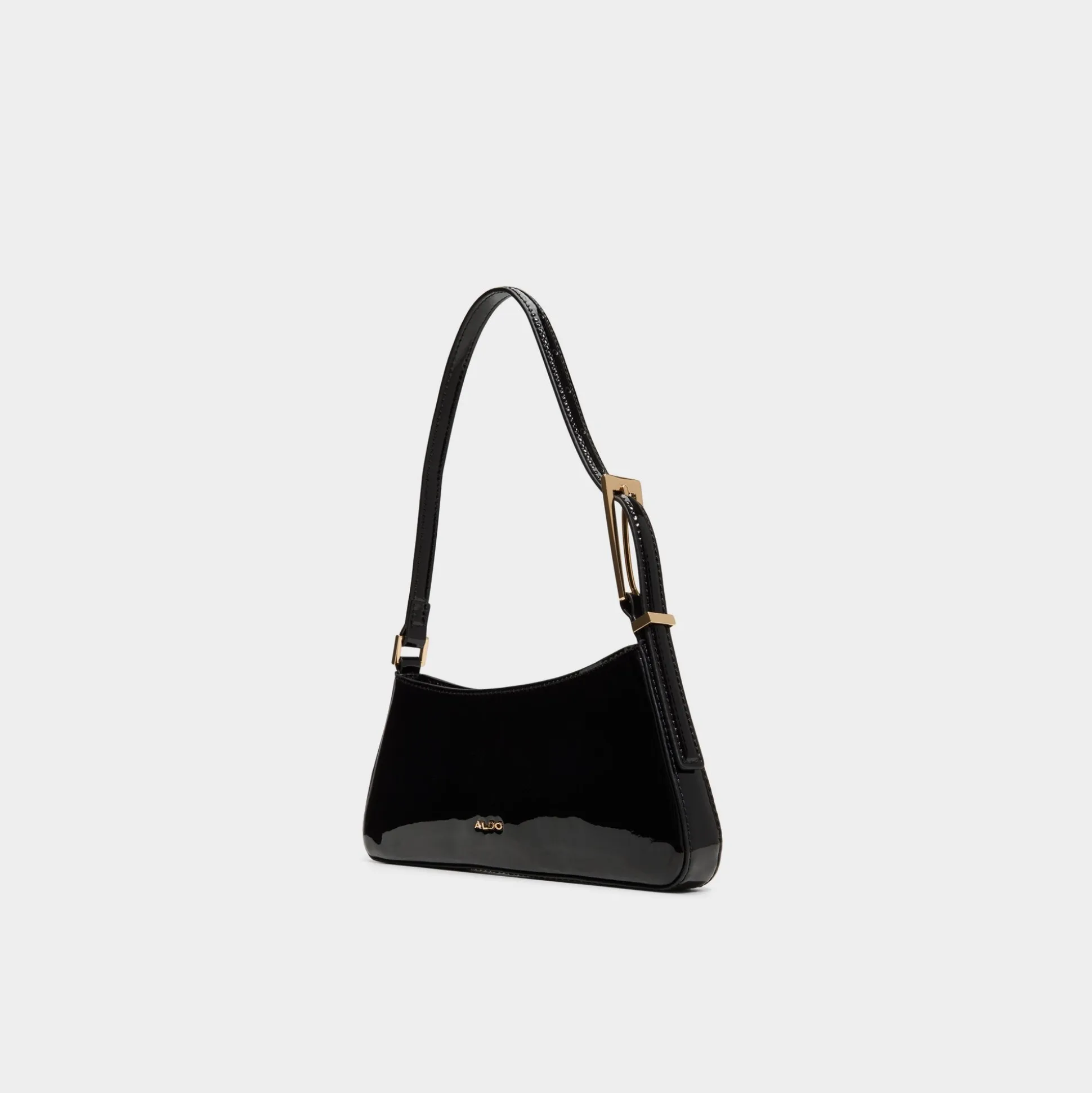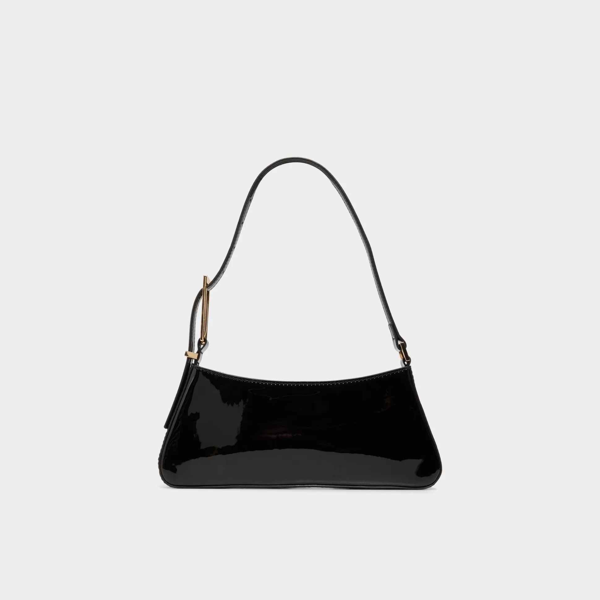 High-gloss patent leather adds shine to this slim baguette, its trapezoid silhouette framed by tonal stitching and gold hardware, all zipped tight for minimalist nights. Tuck it under a satin blazer for gallery openings or sling it over a ribbed tank and cargos for late-night bites.