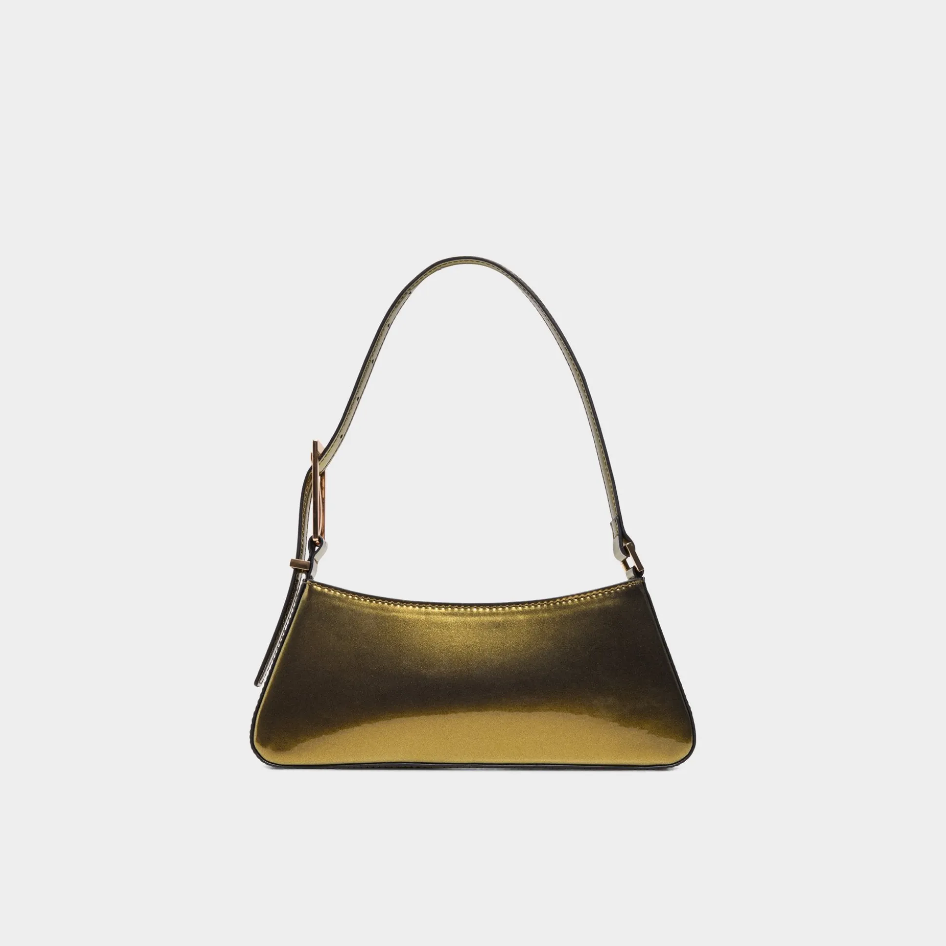 Molten-metal shine elevates this shoulder bag, hugging close under your arm as tonal stitching sculpts a sleek silhouette and a discreet zip keeps essentials secure, turning city moments into a small, radiant statement. Carry it with a silky slip for rooftop parties or sling it over denim after hours, finishing outfits with a confident, wearable glow.