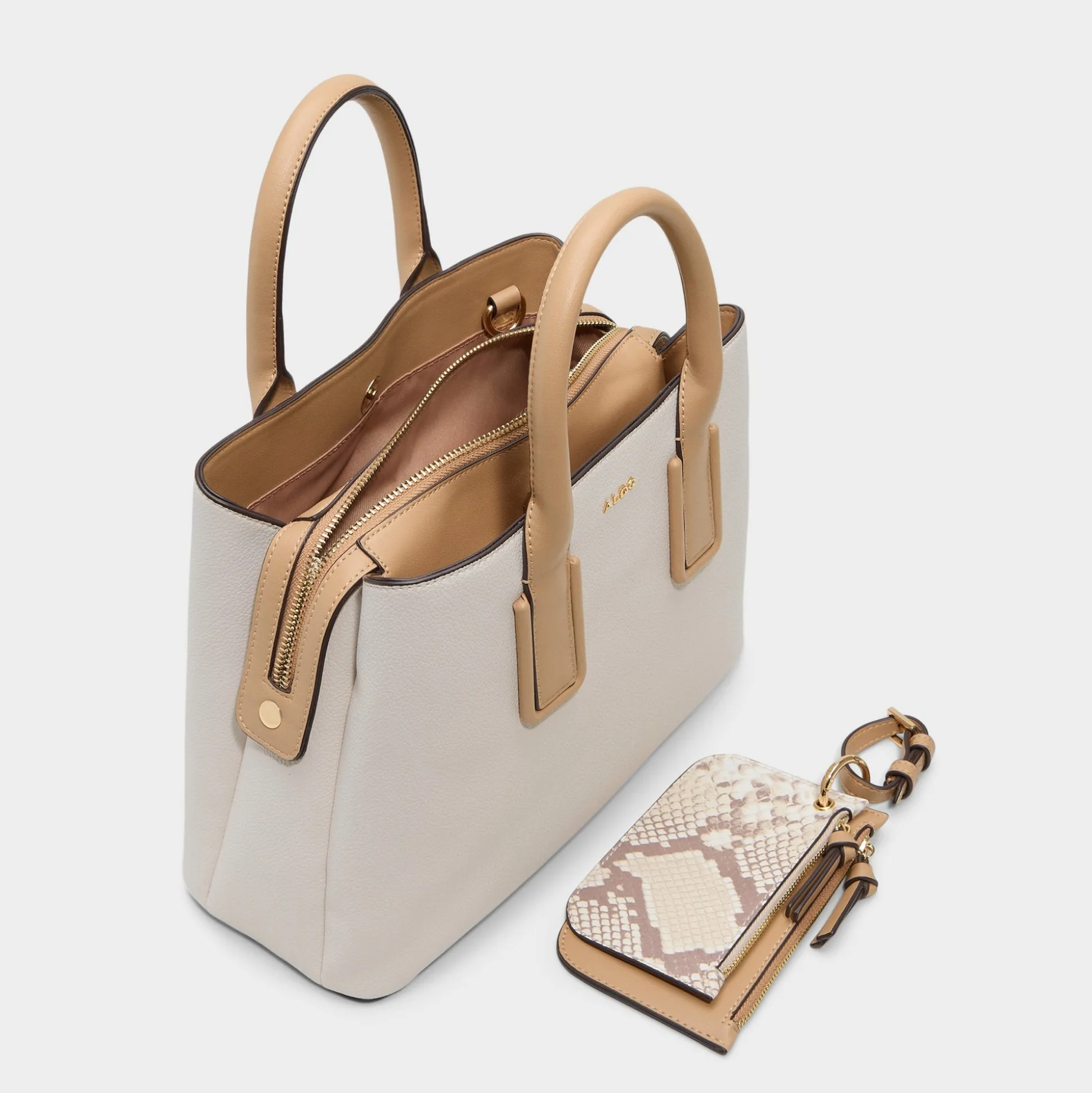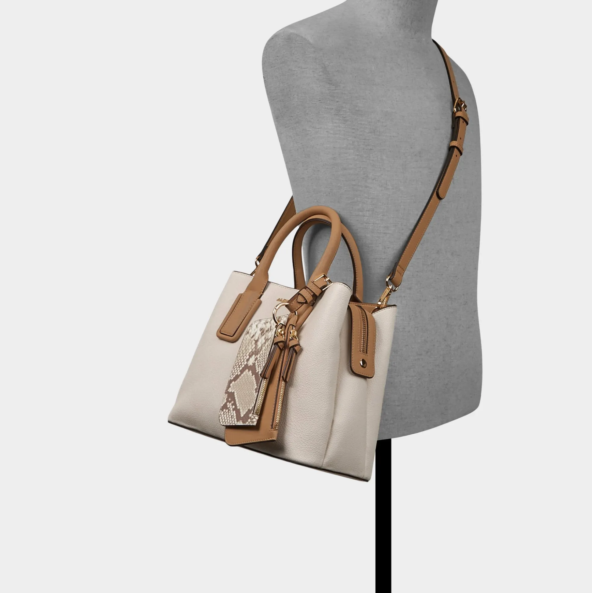 Snakeskin-printed pouch dangles from this beige satchel, detaching with a quick clip so the main bag stays polished while the pouch goes solo, adding a playful, texture-rich twist to everyday moments. Carry it to meetings with tailored separates or sling it over weekend denim for effortless, city-ready finishes.