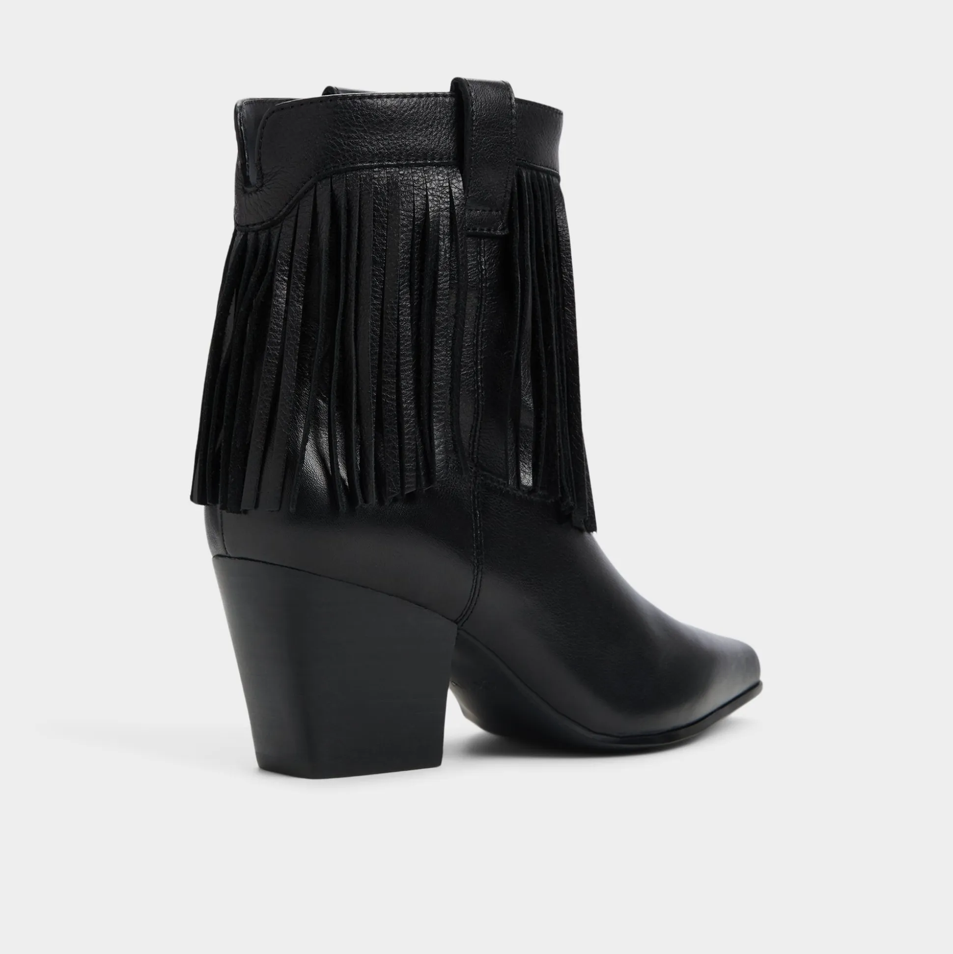 Fringe-trimmed supple black leather blooms around a pointed toe block heel, blending Western swagger with city polish in a statement silhouette that moves with you from street-ready errands to after-dark moments. Pair with cropped flares for record-store Saturdays, or swap in a swishy midi when festival nights call for extra rhythm.