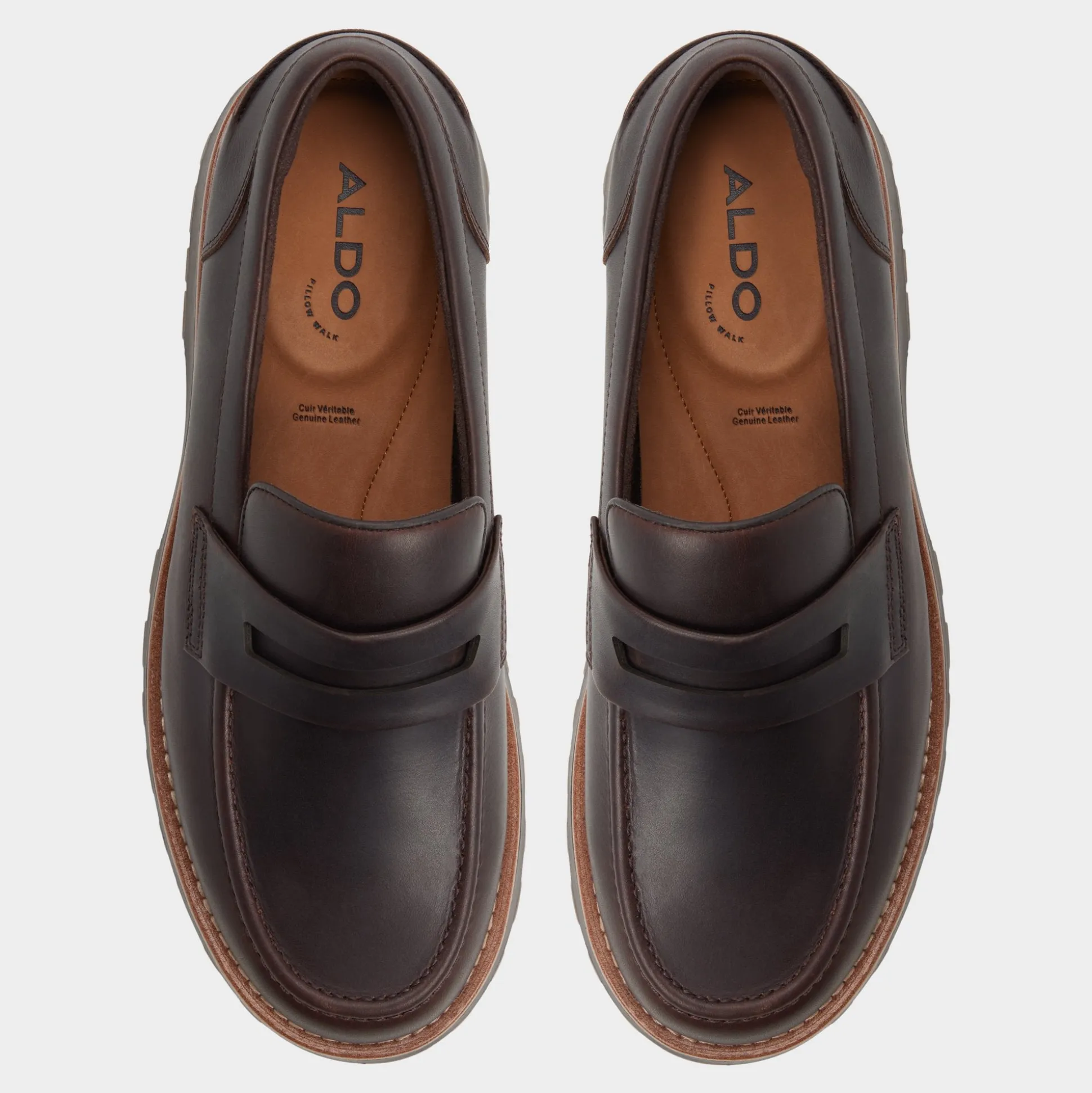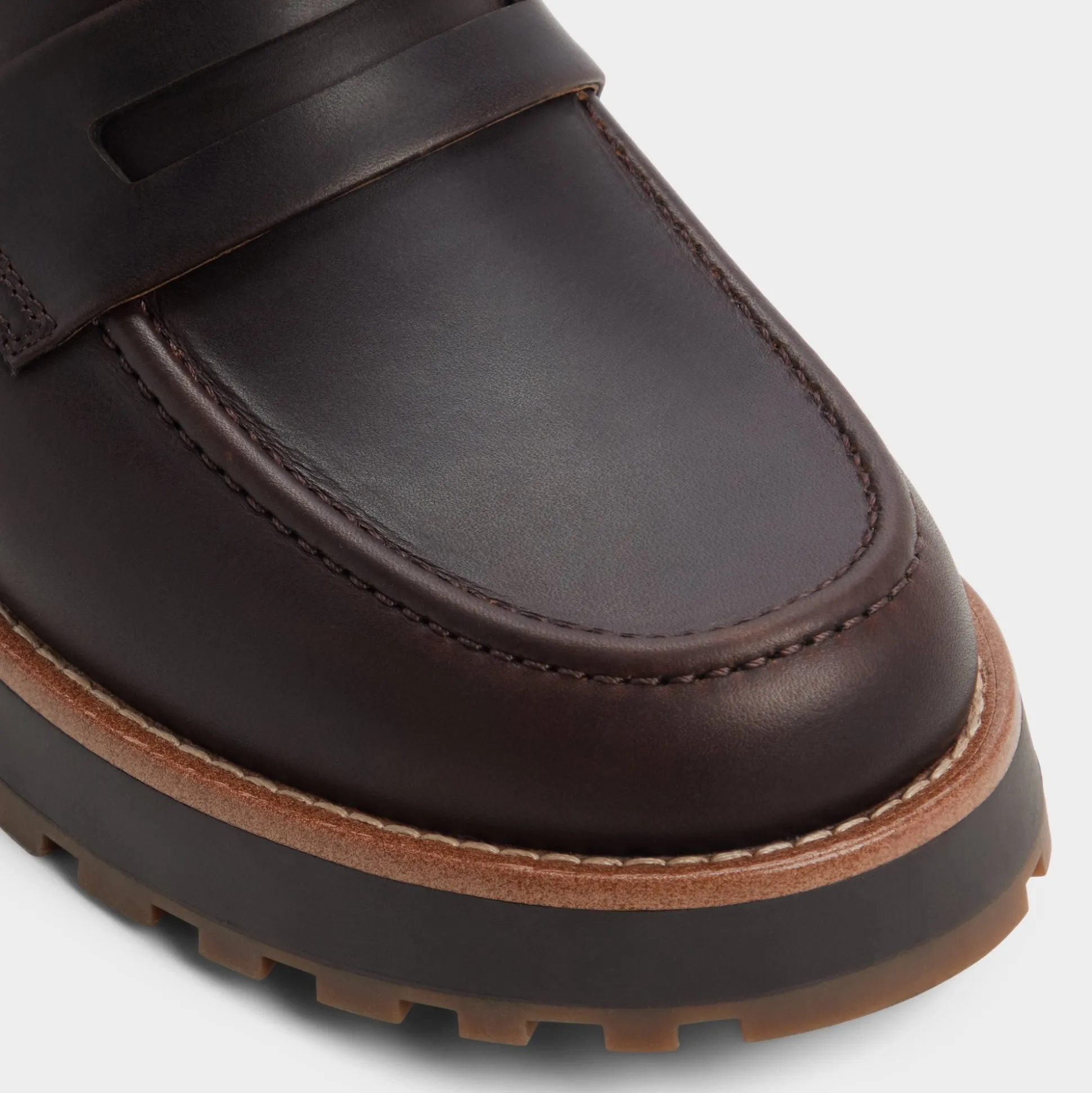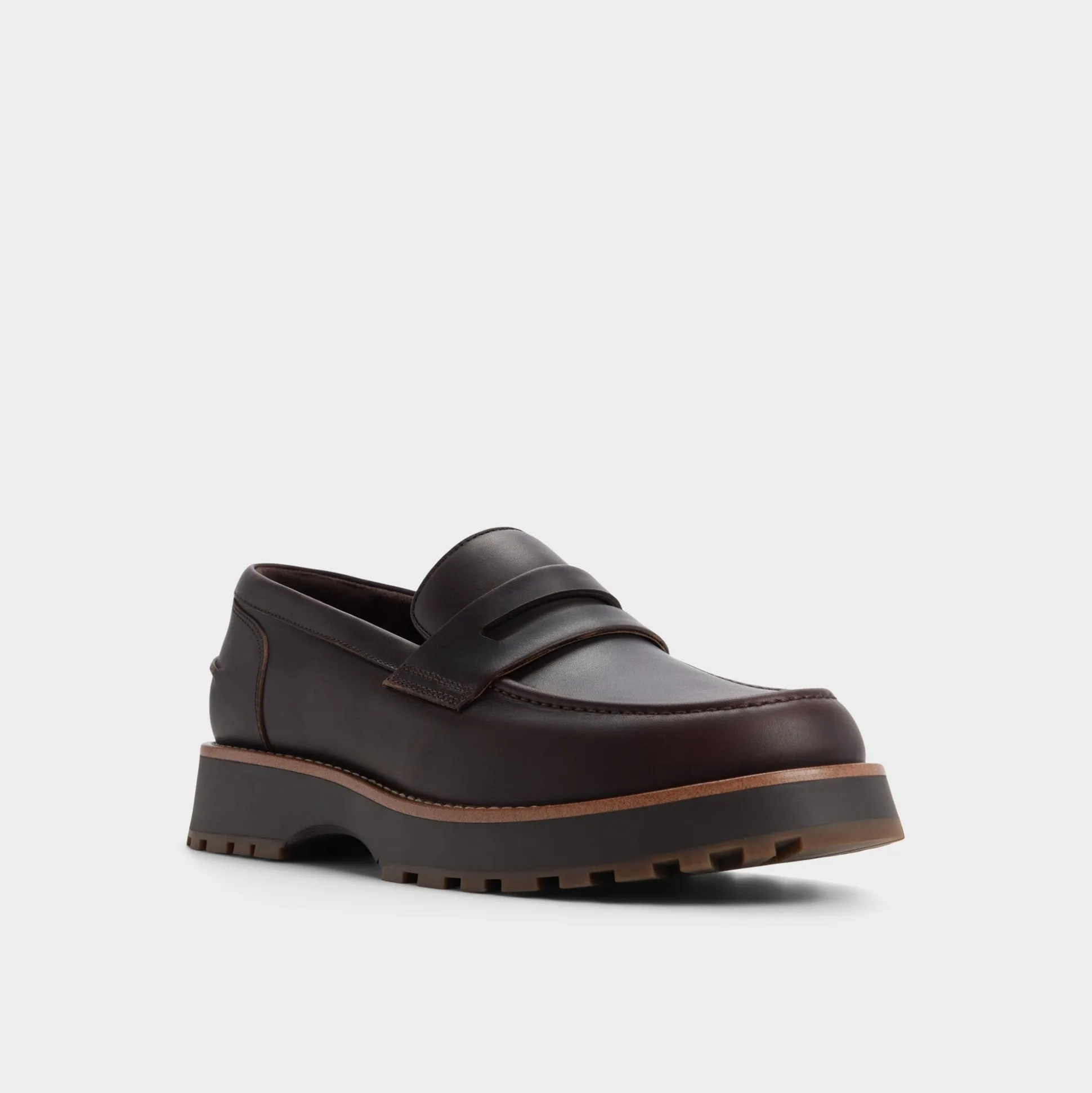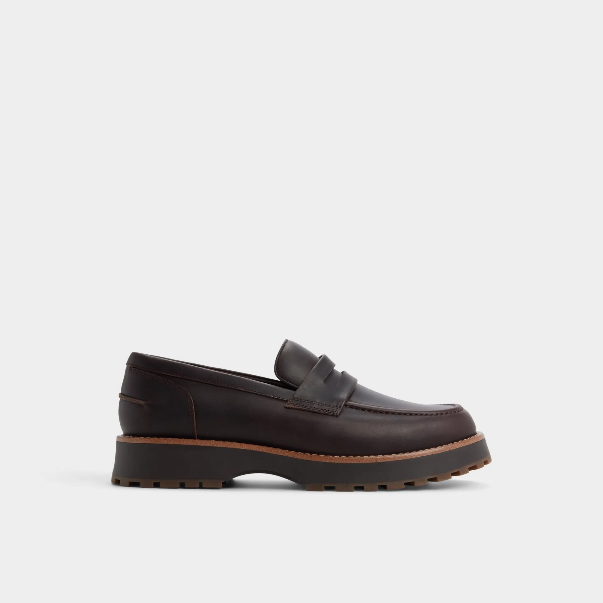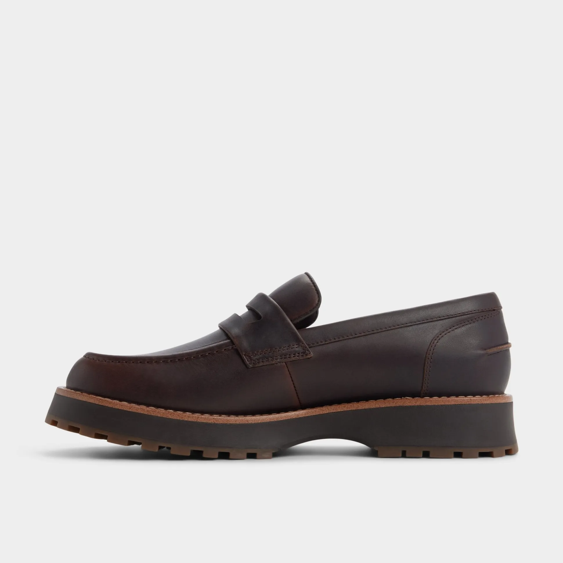 Rugged brown leather meets a substantial lugged rubber sole in this penny loafer, balancing trail-ready grip with office polish, while a cushioned leather lining keeps comfort steady from early sessions to late-night commutes. Pair it with cuffed corduroys for Friday discussions, or tuck them beneath a relaxed navy suit for evening rooftop meet-ups.