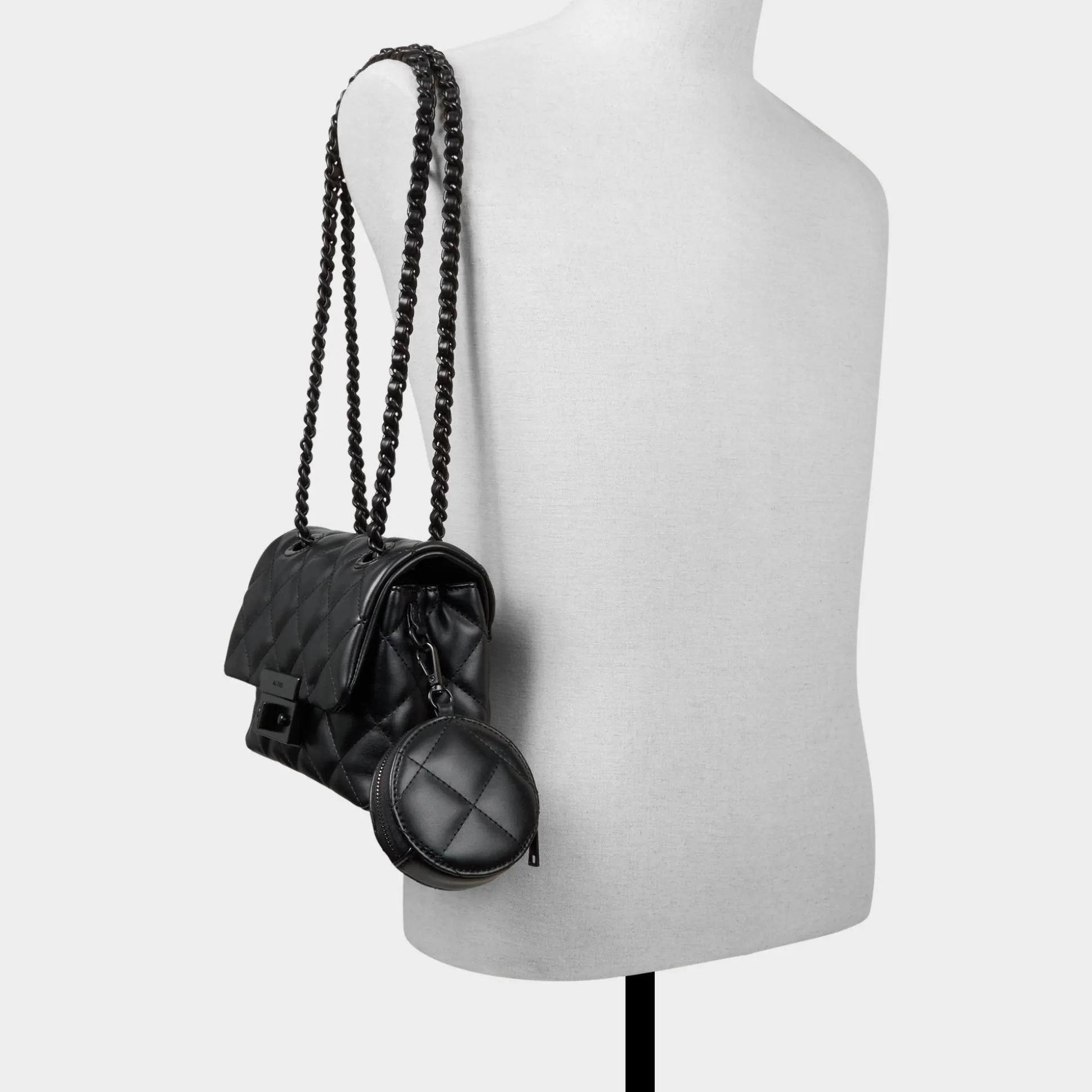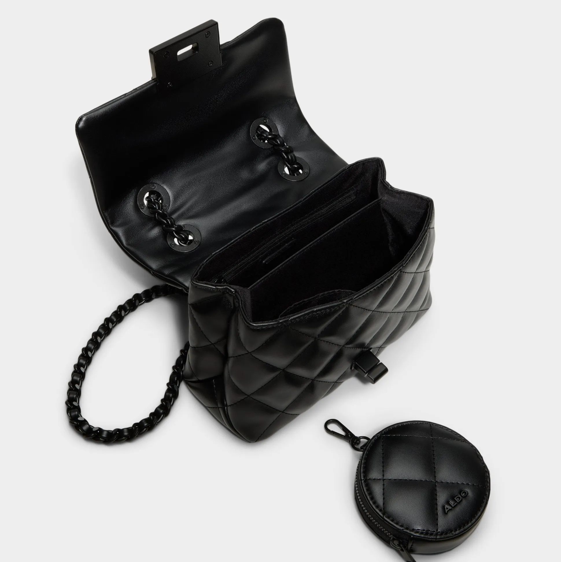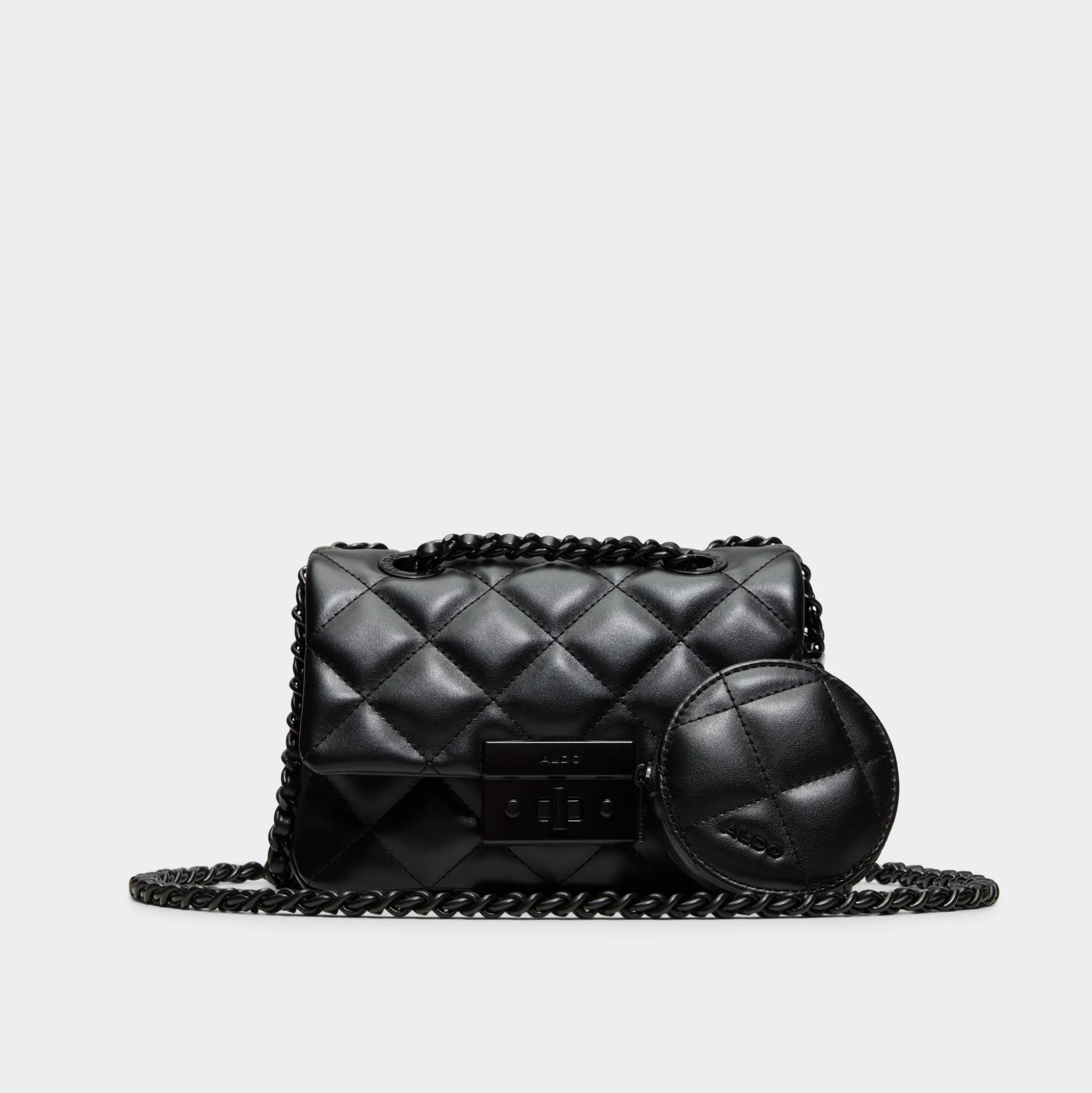 Glossy quilting meets stealthy chain links, delivering rebellious polish as a snap-off mini coin purse clips onto the flap-front crossbody, keeping small spends close and nights moving smoothly through crowded streets and moonlit venues tonight. Carry it with a slip dress for cocktail rooftops, or sling it with denim for off-duty errands, finishing the look with a subtle, rebellious finish.
