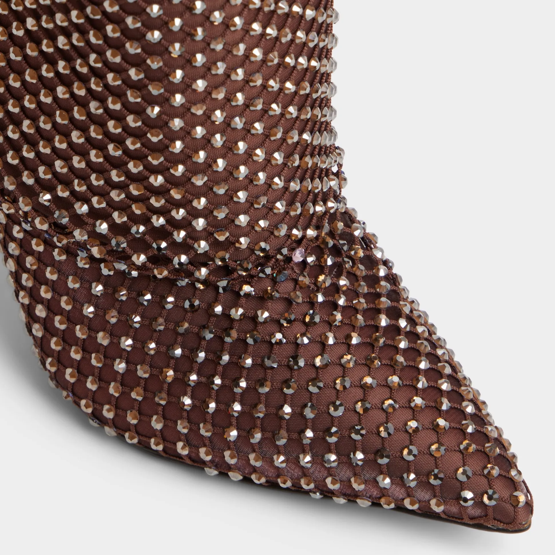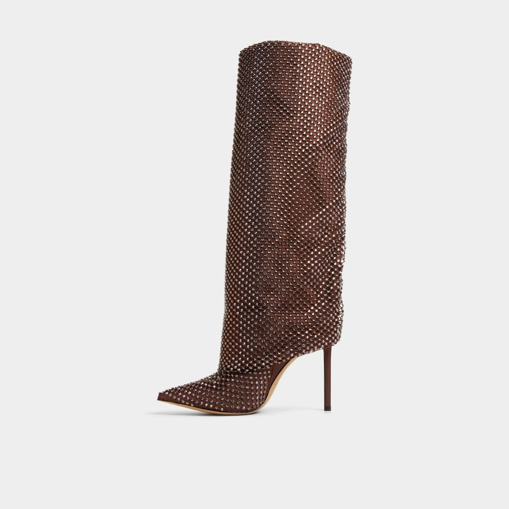 Mocha-toned crystals cascade along the knee-high silhouette, turning these boots into a midnight skyline on your feet, while sleek lines and a sculpted heel promise fierce, fluid nights from first glance to last call. Pair with a mini for cocktail premieres, or tuck into skinny denim for late-set gigs that own the room.