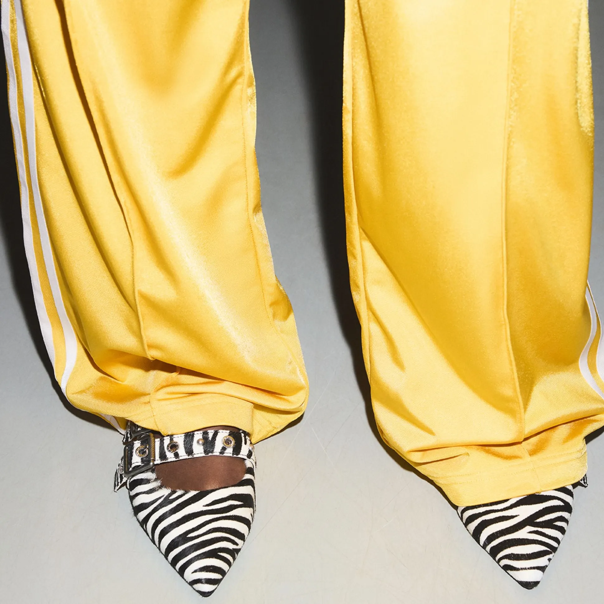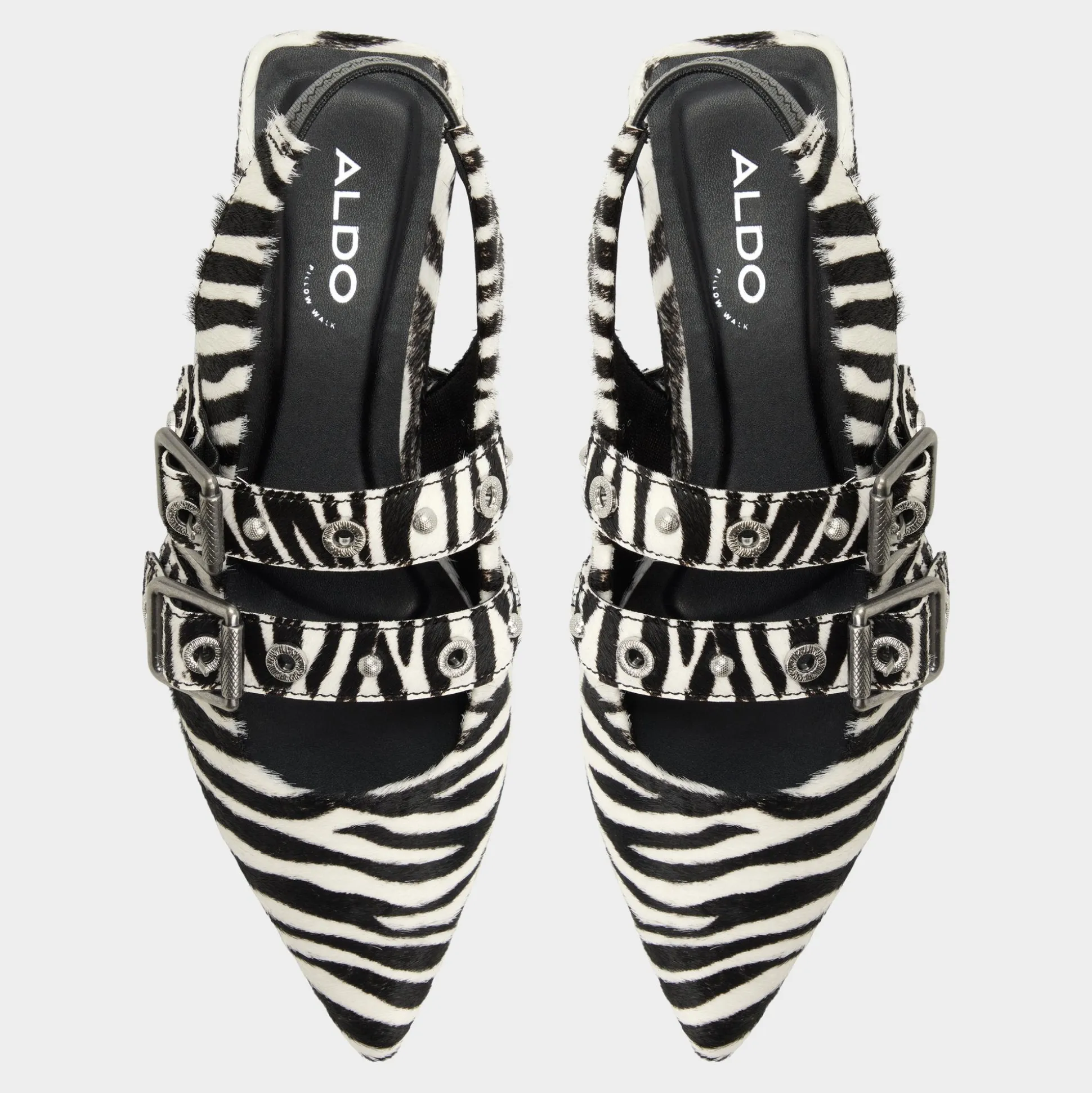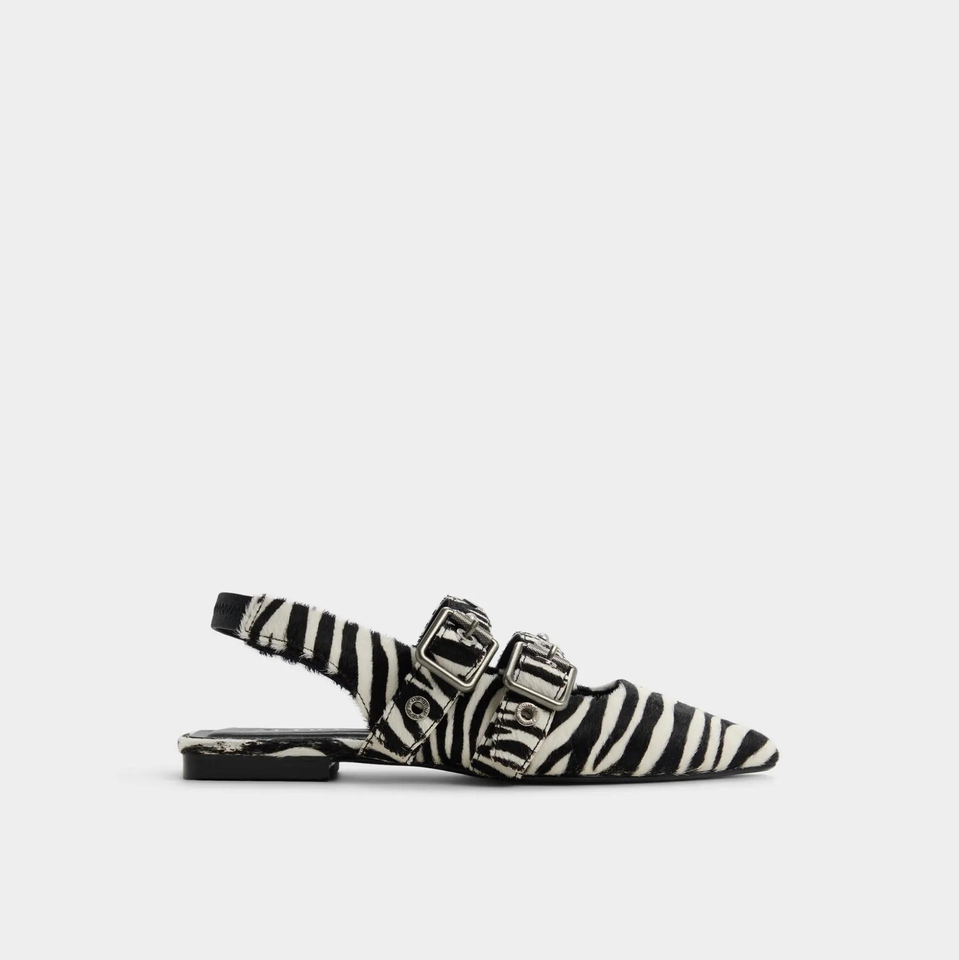 Wild zebra stripes in soft faux fur meet two polished buckles on this pointy slingback, turning the classic flat into a conversation starter that walks easy from sidewalk huddles to after-dark detours. Pair with cropped black denim for midday brainstorms, or ground a satin slip dress when gallery openings blur into midnight ramen.
