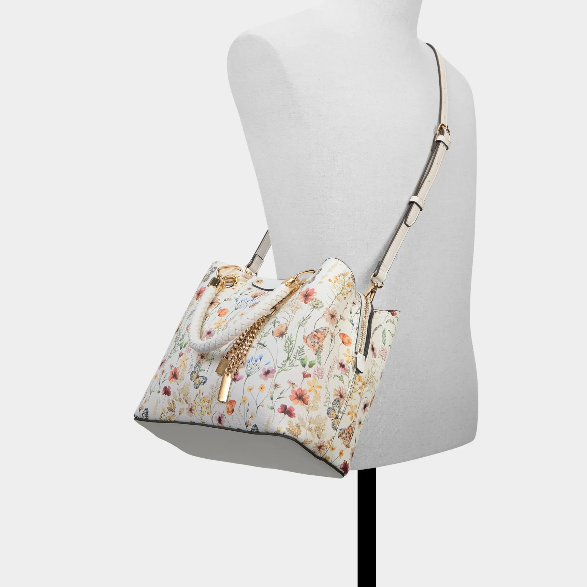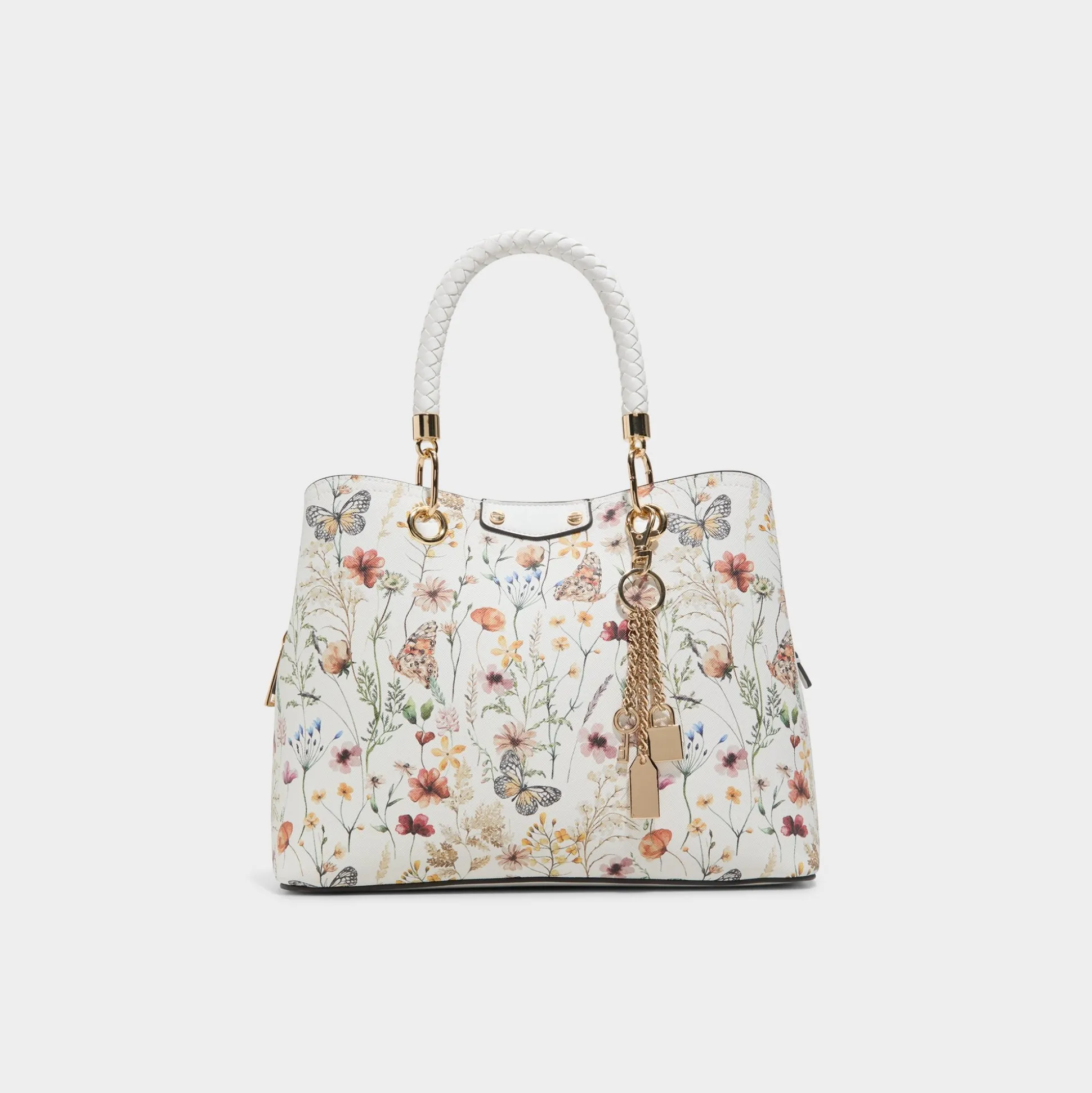 Wildflower illustrations crown this structured tote, where woven handles meet gleaming gold key-fob accents for a visually dominant accent that shifts everyday practicality into a statement piece you carry with ease. Carry it with a pastel suit for office coffee runs, or sling it over a sundress for weekend market strolls, letting the floral print finish the look.