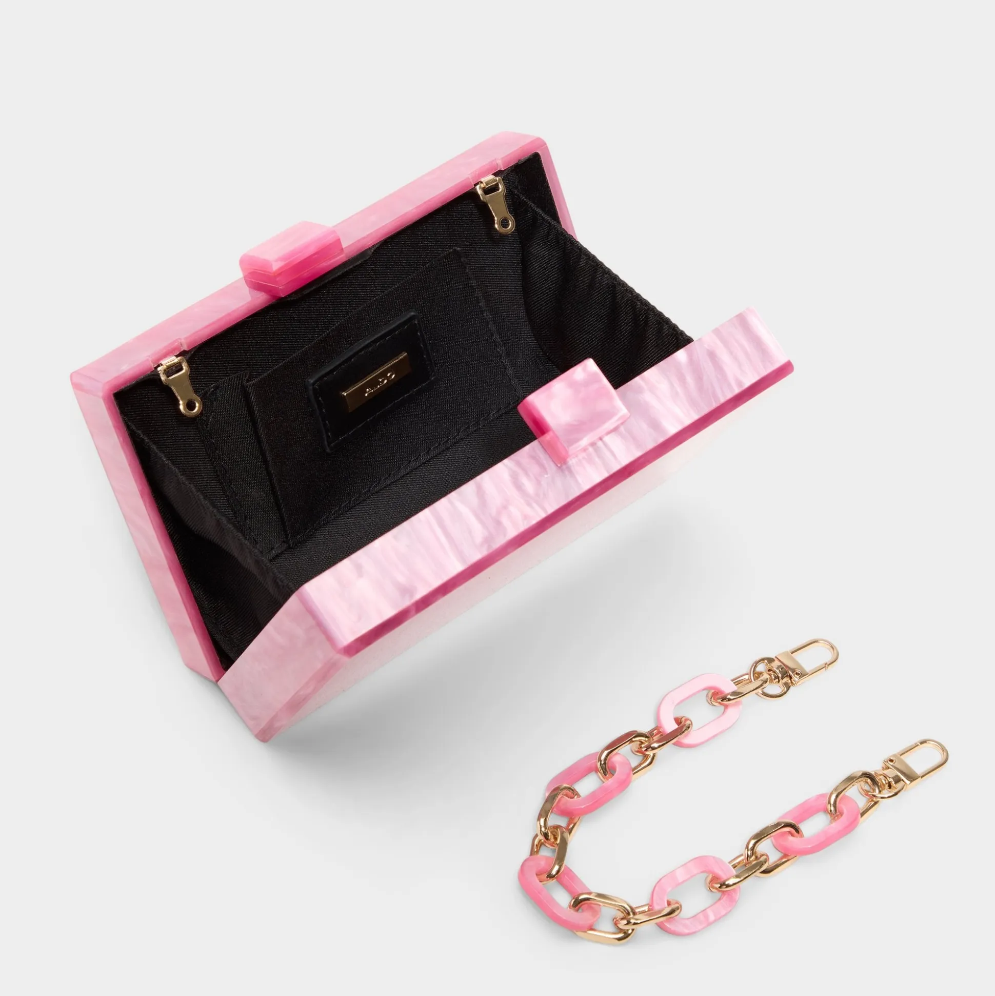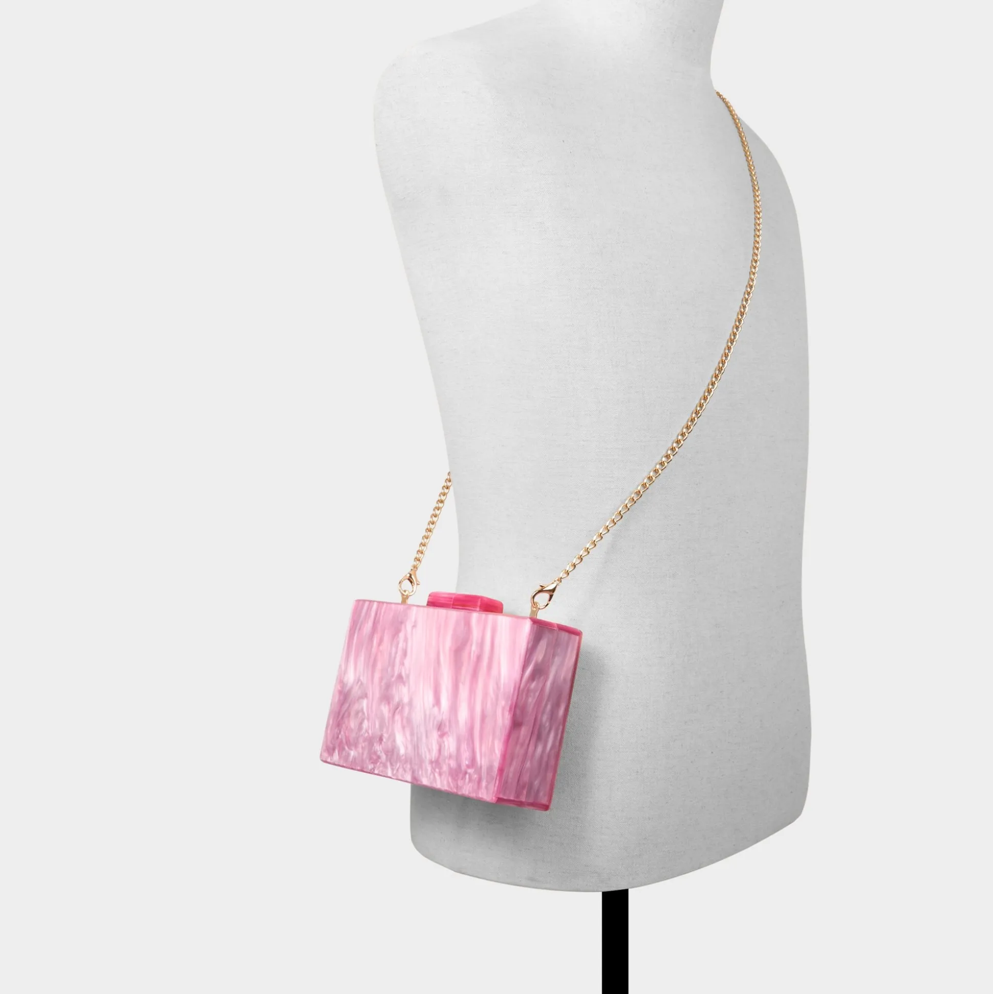 Pearly pink marbling swirls through glossy resin in this boxy clutch, transforming into after-dark jewelry and catching light at every corner, elevating evenings with a soft, wearable glow. Tuck under silk slips at weddings or pair with ripped denim on rooftop nights, letting the clutch finish the look with effortless glamour.
