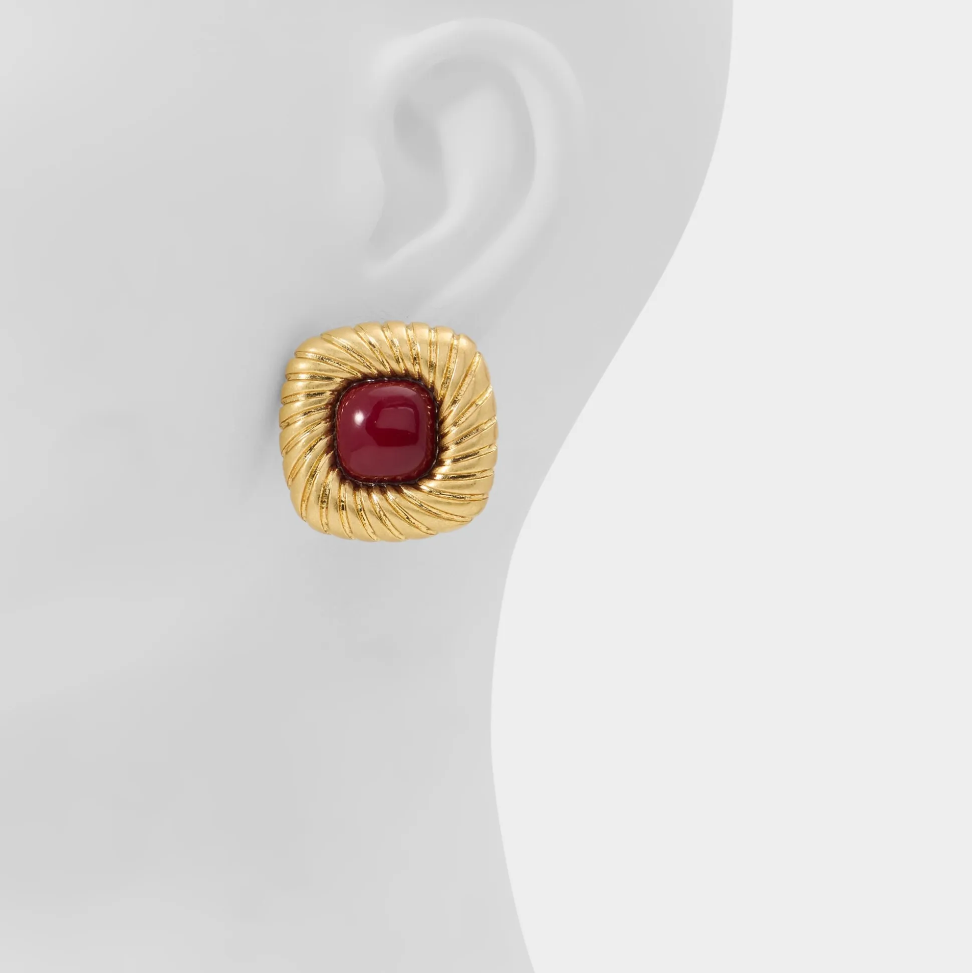 A coiled metal square cradles wine-red cabochons, elevating clip-ons with an edge that catches light from coffee runs to city nights. Pair them with a slip dress for sunset shine, or frame a blazer-and-jeans brunch look with a touch of vintage glam.