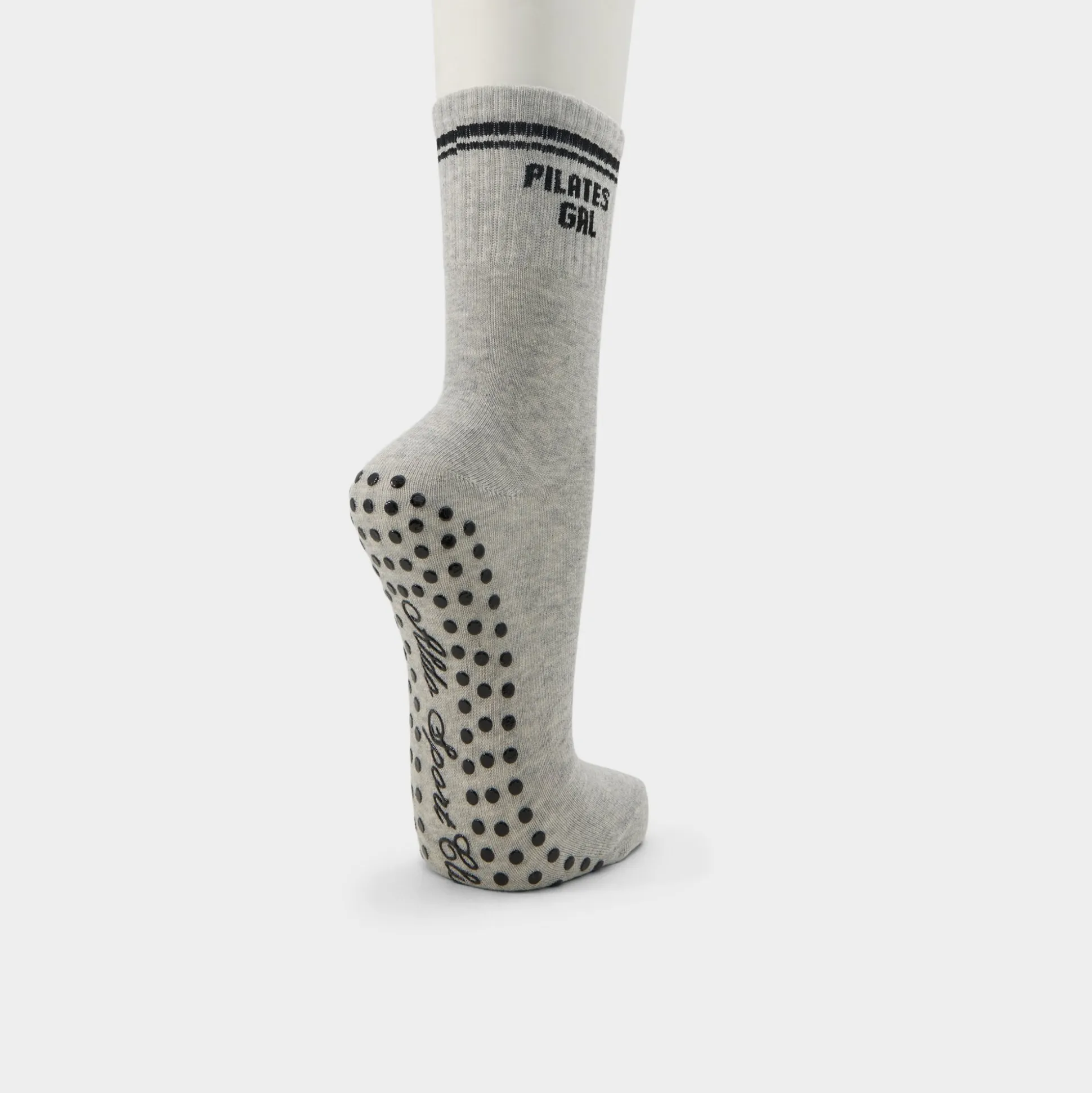 Mismatched cotton crew socks wink with bold slogans—“SPORTYISH” meets “PILATES GAL”—and a polka-dot grip sole that keeps every stride steady from studio sprints to campus errands. Layer them with leggings for gym or coffee runs, or let them peek above sneakers to finish the look.