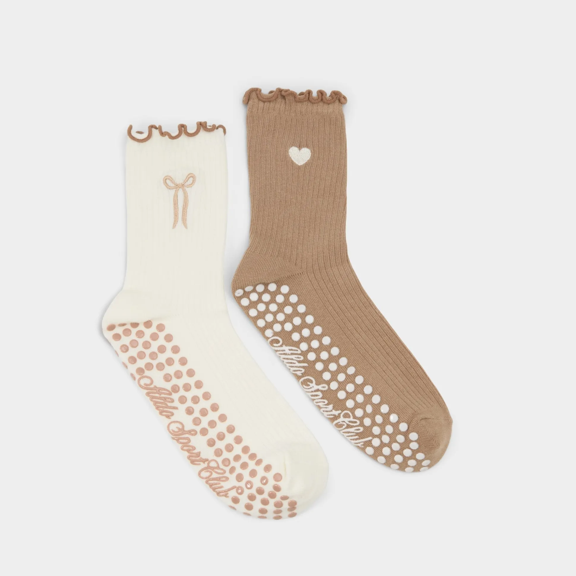 Ruffled lettuce cuffs frame playful embroidery of hearts and bows on a sport-ready silhouette, while silicone dot grips underfoot keep every plié steady. Layer them with a cropped hoodie for gym-to-street, or top with a denim jacket for weekend errands.