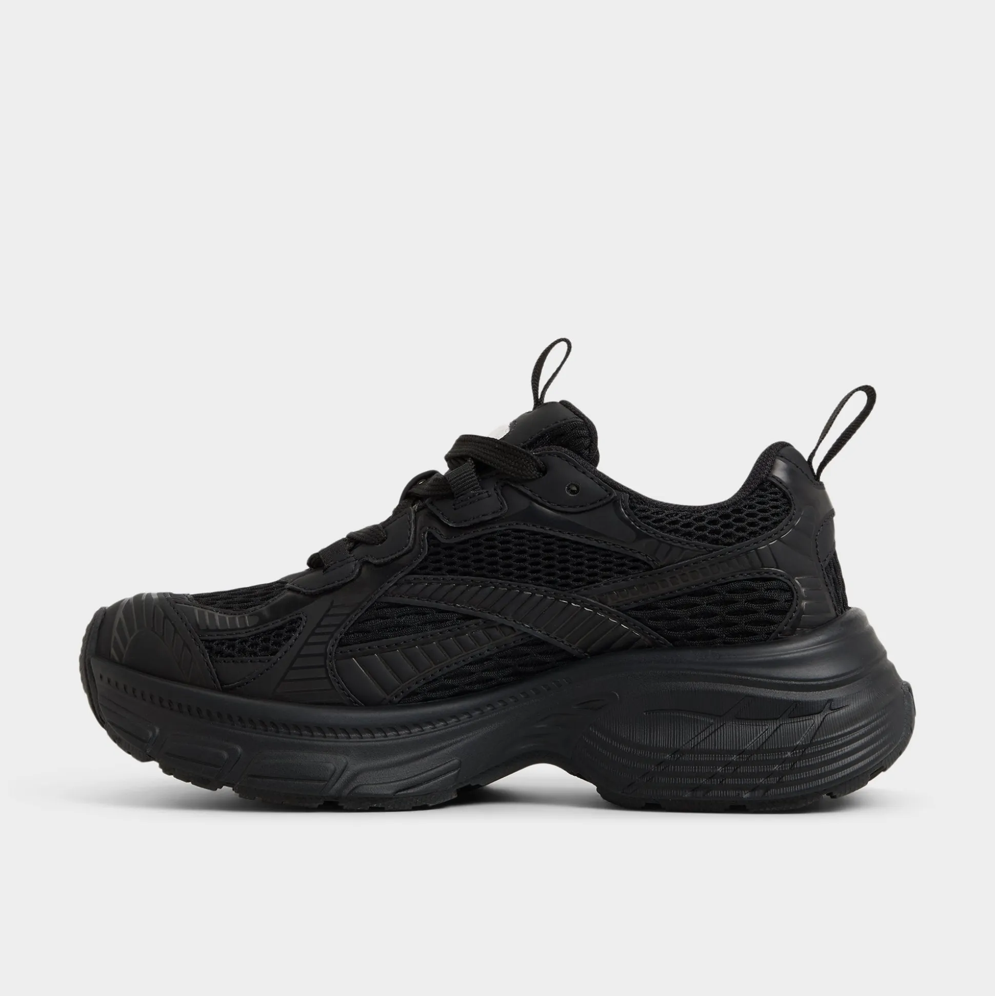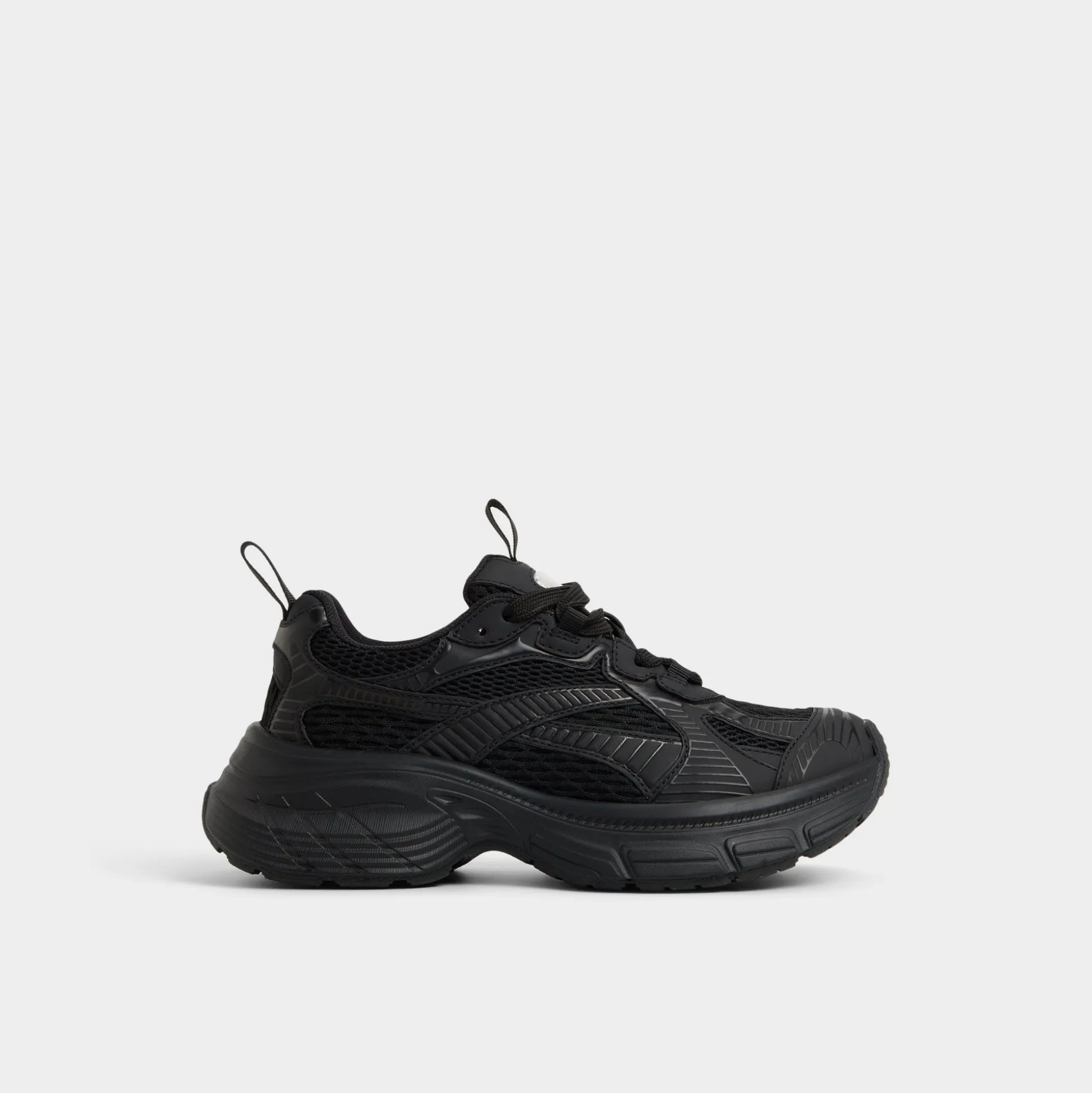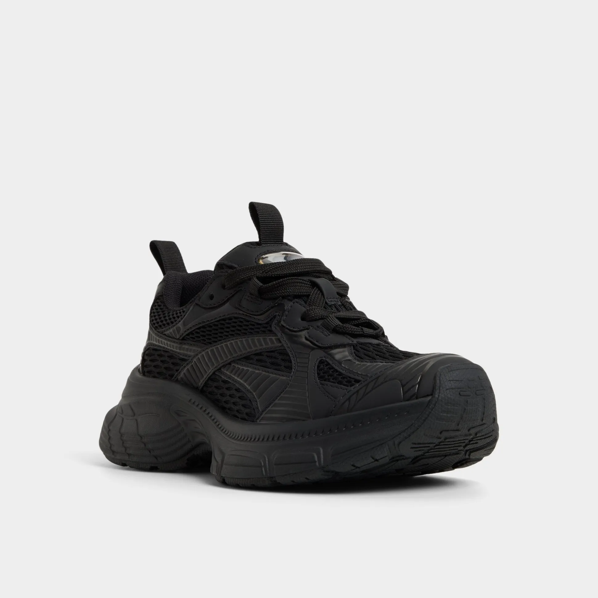 Mega-sculpted jogger sole elevates this black-on-black sneaker, while textured mesh keeps breathability high from morning playlists to evening strolls, delivering confident steps all day. Pair with bike shorts for coffee runs, or ground a satin slip skirt when post-work gatherings call for comfort.