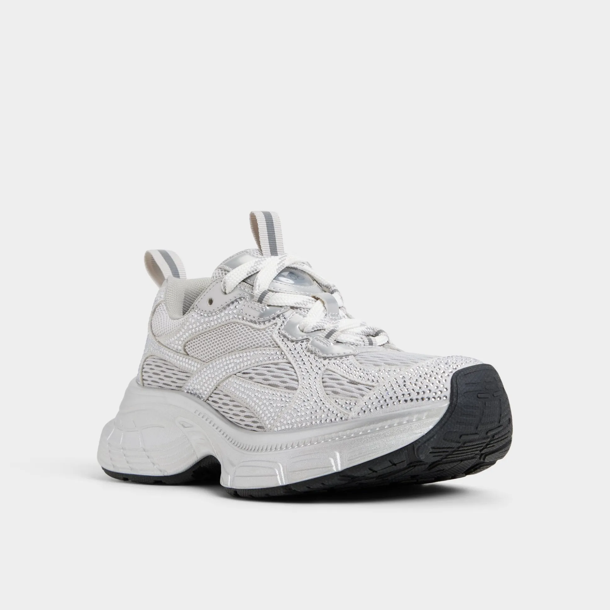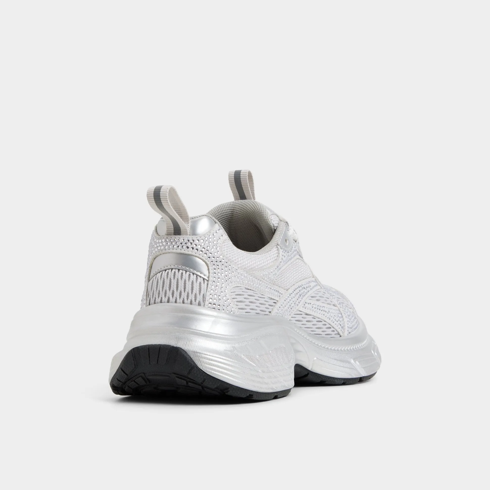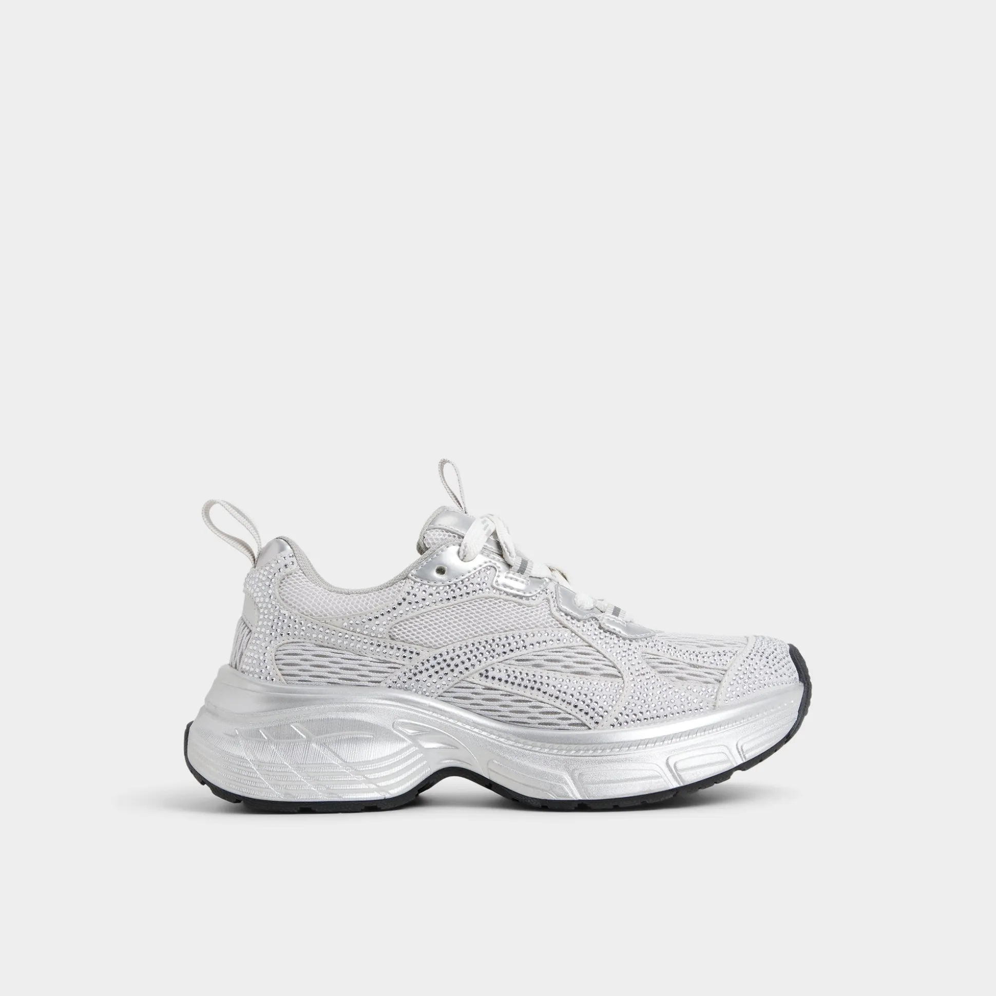 Shimmering silver mesh meets smooth overlays atop a lofty jogger sole, delivering cool, cloud-soft comfort that keeps every step light and awake as the world hums with possibilities. Pair with bike shorts for caffeine jaunts, or ground under a slip dress as festivals call carefree moves.
