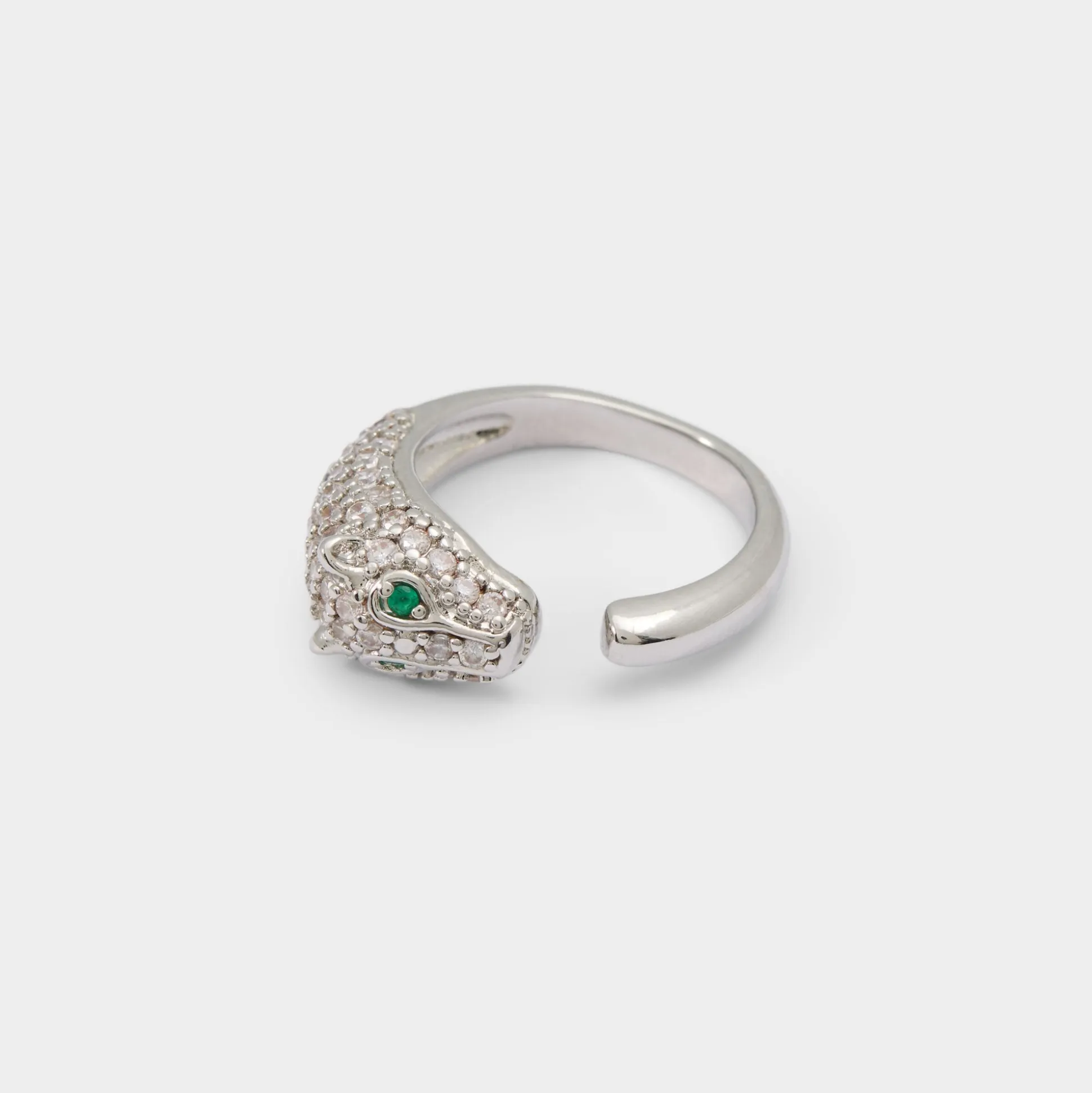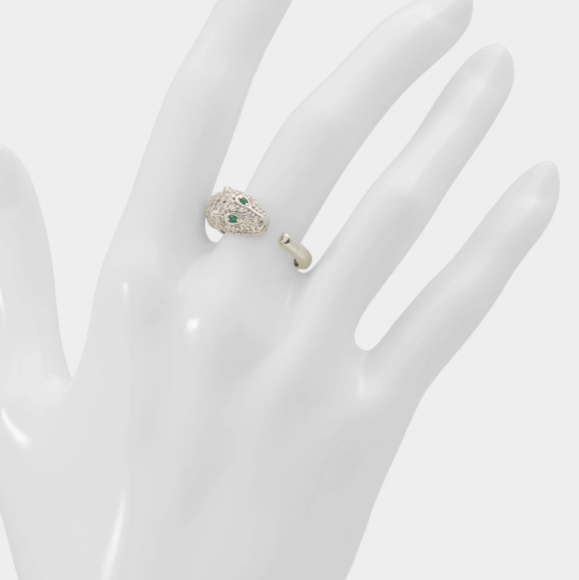 Pave-set feline head wraps the finger in an open band, its emerald-green eye and shimmering crystals lending quiet power and night-light sparkle in one daring move. Stack it beside silver rings for rooftop cocktails or let it solo against a black slip dress at gallery nights, sealing looks with confidence.