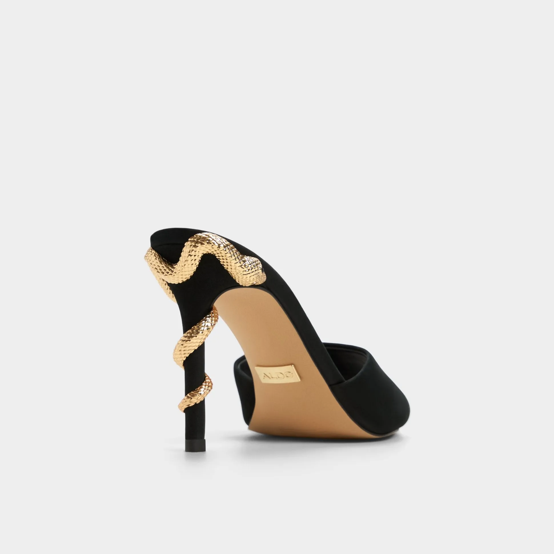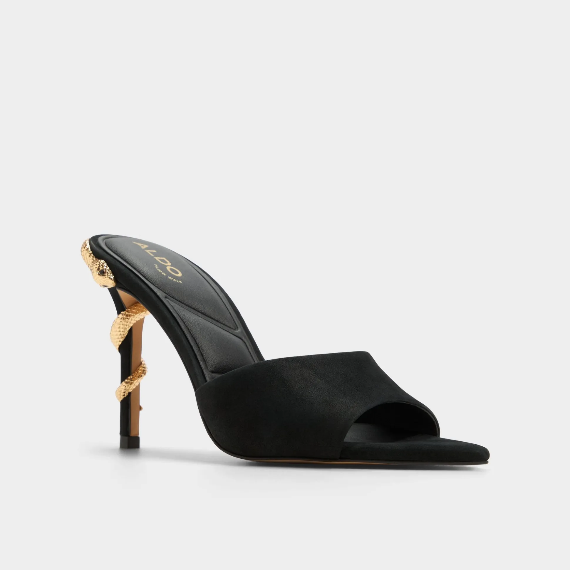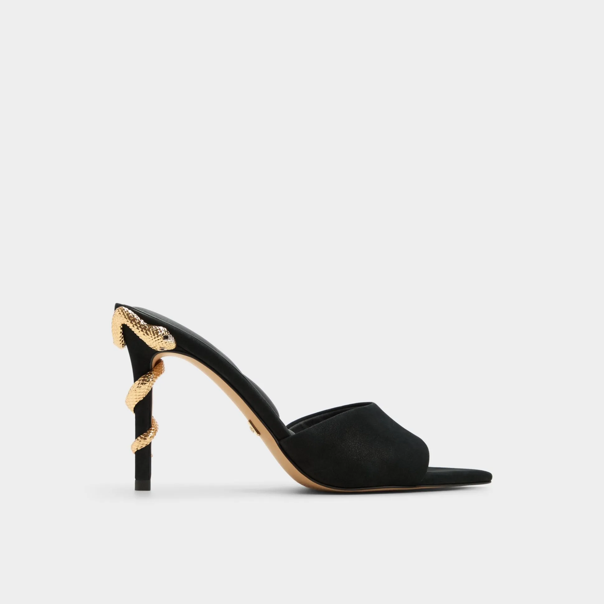 Gleaming serpent hardware coils around supple black suede stilettos, turning a classic silhouette into a mythic statement with smooth lining and a confident, leg-lengthening lift. Pair with tailored pants for gallery nights, or slip beneath a velvet midi for rooftop nights when city lights glow.