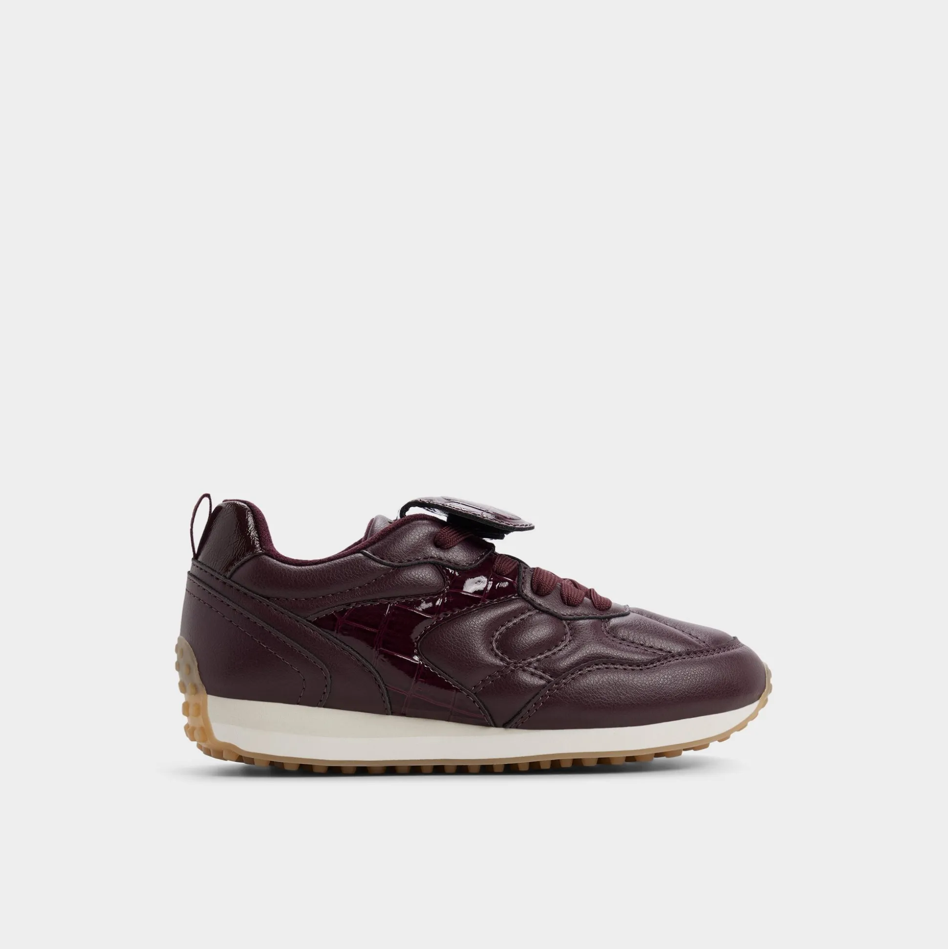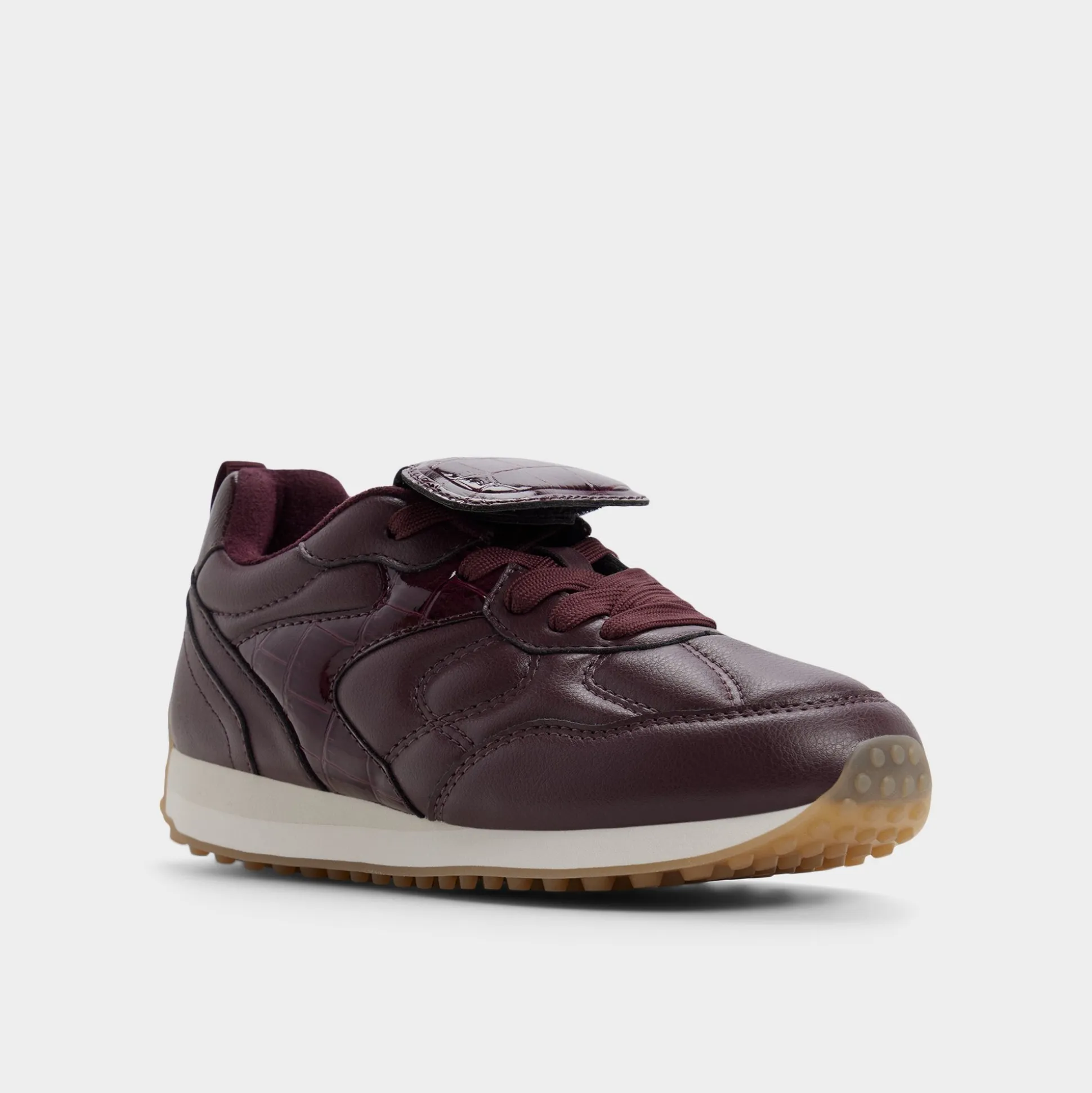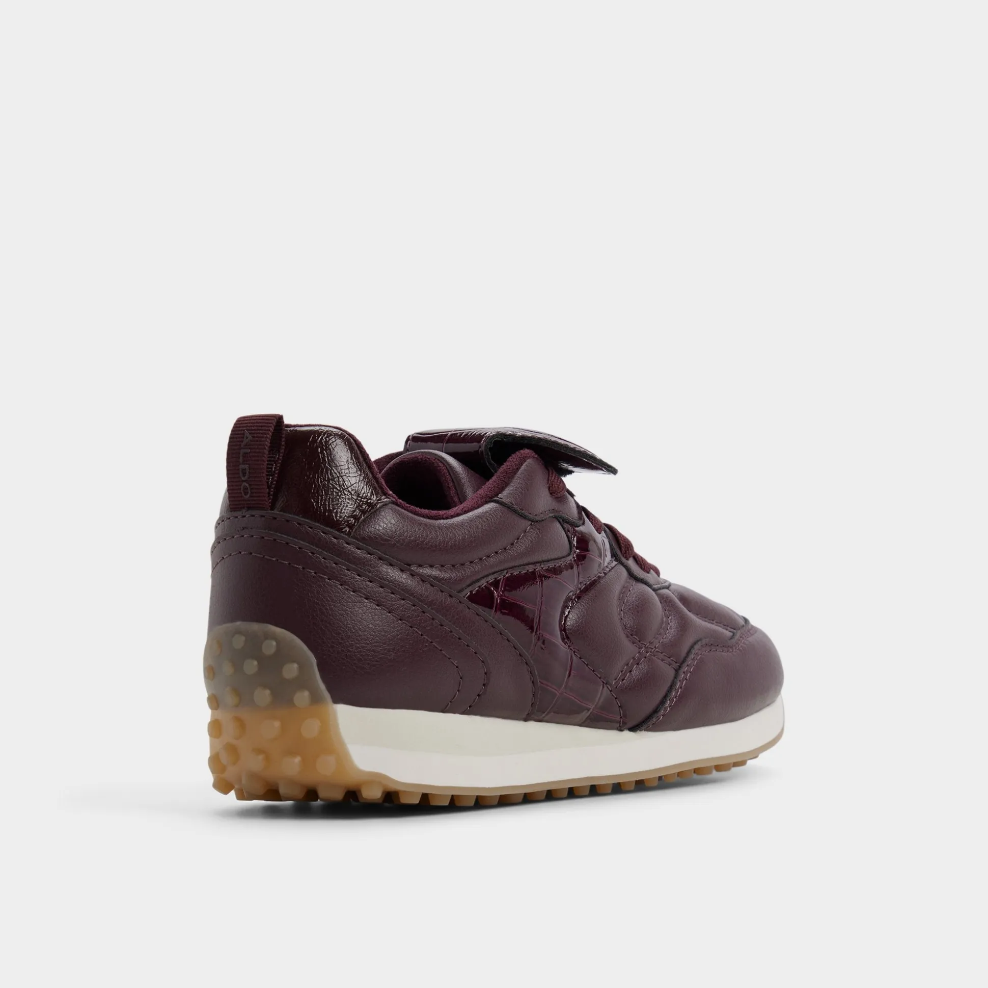 Deep merlot leather drapes quilted curves with croc-patent flashes, while a lace-and-Velcro closure delivers quick, secure comfort from morning errands to gallery-hopping nights, with a confident stride on crowded sidewalks. Pair with cropped denim for art crawls, or slip beneath a satin midi for cocktail hours.
