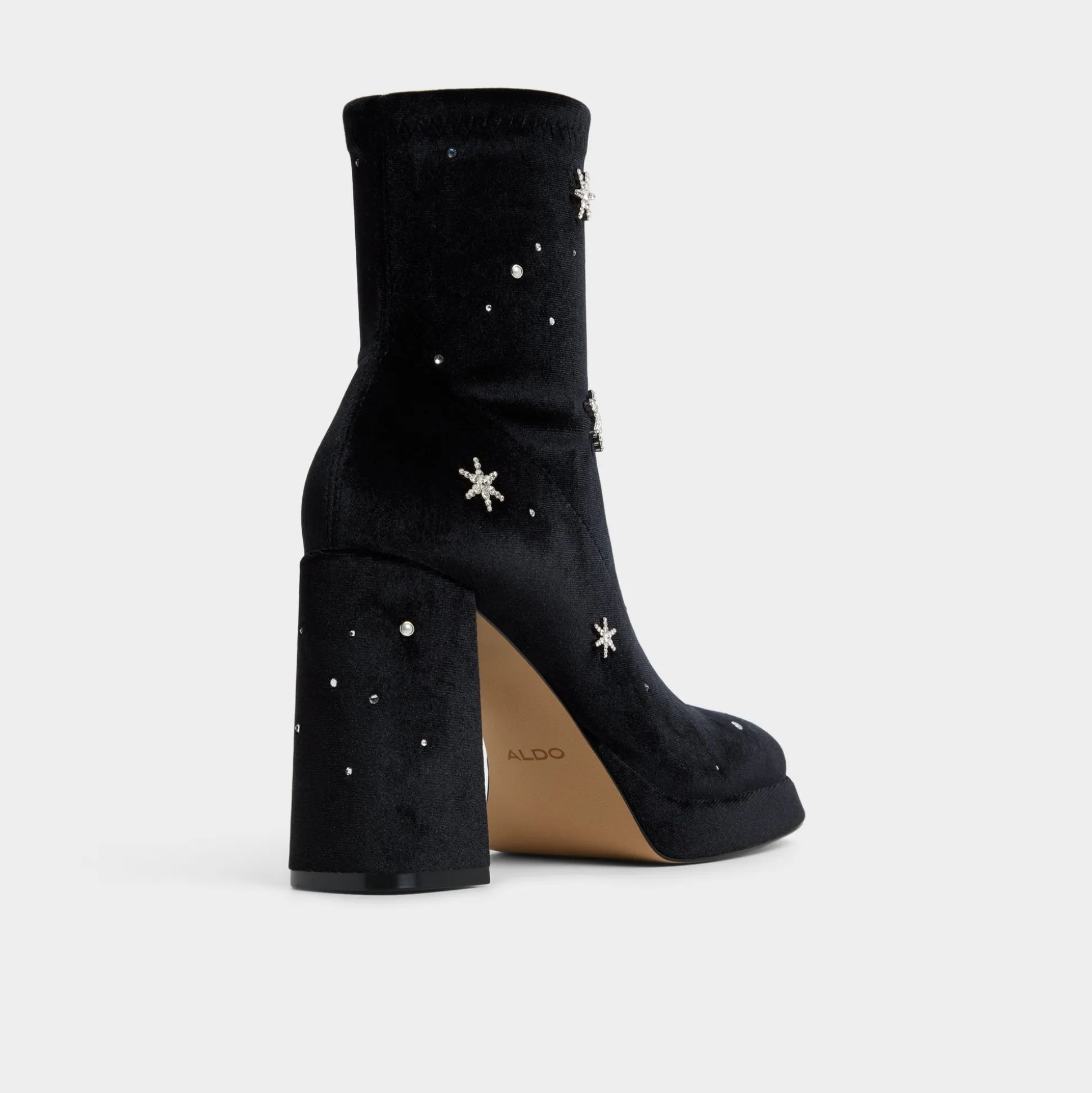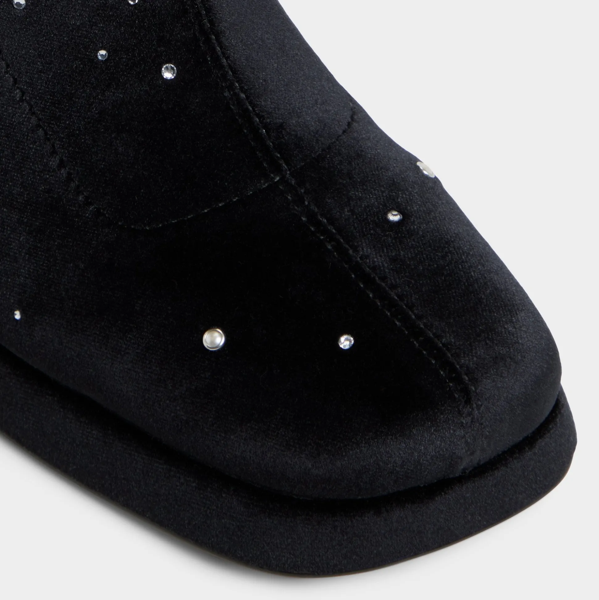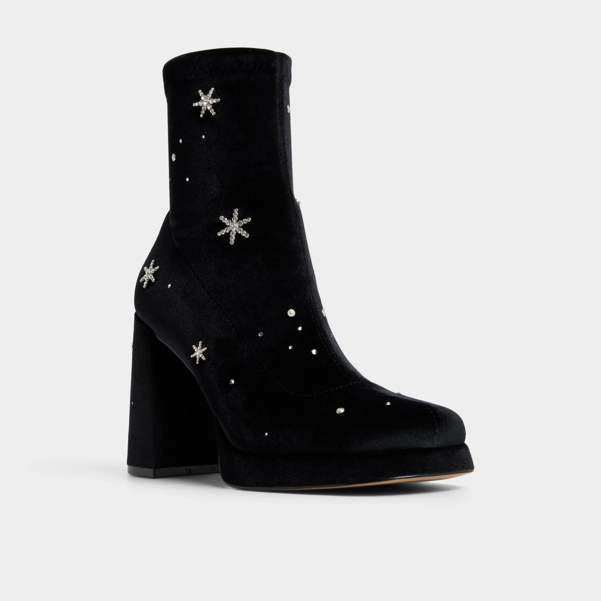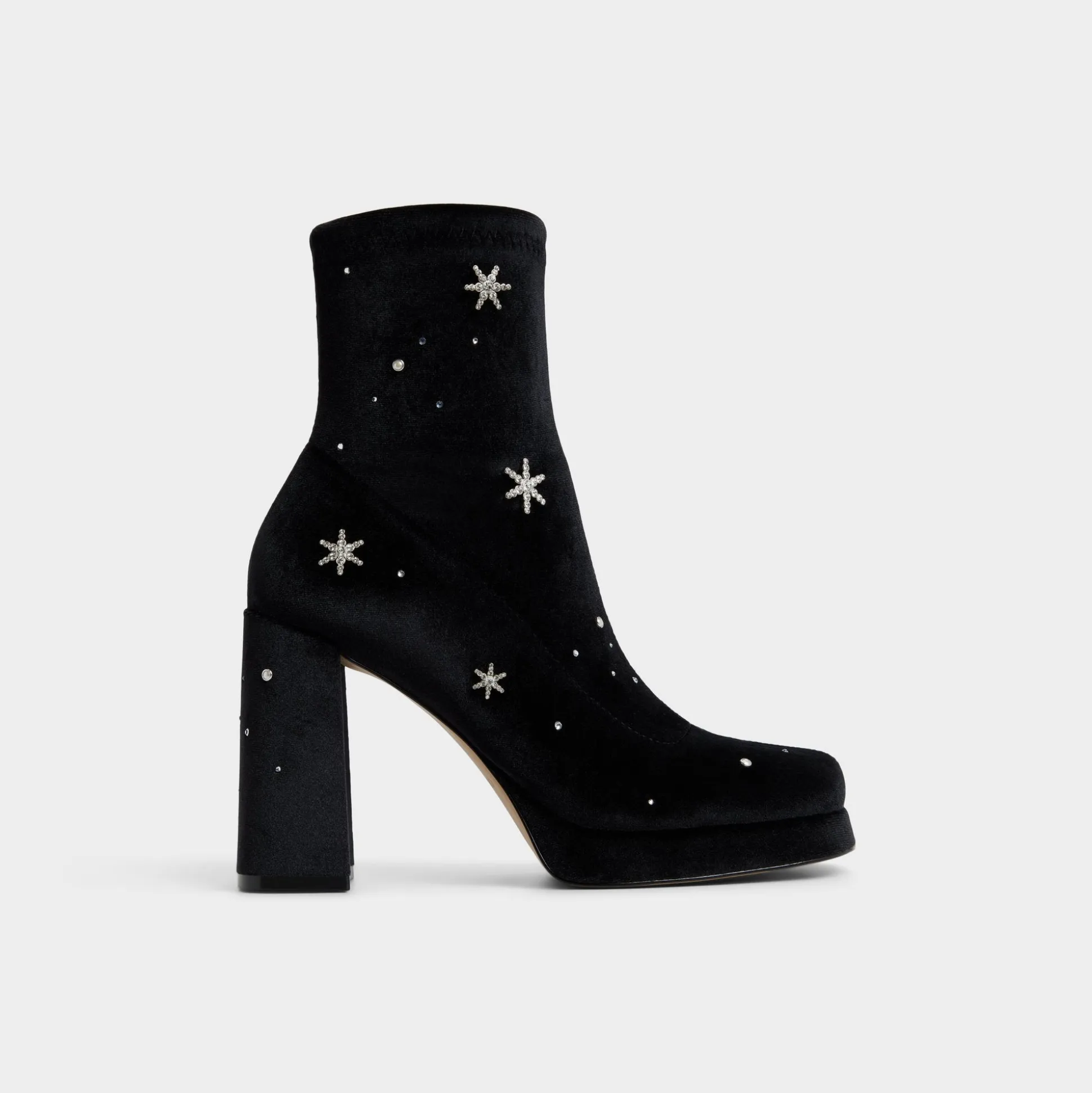 Velvety black suede becomes its own night sky, speckled with rhinestones, while a confident block heel and easy platform anchor every step, keeping evenings polished and steady from gallery openings to rooftop strolls. Pair with a little black dress for cocktails, or swap to tailored trousers for city nights.