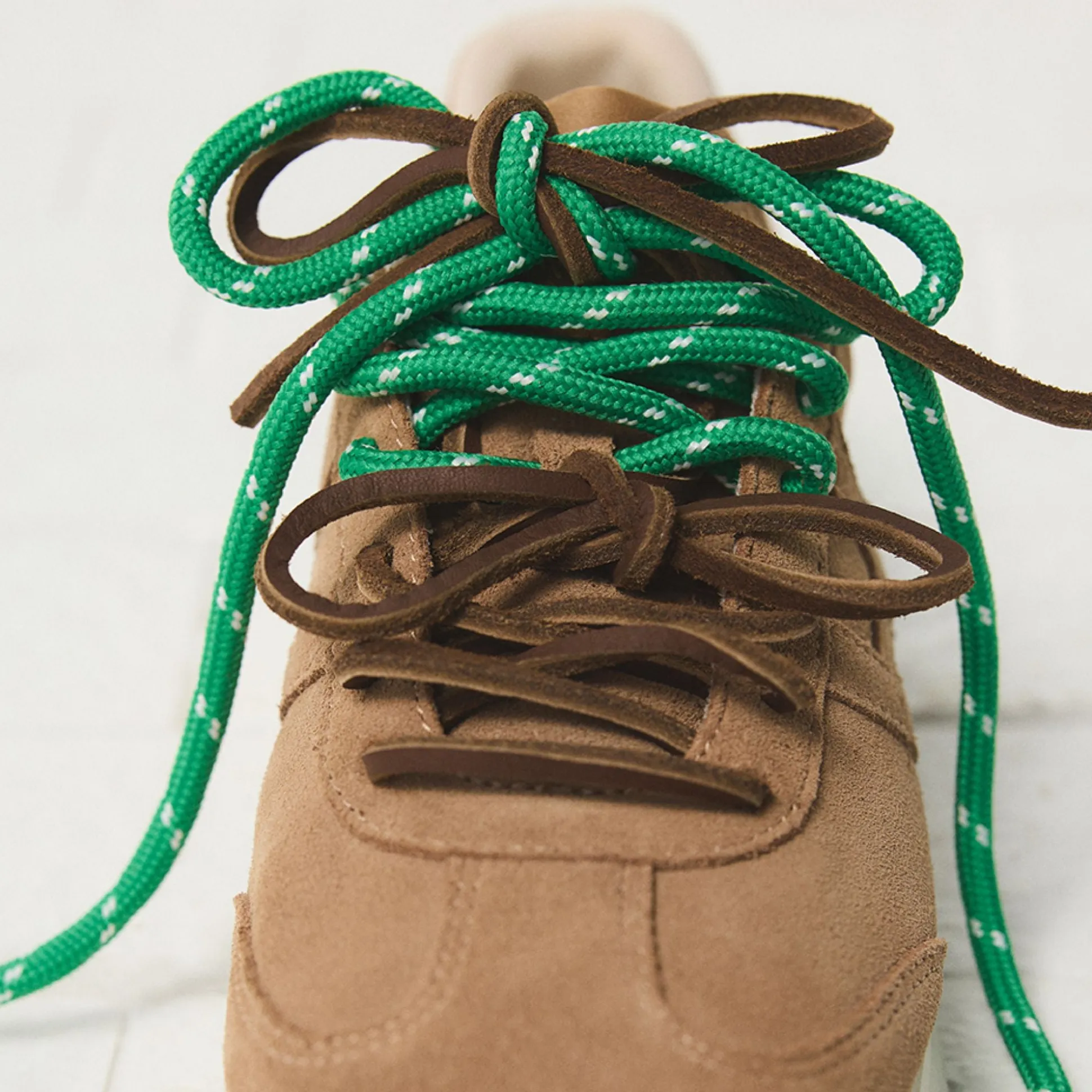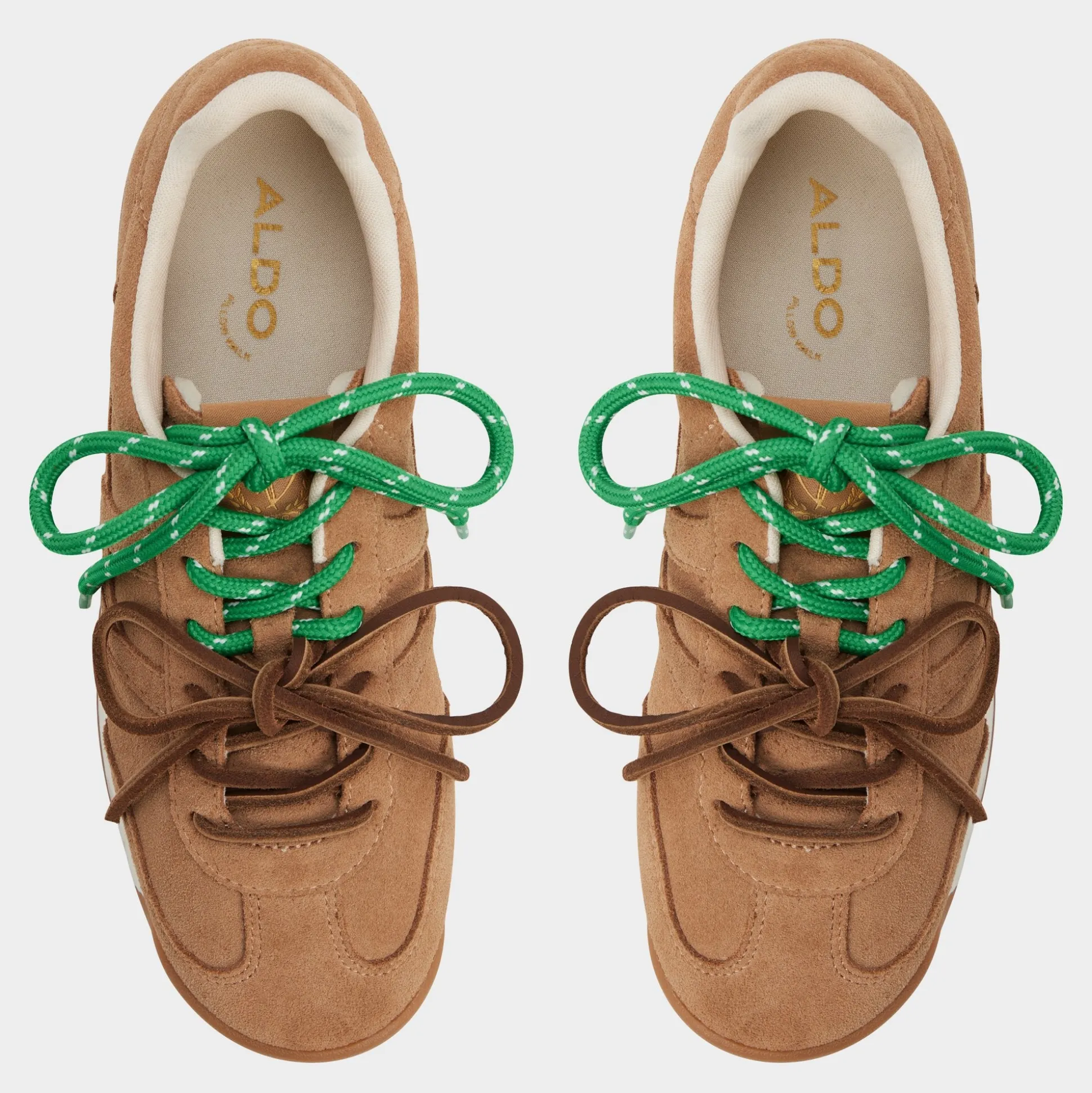 Soft suede meets retro jogger sole in low-profile sneaker swapping standard laces playfully-earthy brown & fresh green-for low-key spontaneity shouts each step feels like detours calling out! Cropped cargos weekend markets ground satin skirts study breaks photo walks!