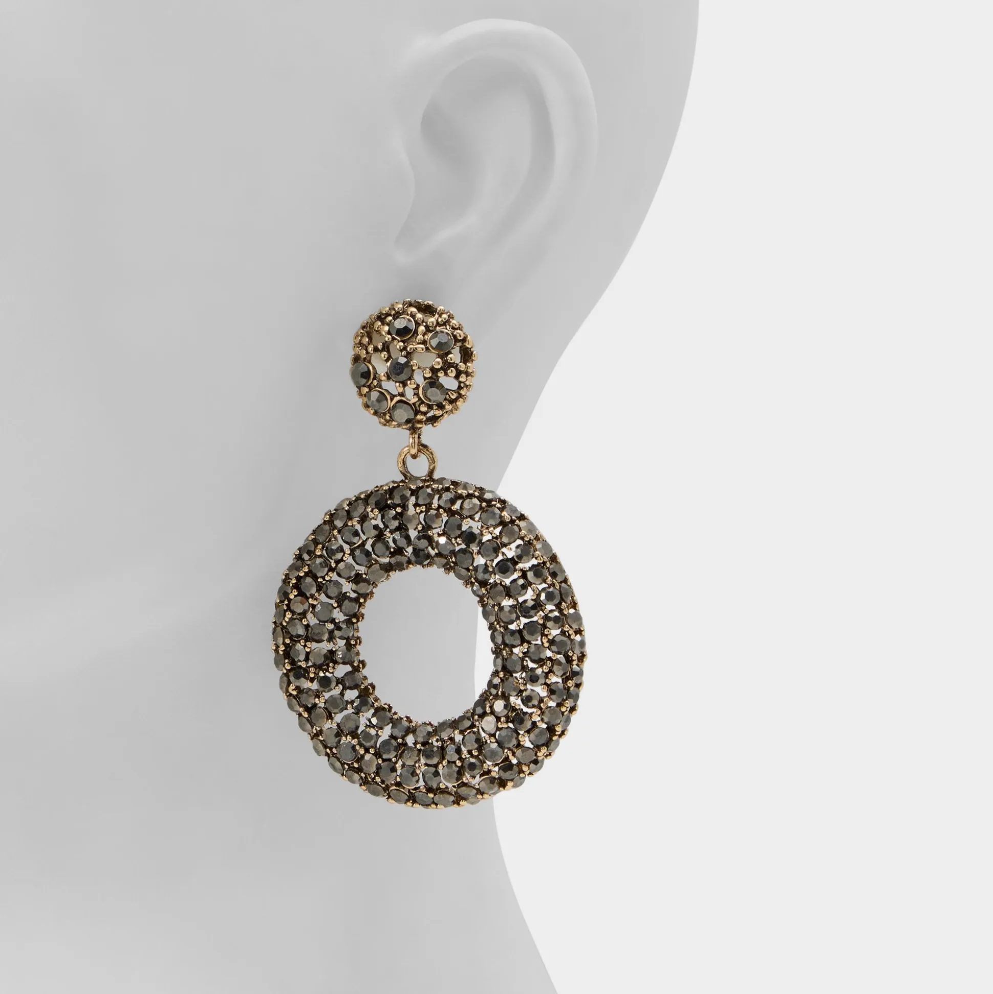 Gunmetal crystals cloak circles that dangle from studs, turning these earrings into glittering halos that shine in low light. Wear with a slip dress at rooftop gatherings, or pair with ear cuffs and a blazer for gallery nights, and let the glow finish every moment.