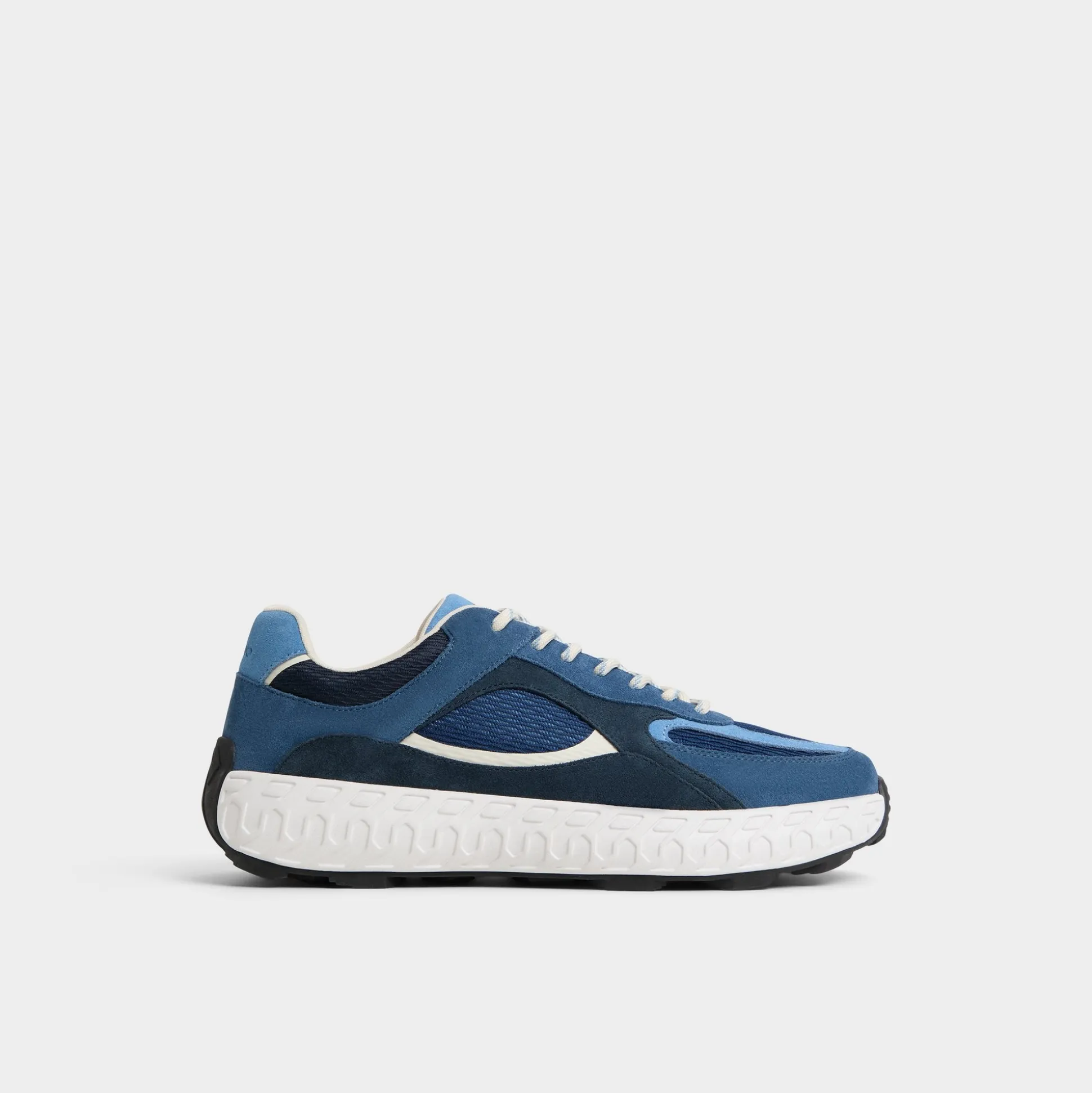 Wave-like sculpting along oversized jogger soles gives this blue suede mesh sneaker a bold silhouette, while airy cushioning keeps everyday steps steady for long days and breezy city strolls. Pair it with tapered denim for coffee runs, or roll with linen shorts for weekend getaways.