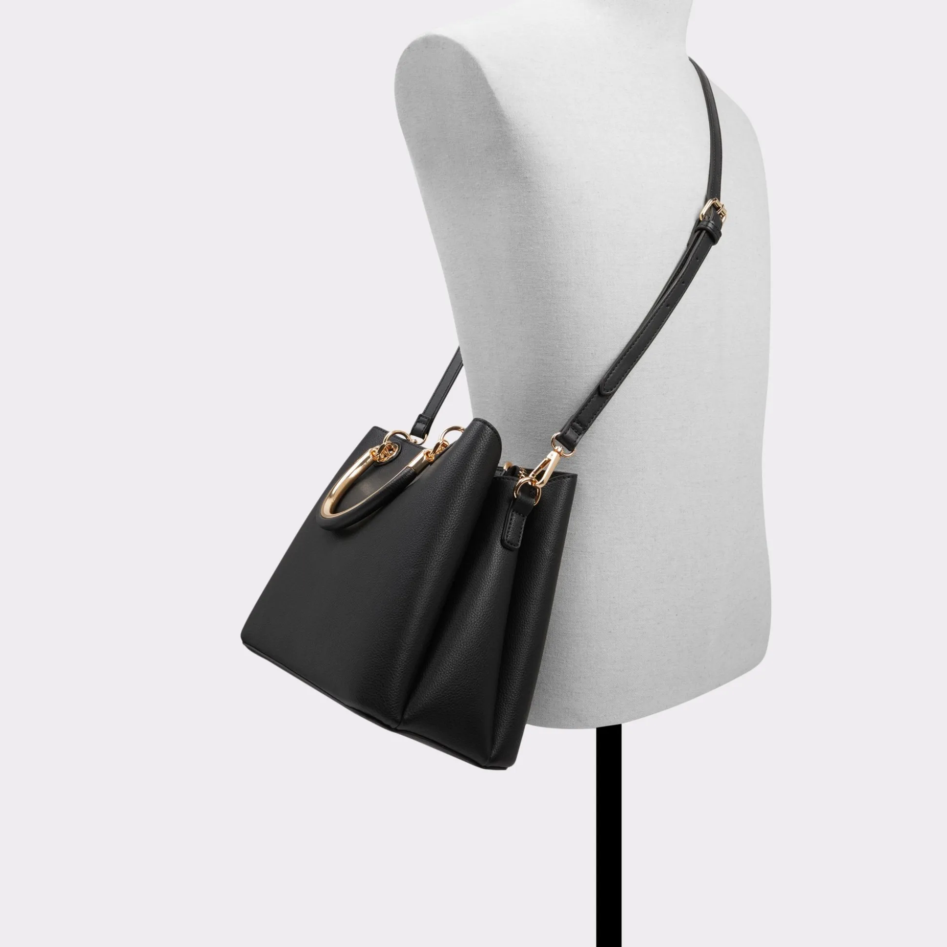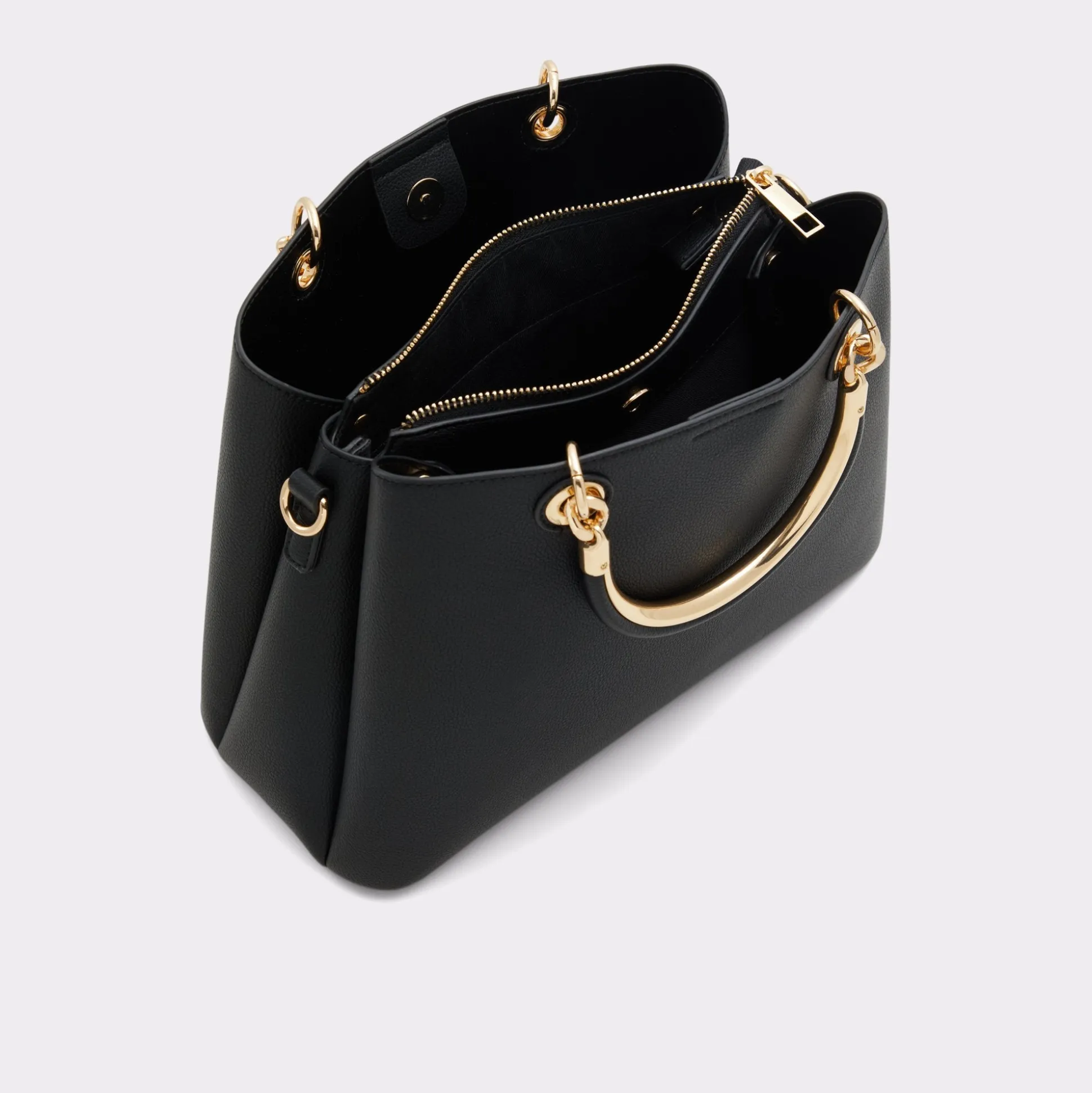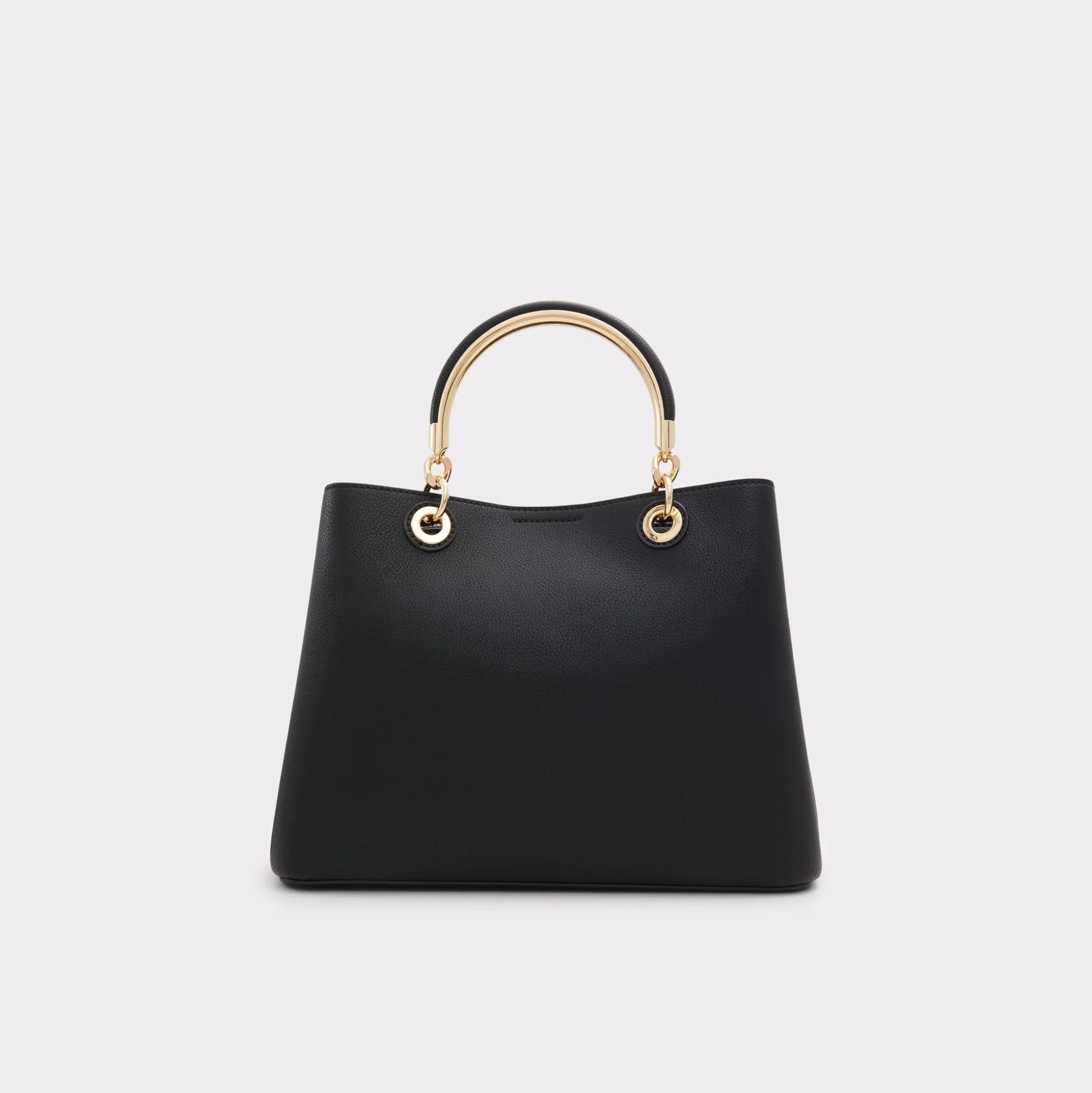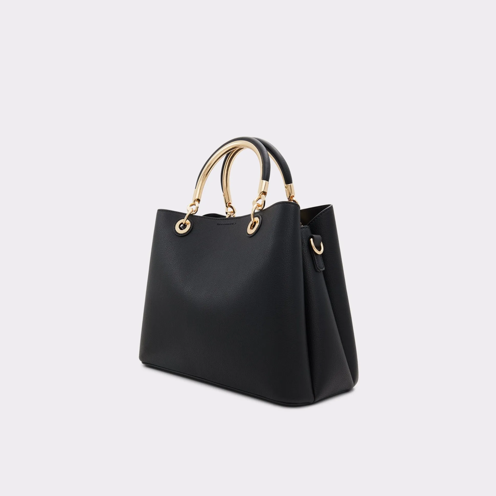 Polished arc handles flash like modern jewelry against pebble-grain black leather, giving this structured top-handle bag understated power that moves smoothly from morning agendas to late-night plans thanks to its open design. Carry it with sharp blazer and denim for coffee catch-ups or sling it beside slip dress at evening events to finish the look.