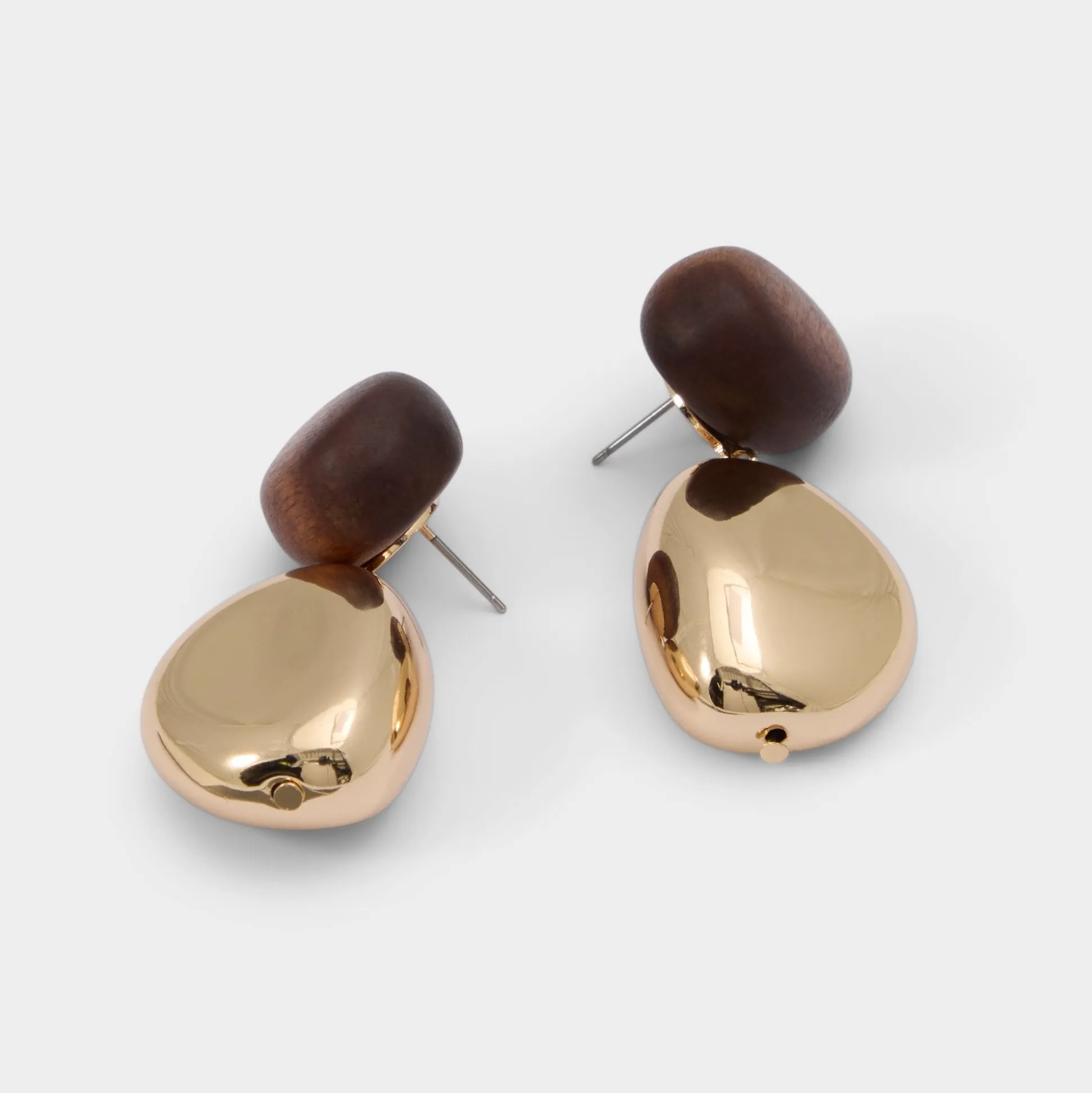 Ebony wood studs blend into asymmetrical gold droplets, crafting sculptural earrings that exude earthy-luxe vibes with bold, artful presence for day-to-night moments that tops dresses or frames denim. Layer them with a sleek blazer for cocktails or frame with a casual tee and jeans for everyday polish.
