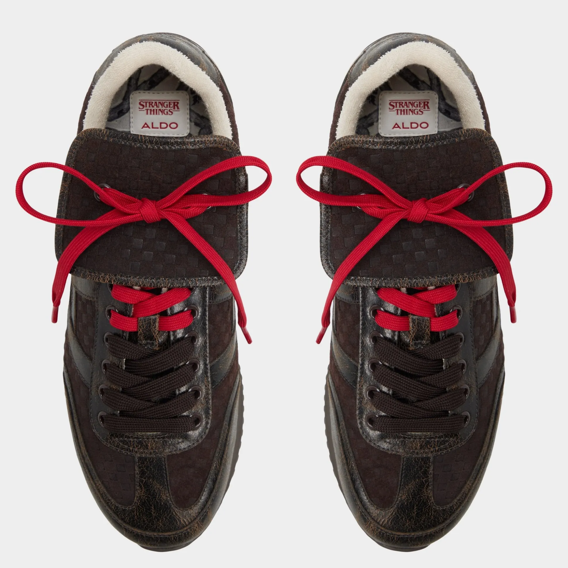Rally the troops and return to the Upside Down with these Stranger Things x ALDO distressed, waffle-embossed brown leather runners. The red hang tag, terry cloth lining, and Hawkins tunnels on the sock plunge you deeper into the Stranger universe. And hidden on the tongue is an all-important reminder: Friends don’t lie.